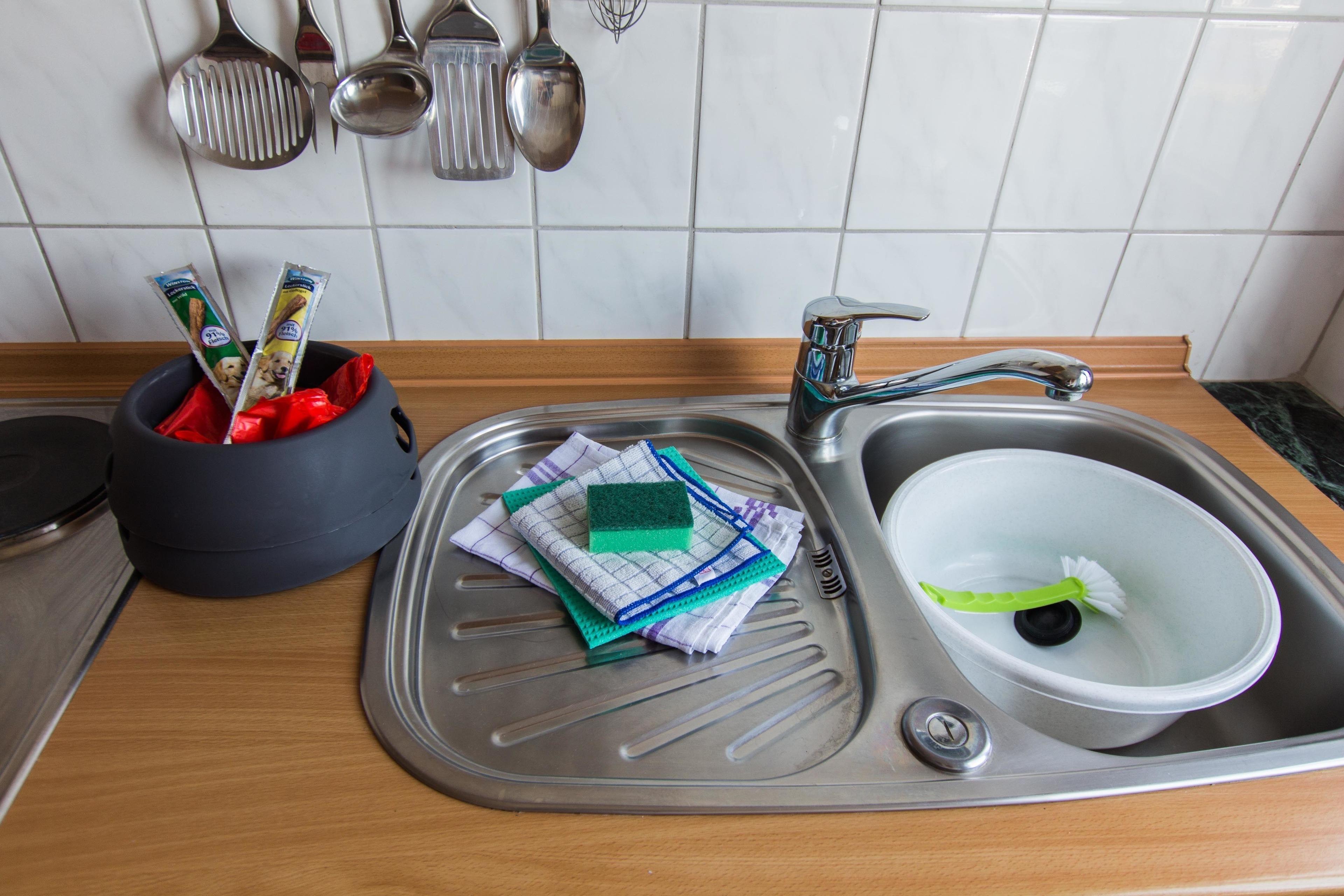Küche mit voller Ausstattung incl. Mikrowelle und Backofen, Hochstuhl optional zustellbar.