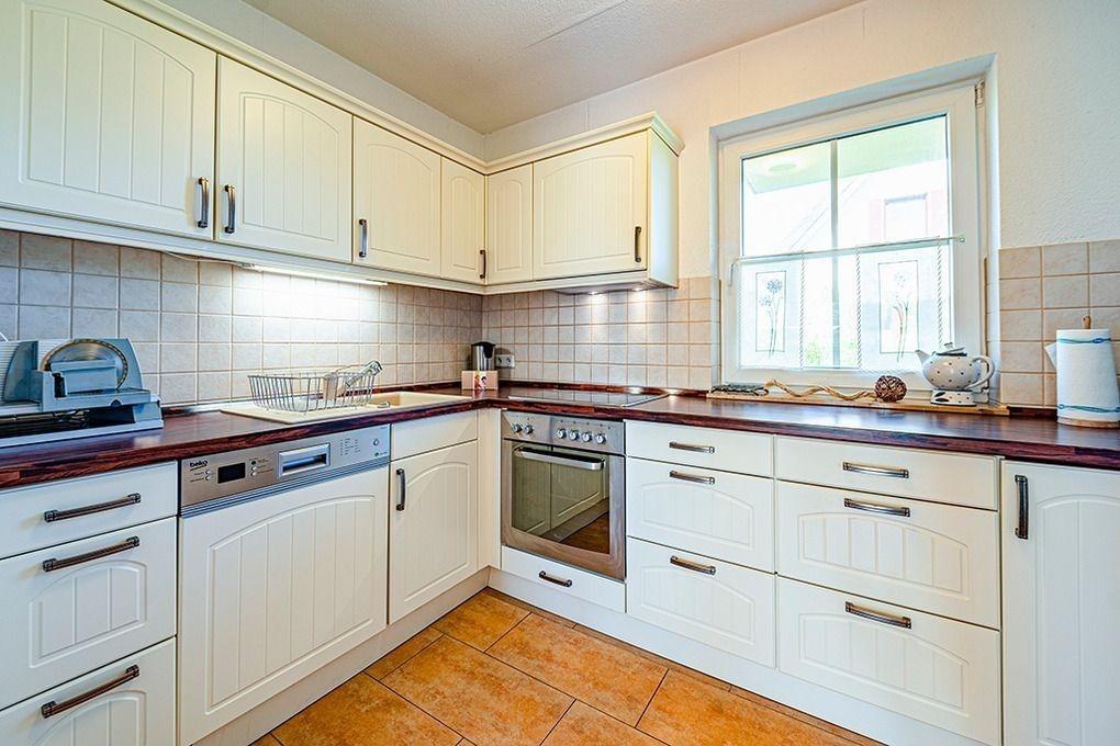 Küche mit E-Herd, Backrohr, Kühlschrank, Kaffevollautomat, Mikrowelle, Toaster, Wasserkocher, Waffeleisen und umfangreiches Sortiment an Geschirr und Besteck.