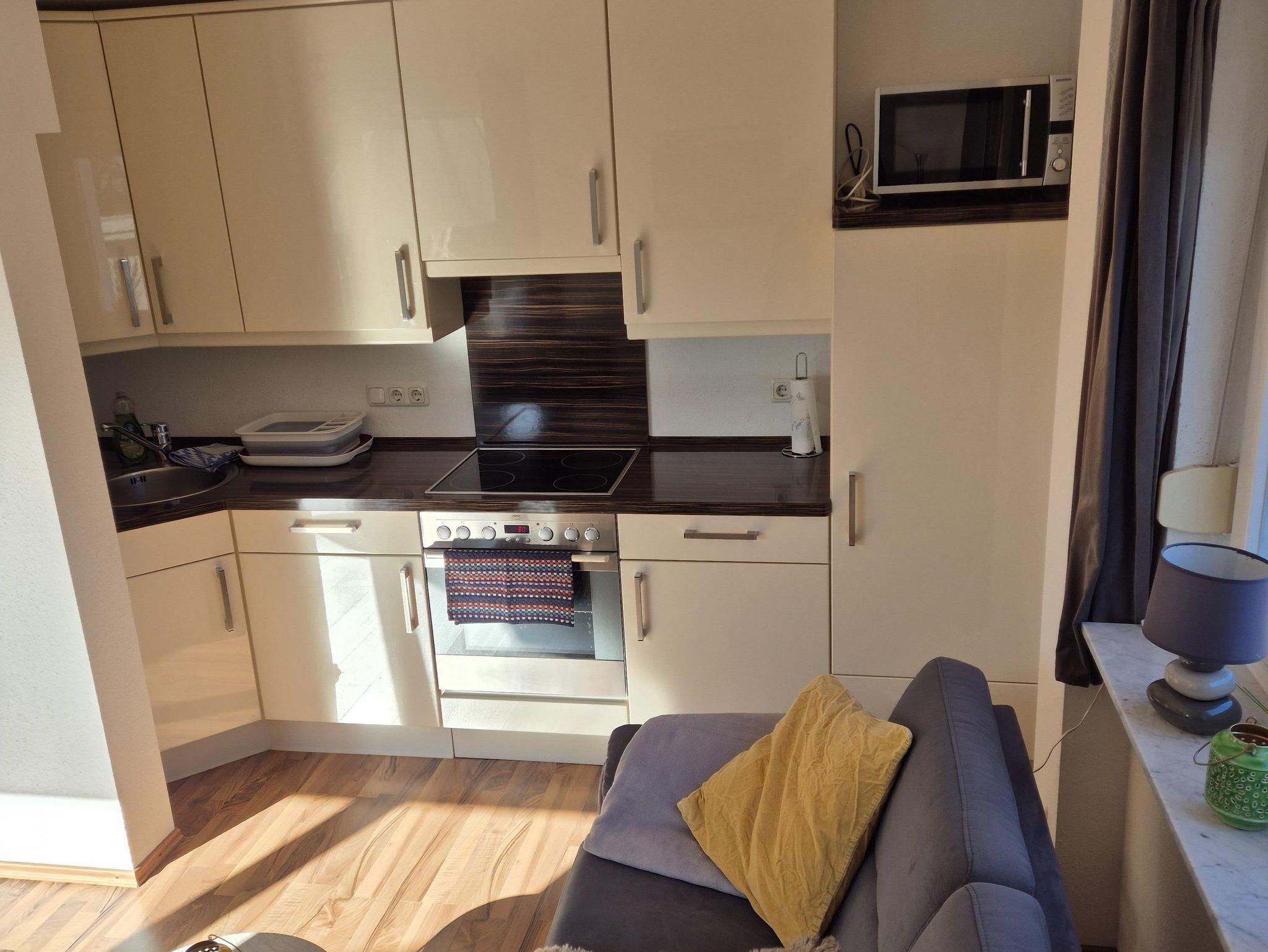 Wohn und Esszimmer mit einer hochwertigen Einbauküche inkl. ausziehbahren Schlafsofa und Fußbodenheizung