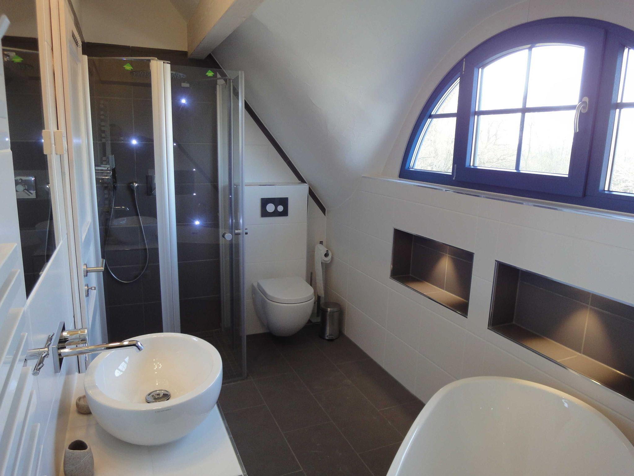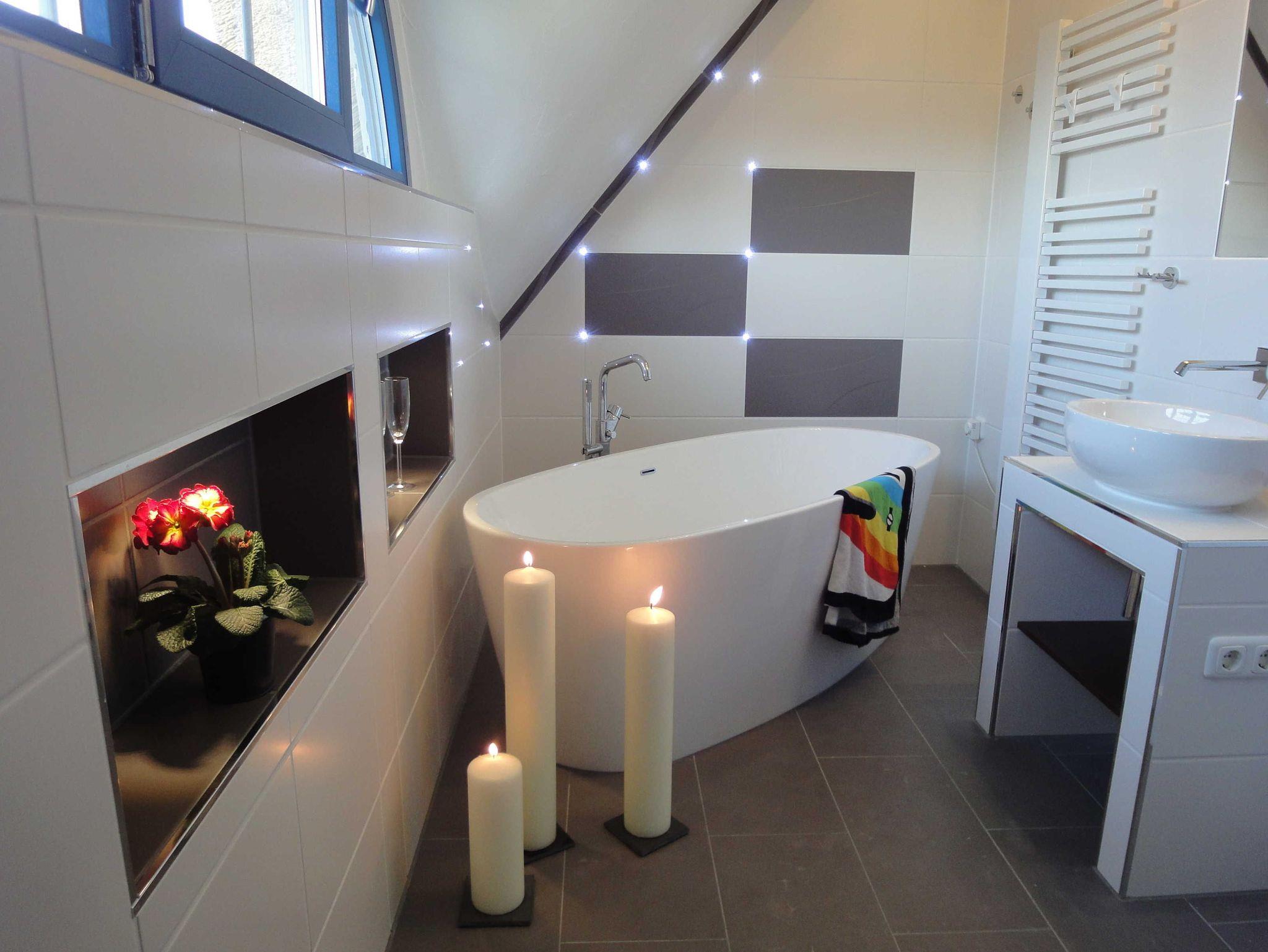 Zu romantischen Abenden lädt auch die freistehende Badewanne im Kerzenschein in einem der Bäder ein, oder lassen Sie sich vom eiskalten Brauseschwall nach der Sauna im unteren Bad erfrischen.