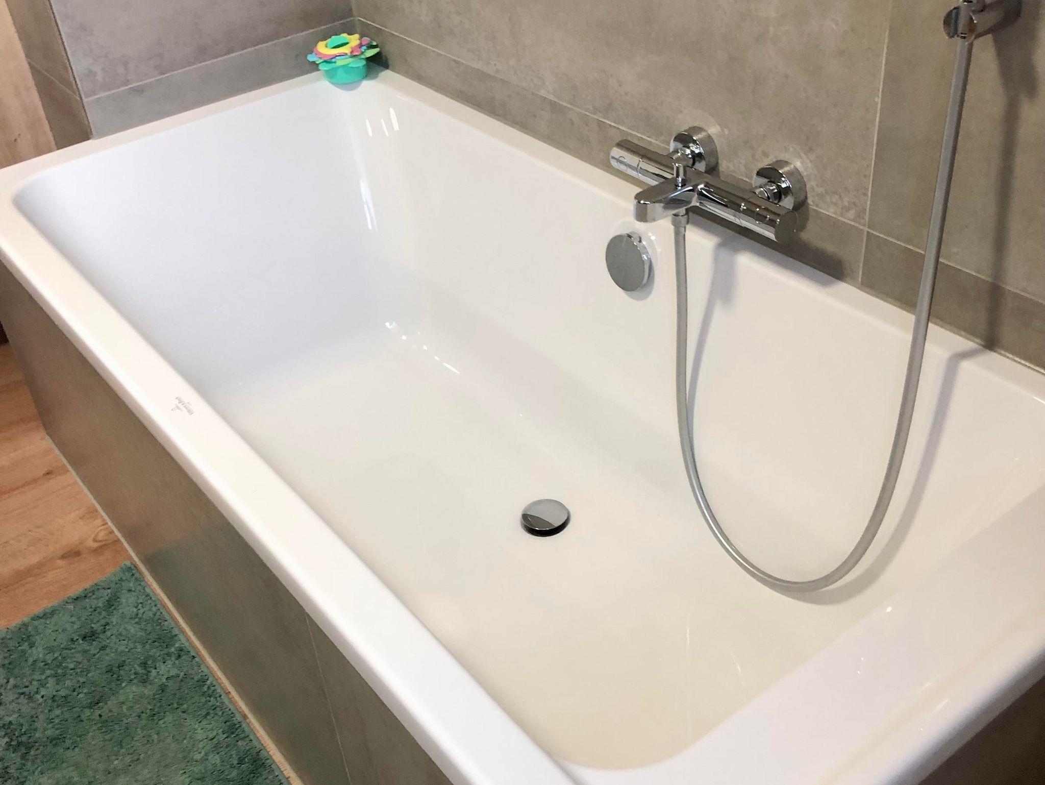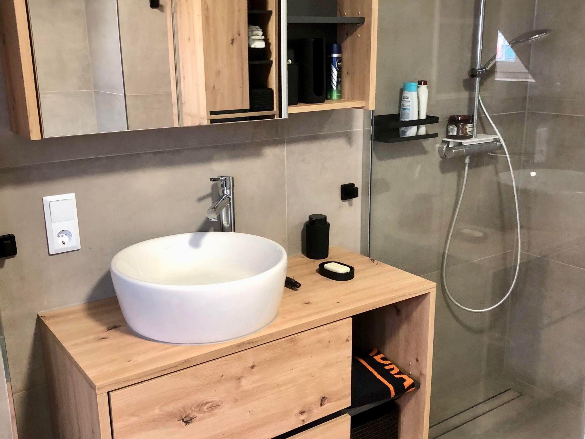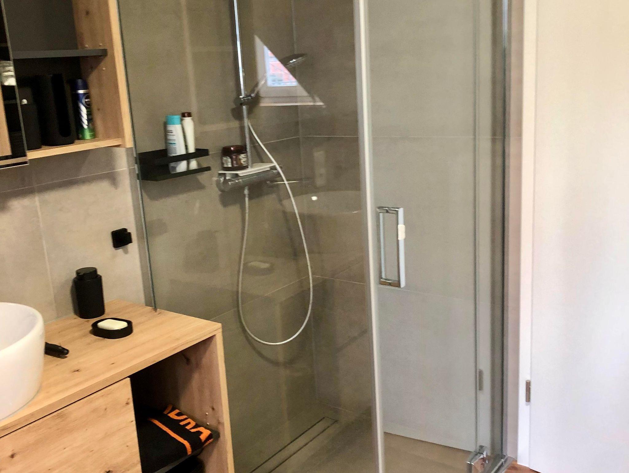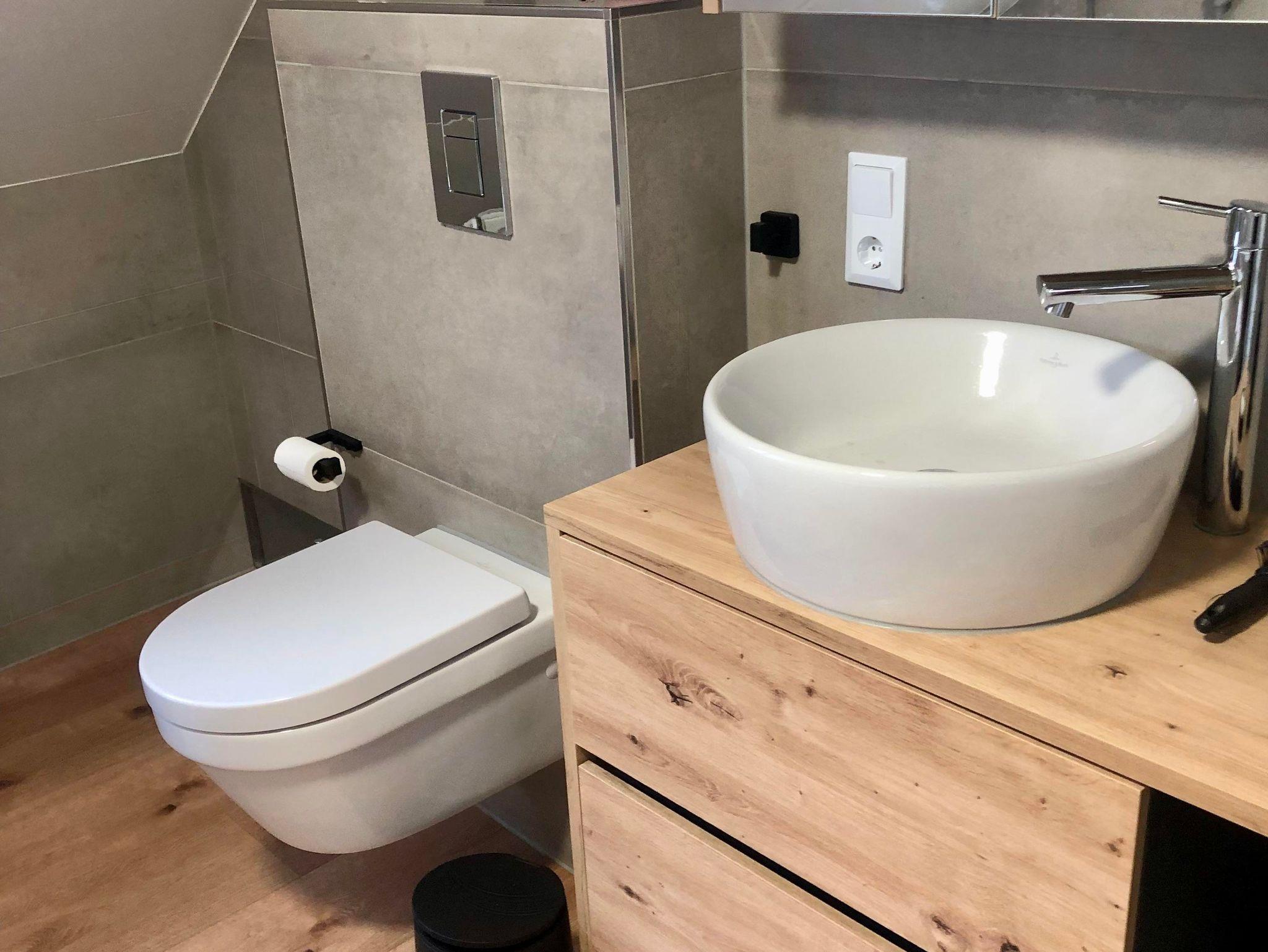 Im Badezimmer erwartet Sie eine Wellness Oase der oberen Klasse: Eine tolle große Badewanne für Schaumbäder und eine bodengleiche Dusche mit Regenarmatur für das ultimative Duscherlebnis. Schicke Badmöbel sorgen für ausreichenden Stauraum. Ein erhöhtes WC sowie ein Aufsatzwaschbecken und Spiegelschrank runden das ganze Bad ab. Handtücher, Badetücher und Bademäntel sind vorhanden. Ebenso ein Haarföhn gehört zur Ausstattung.