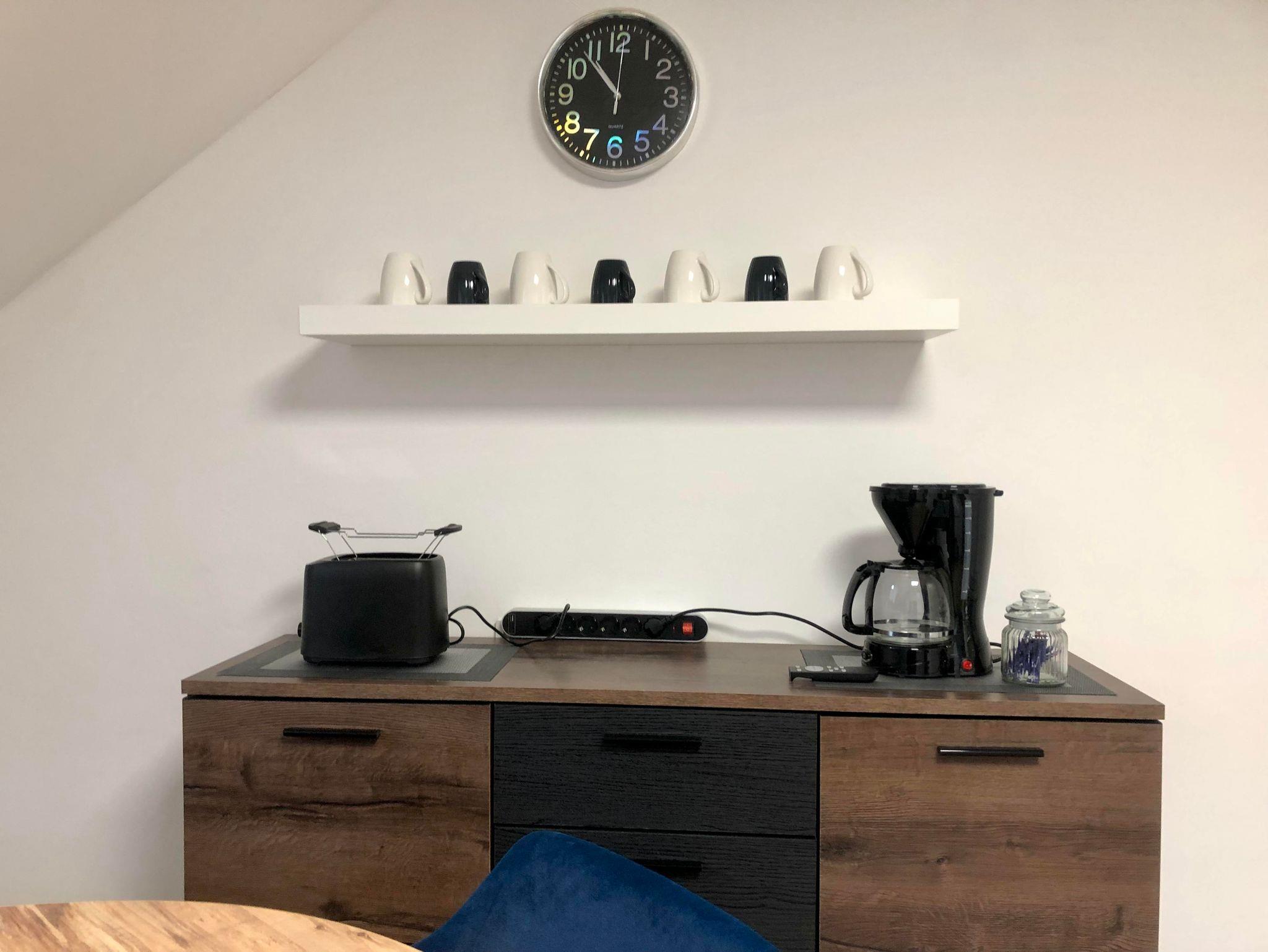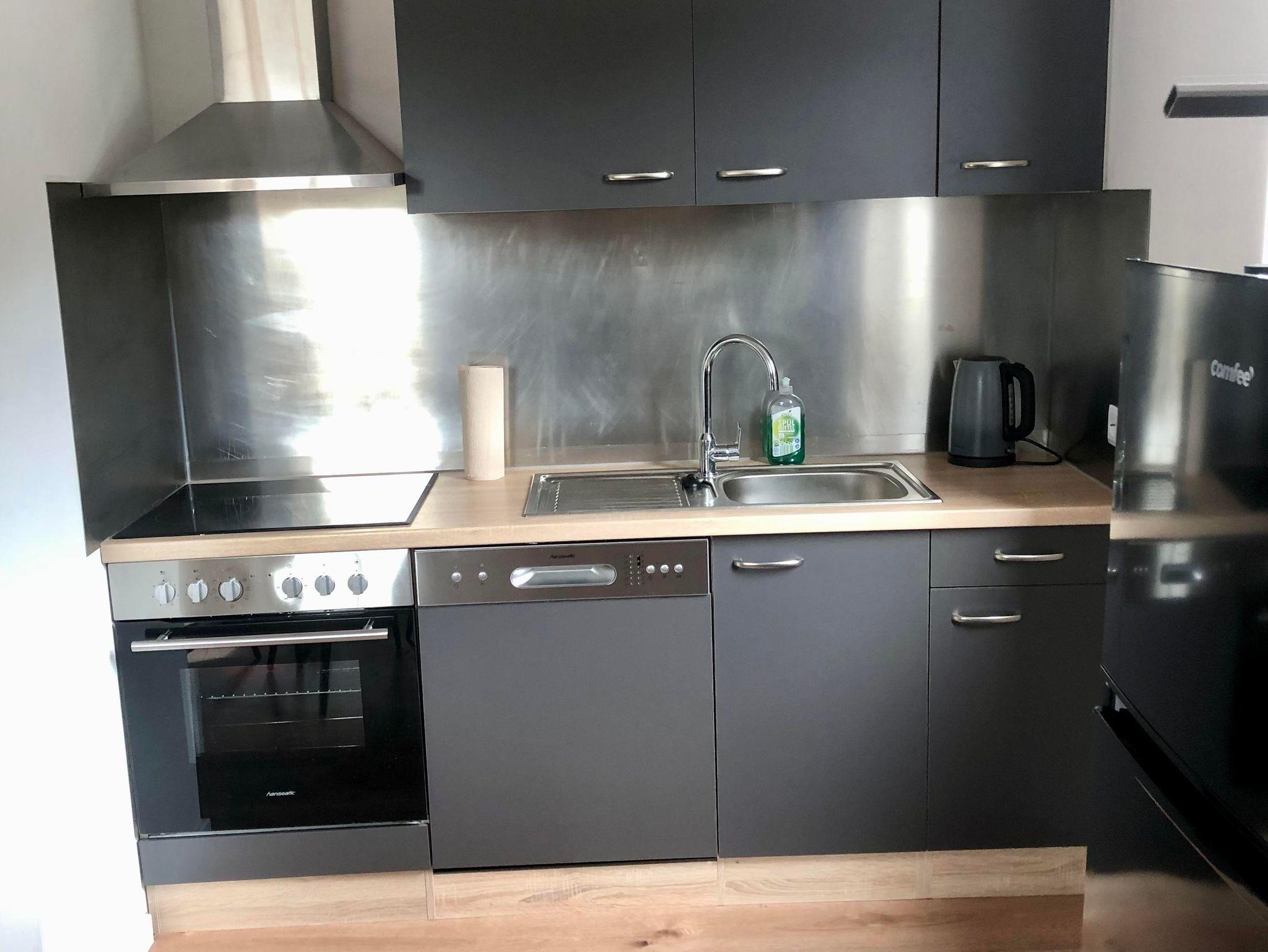 Die Küche ist voll ausgestattet mit Kühlschrank/ Gefrierschrank, Spülmaschine, Backofen, Ceranfeld und Dunstabzug. Ebenfalls vorhanden sind diverse Kleingeräte, wie Kaffeemaschine, Toaster, Mixer und Wasserkocher. Am gemütlichen Esstisch können sie ihre Mahlzeiten genießen.
