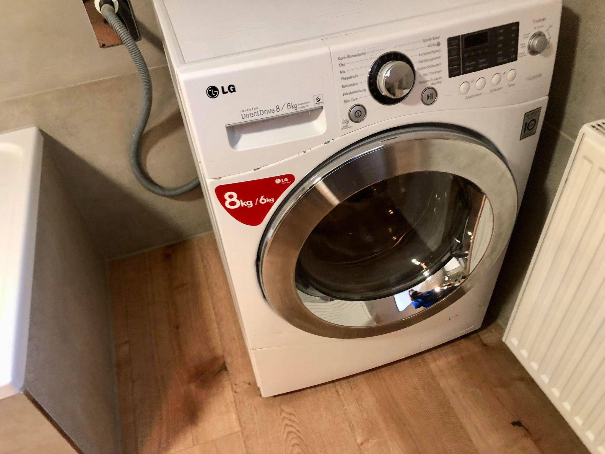 Eine Waschmaschine mit integriertem Trockner sowie ein Bügeleisen stehen Ihnen während ihres