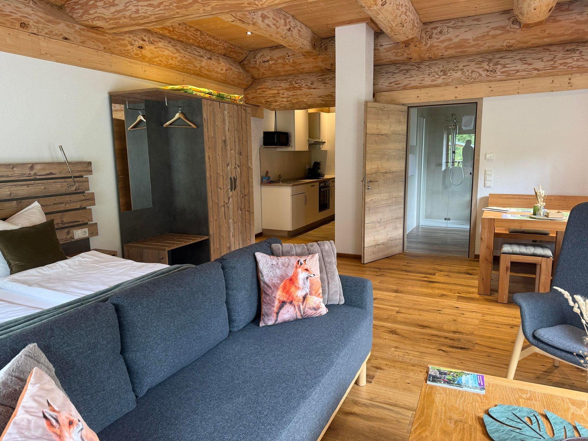Fuchs Die barrierefreie Ferienwohnung „Fuchs“ im Erdgeschoss bietet Platz für bis zu 3 Personen und verfügt über einen offenen Wohnbereich mit Balkon und Waldblick.