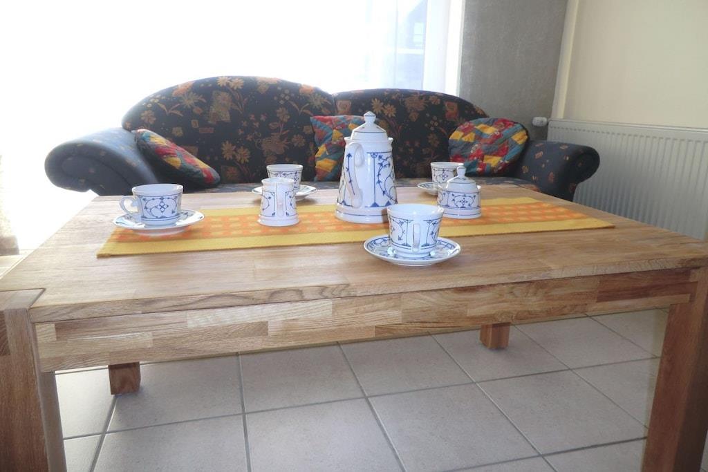 Stueetage: (Køkken(spisebord, kogeplade, elkedel, brødrister, kaffemaskine, mikrobølgeovn, opvaskemaskine , køleskab, fryser), stue / spisestue(Fjernsyn, spisebord, radio, barnestol), soveværelse(dobbeltseng, barneseng), soveværelse(enkeltseng, enkeltseng), badeværelse(bruser, håndvask, toilet, vaskemaskine)) terrasse, havemøbler