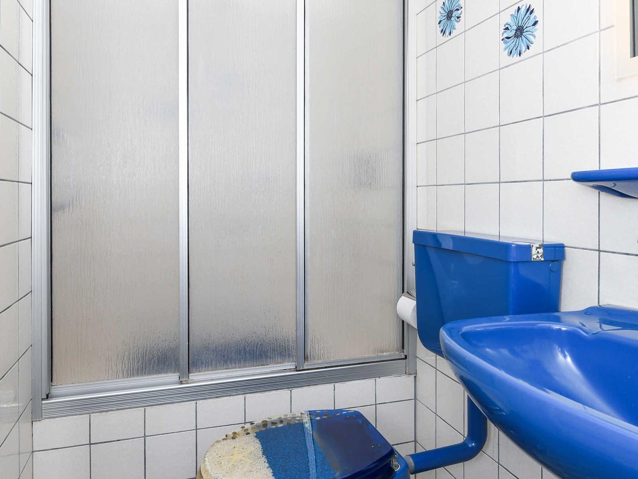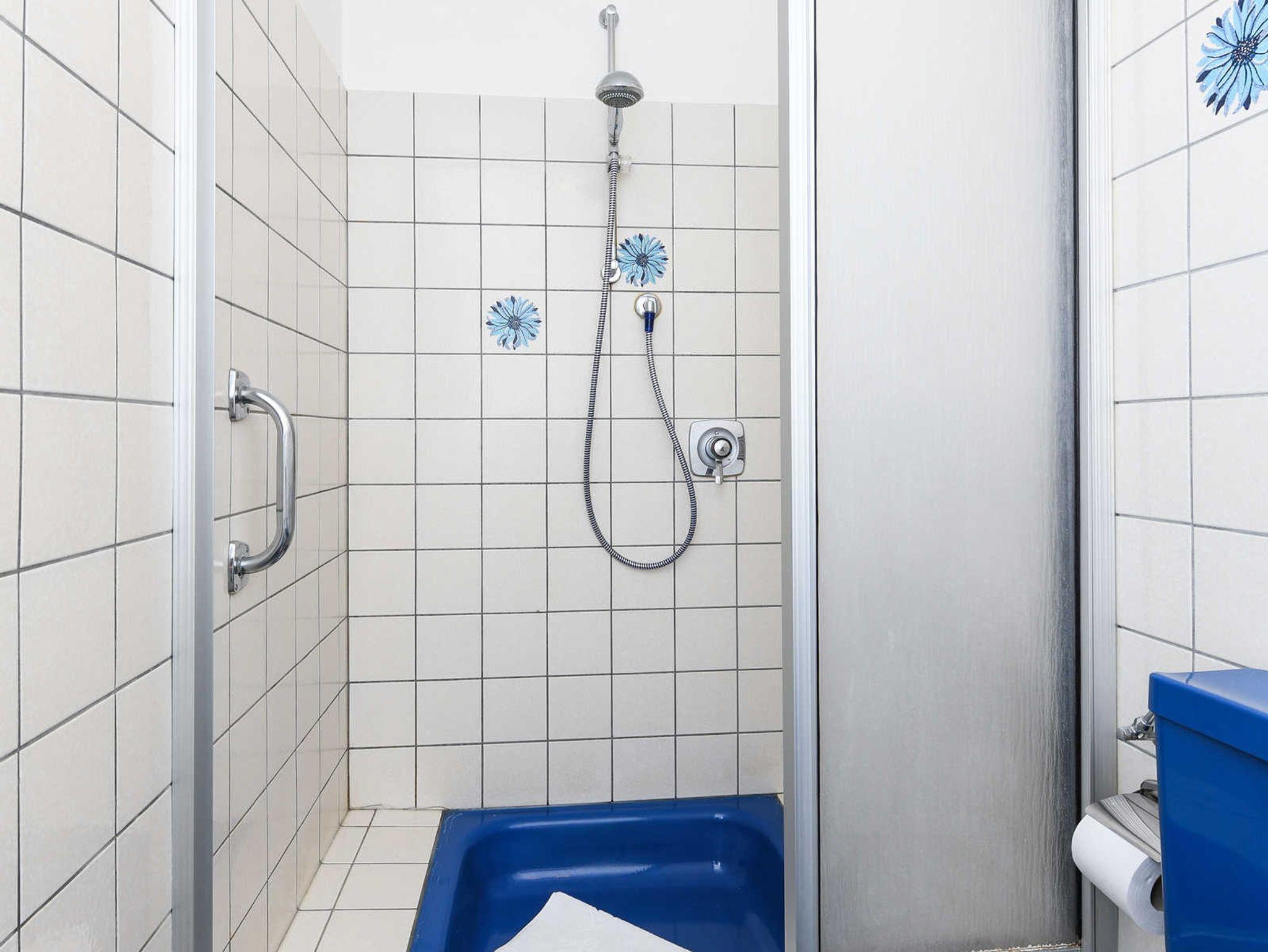 Badezimmer mit Dusche, Waschtisch und WC