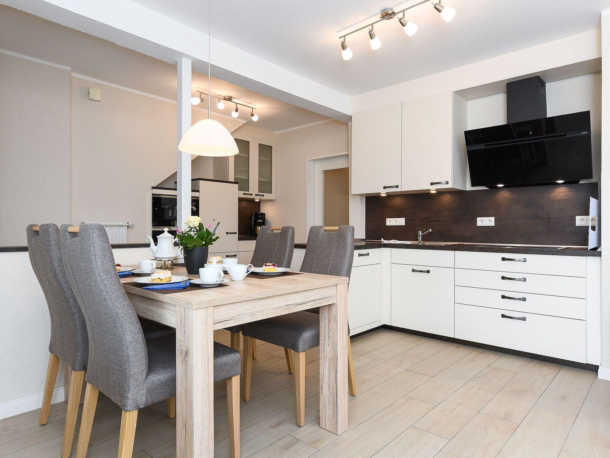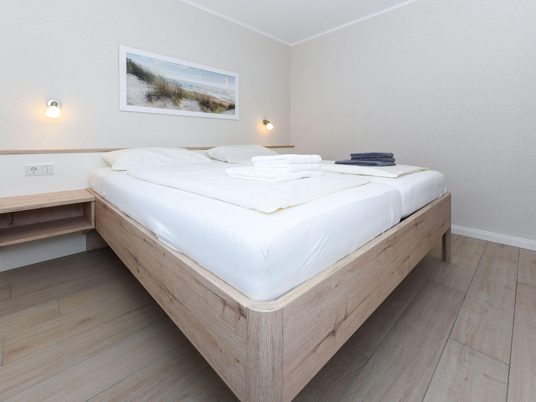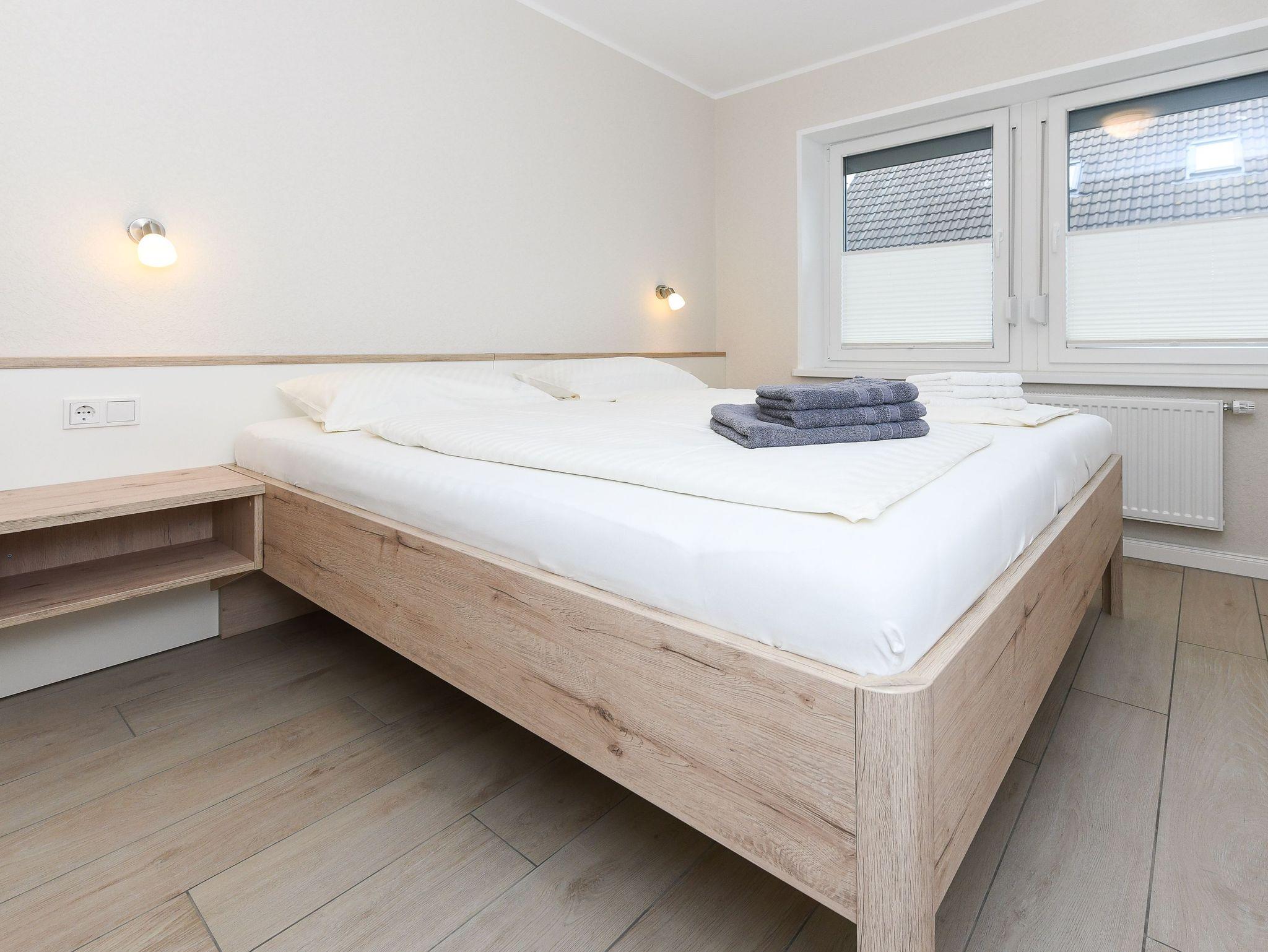 Größe ca. 60 Quadratmeter, Wohnraum mit integrierter Küche und Essgruppe, Schlafzimmer, zweites separates Schlafzimmer, Badezimmer mit Dusche, Waschtisch und WC, Erdgeschoss, Terrasse, optimal für 2 bis 4 Personen und zusätzlich ein Kleinkind.