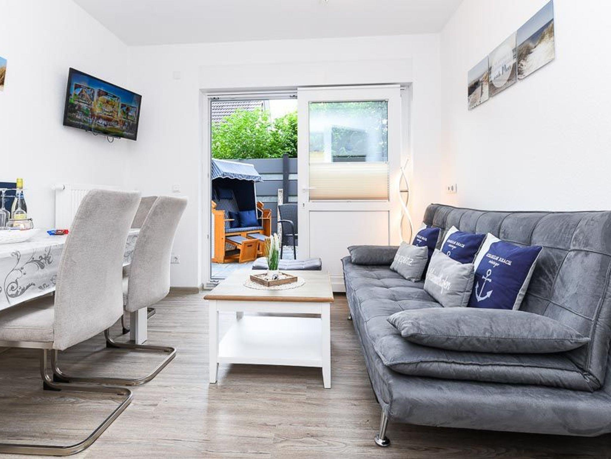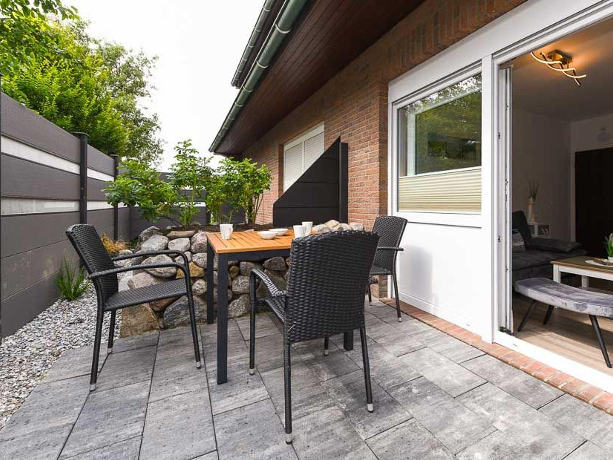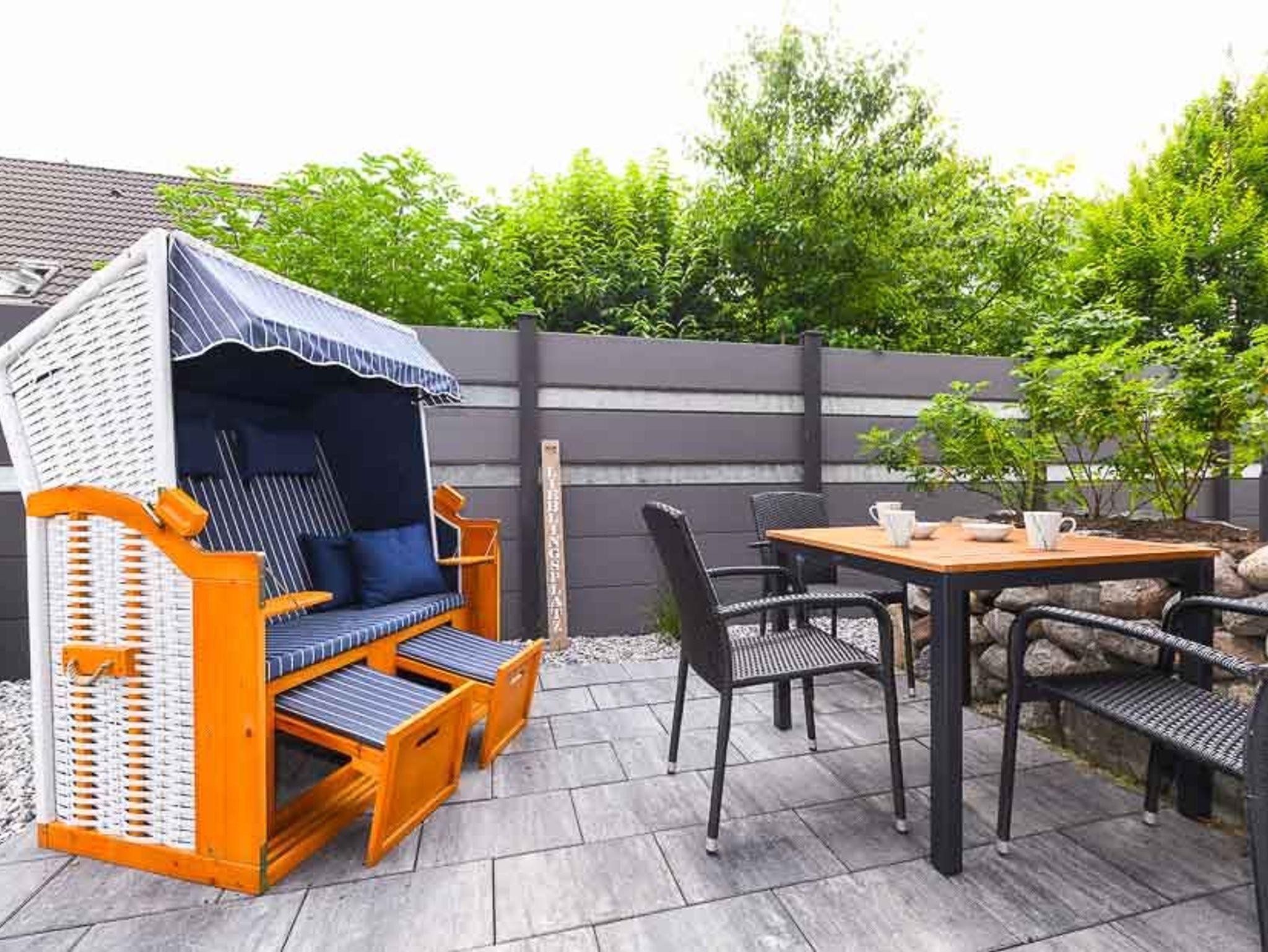 Die fünf Ferienwohnungen sind zwischen ungefähr 44 und ungefähr 35 Quadratmeter groß und für Ihren Urlaub mit 2 bis 3 Personen bestens geeignet. Das Apartment ist ungefähr 29 Quadratmeter groß und für 2 Personen sowie auch für Singles sehr gut geeignet. An unserem Haus gibt es zwei Gemeinschaftsterrassen für alle Wohnungen und das Apartment, eine vor dem Haus, dort steht auch ein schöner Strandkorb für Sie, und eine hinter dem Haus mit einer schönen Terrasse.