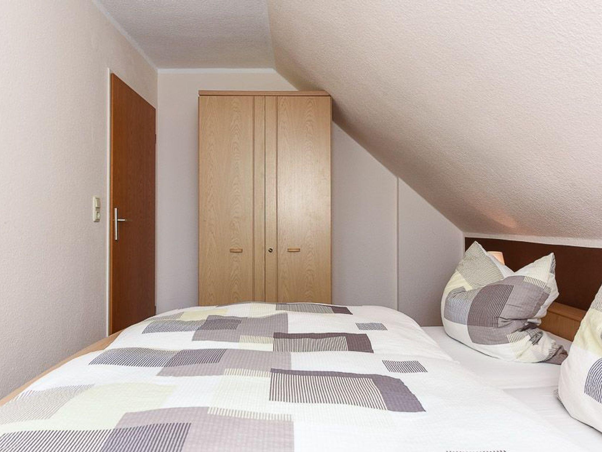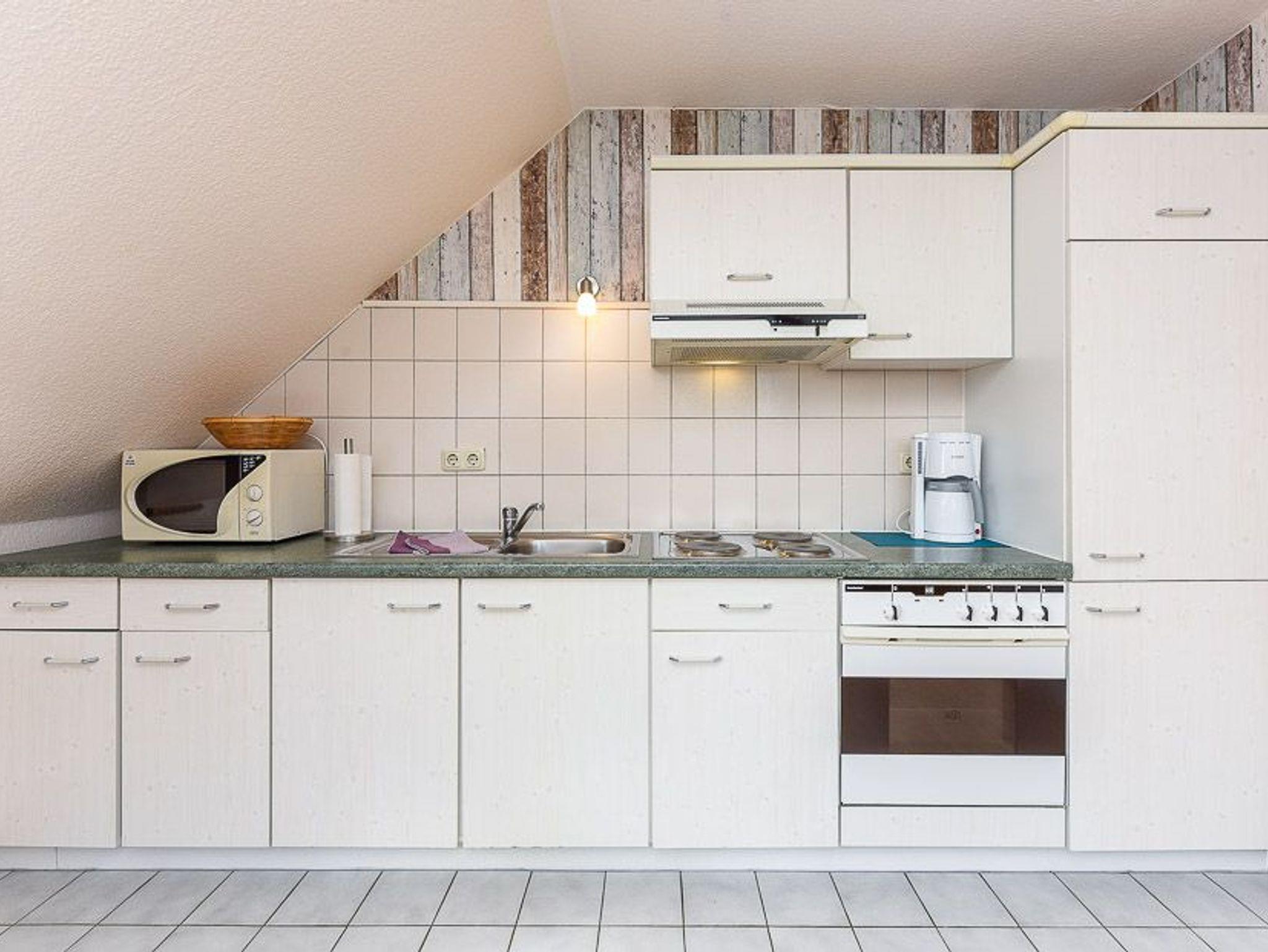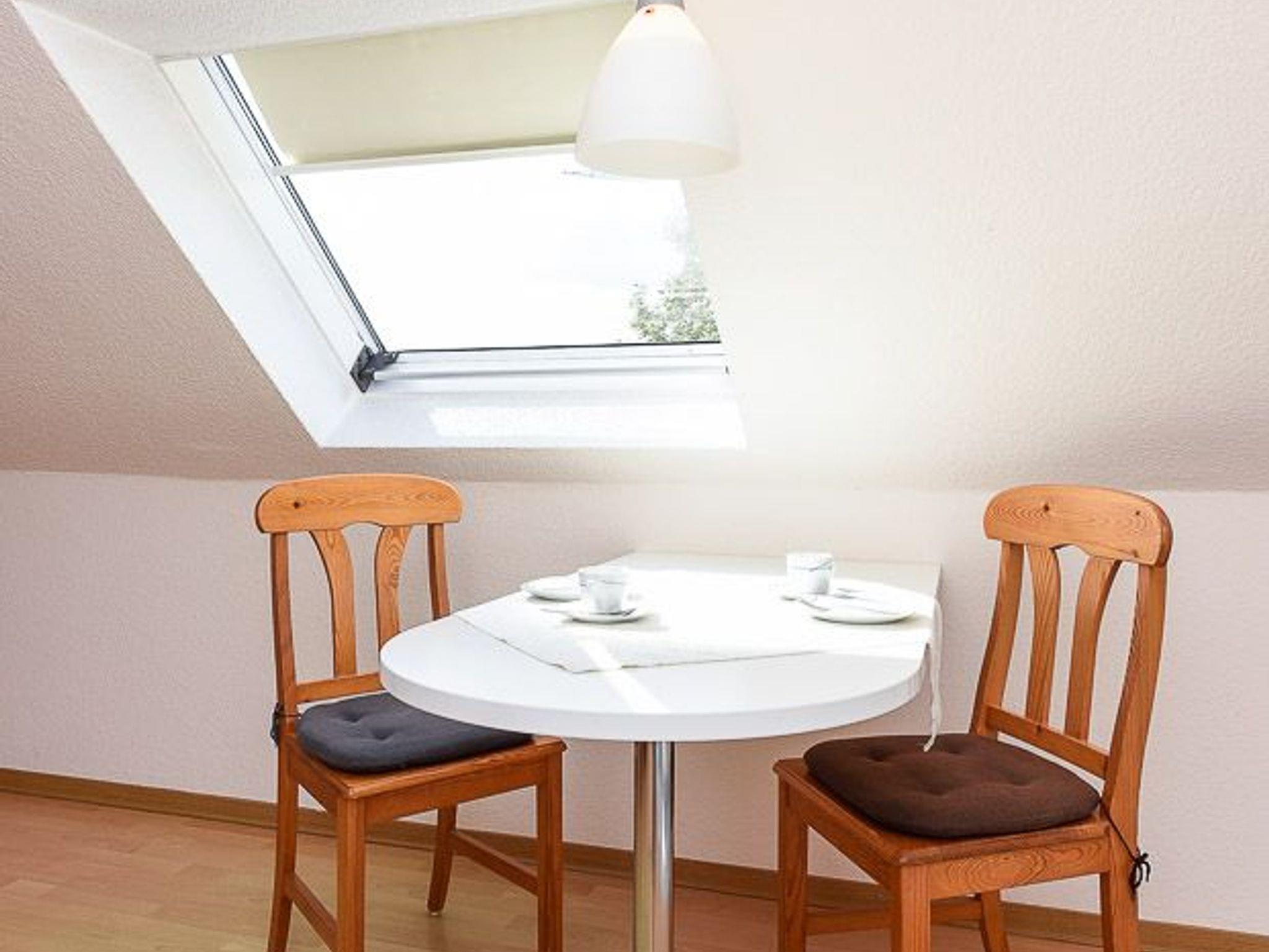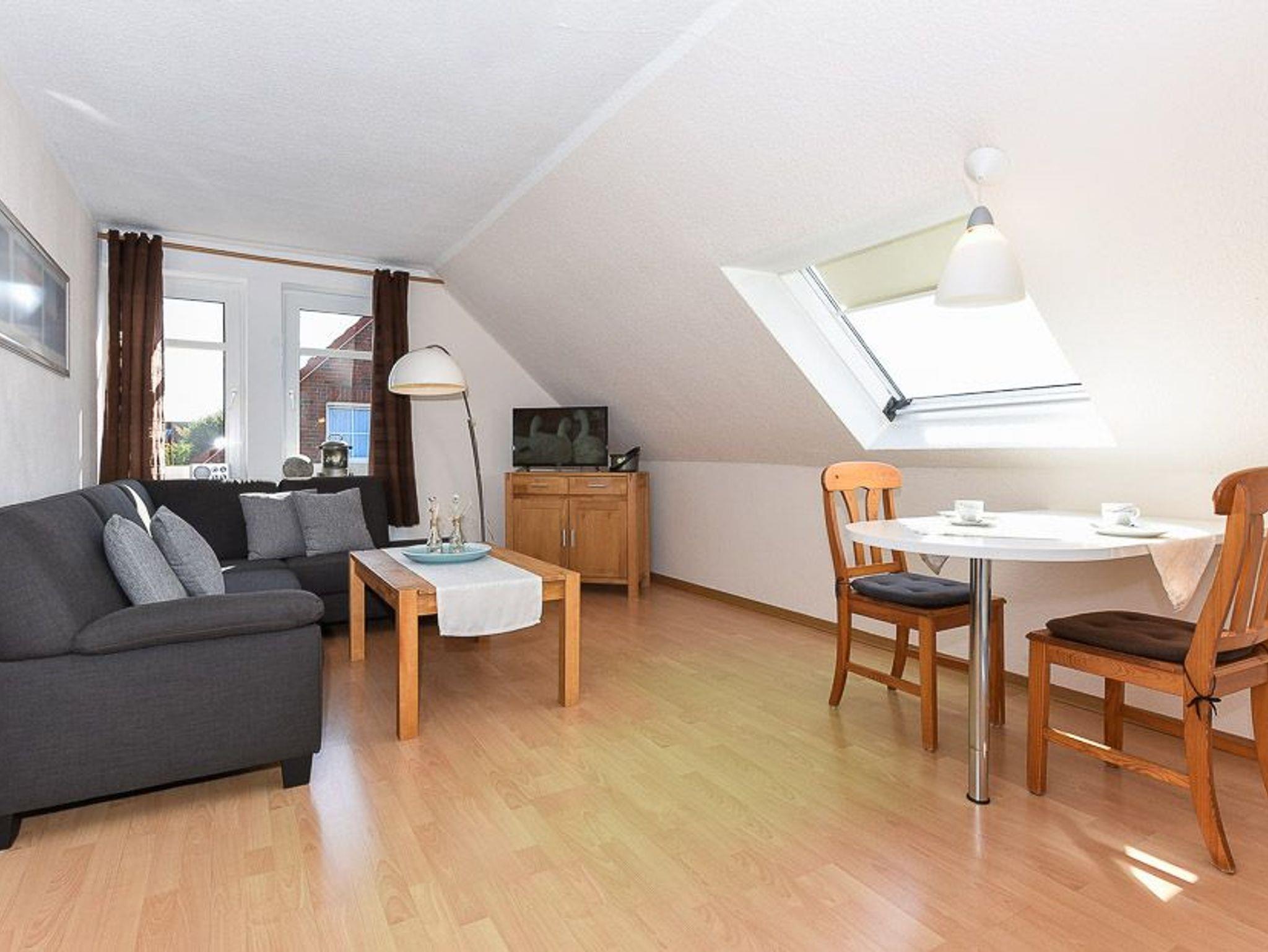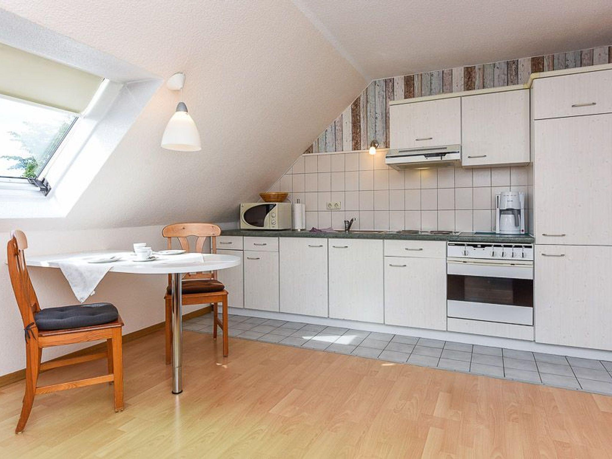 Größe ca. 45 Quadratmeter, Wohnraum mit integrierter Küche, Schlafzimmer, Badezimmer mit Dusche, Waschtisch und WC, Obergeschoss, optimal für 1 bis 2 Personen.