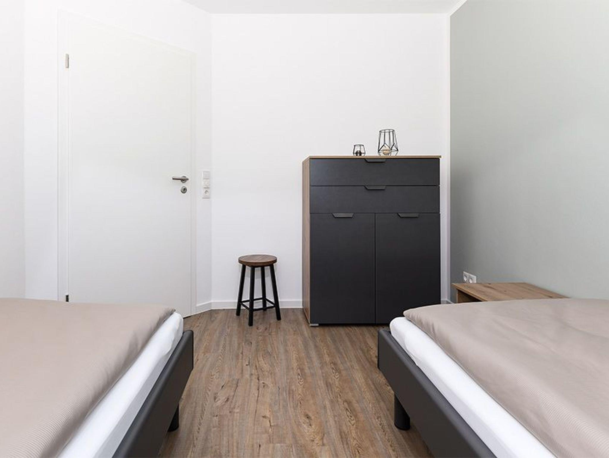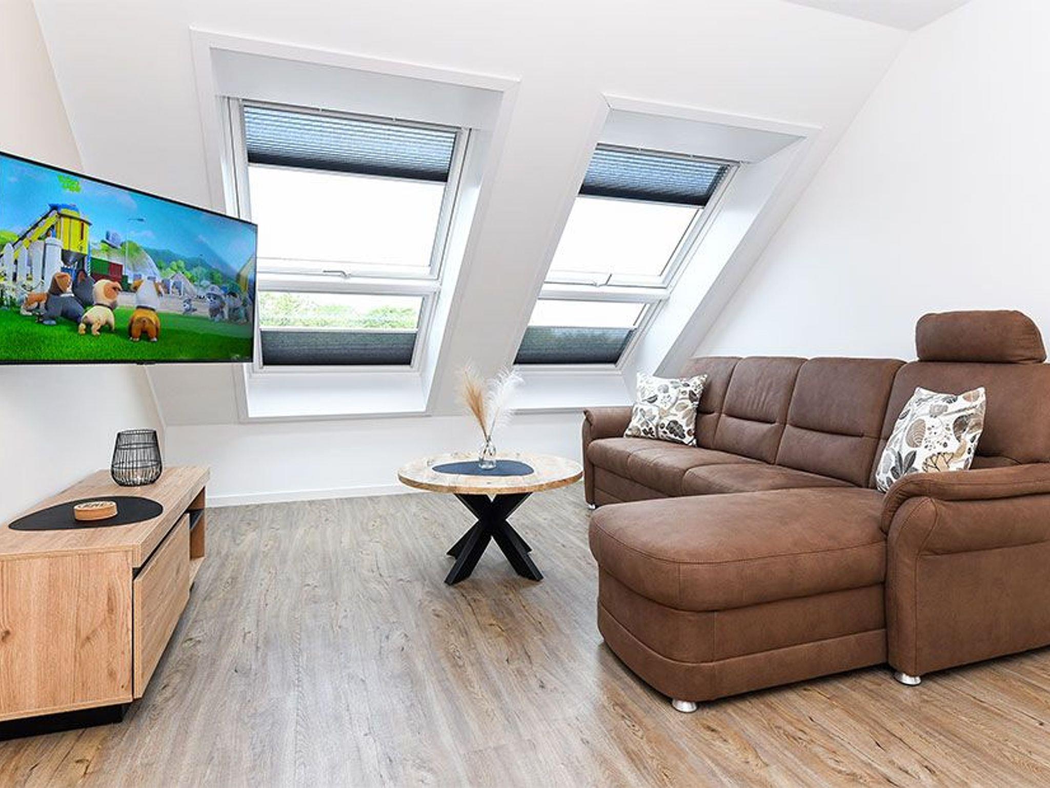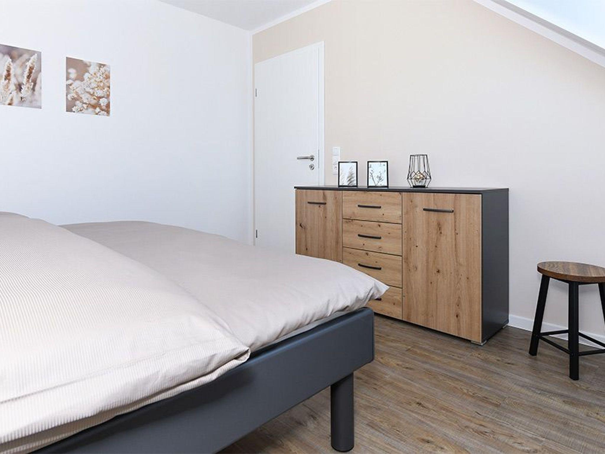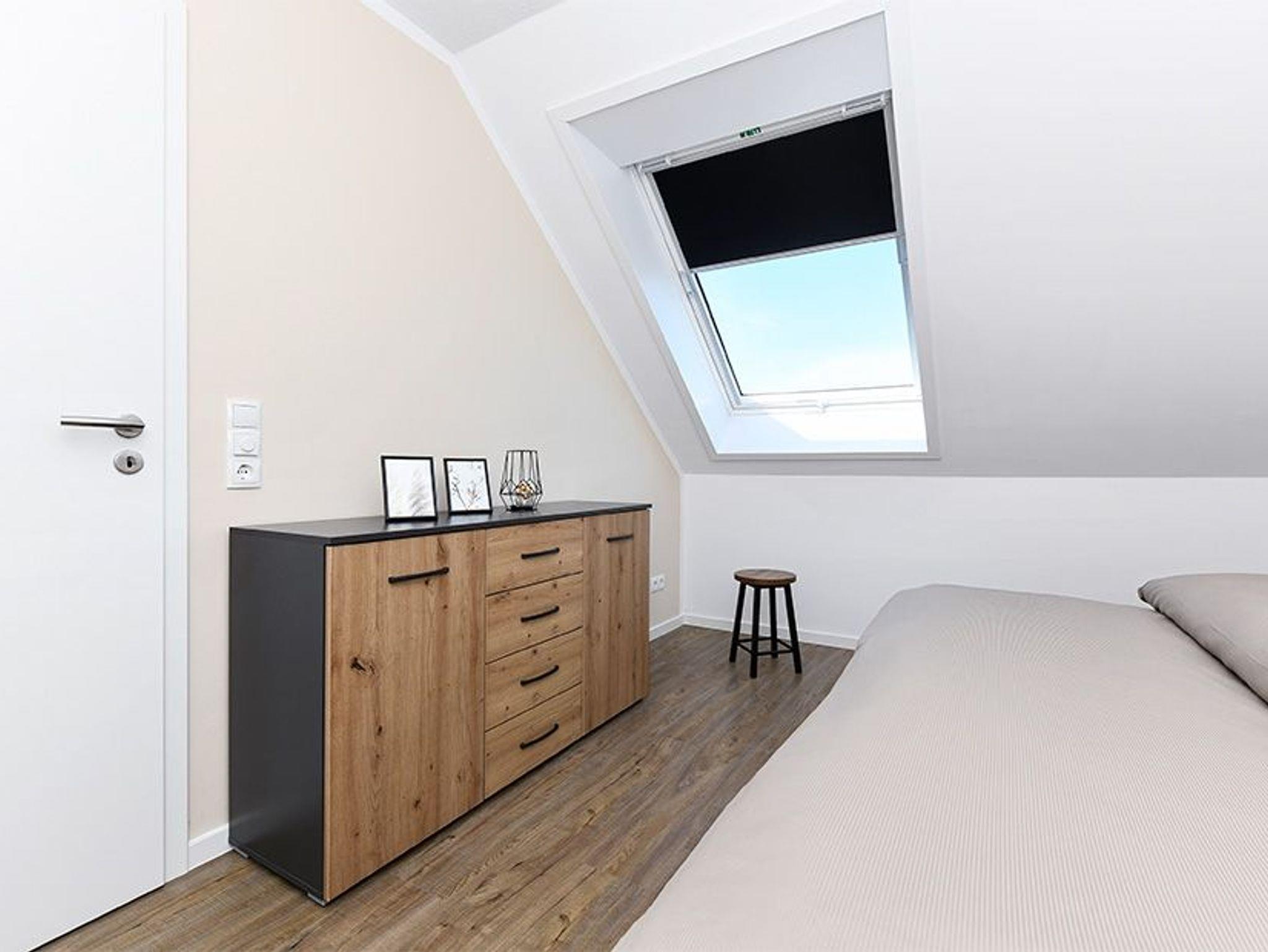 Größe ca. 57 Quadratmeter. Wohnraum mit integrierter Küche. Schlafzimmer, zweites, separates Schlafzimmer, Badezimmer mit Dusche, Waschtisch und WC, Obergeschoss, optimal für 1 bis 4 Personen.