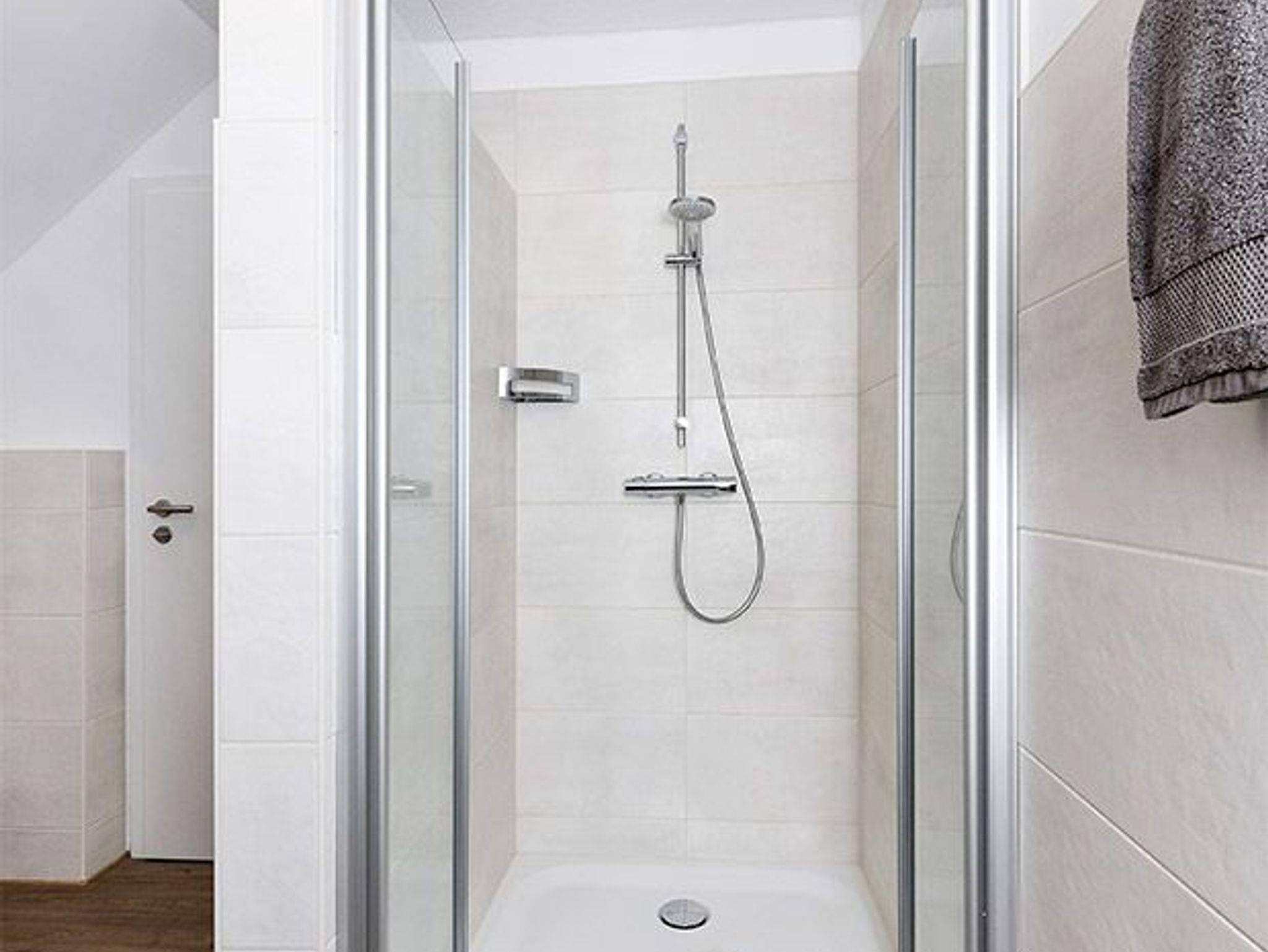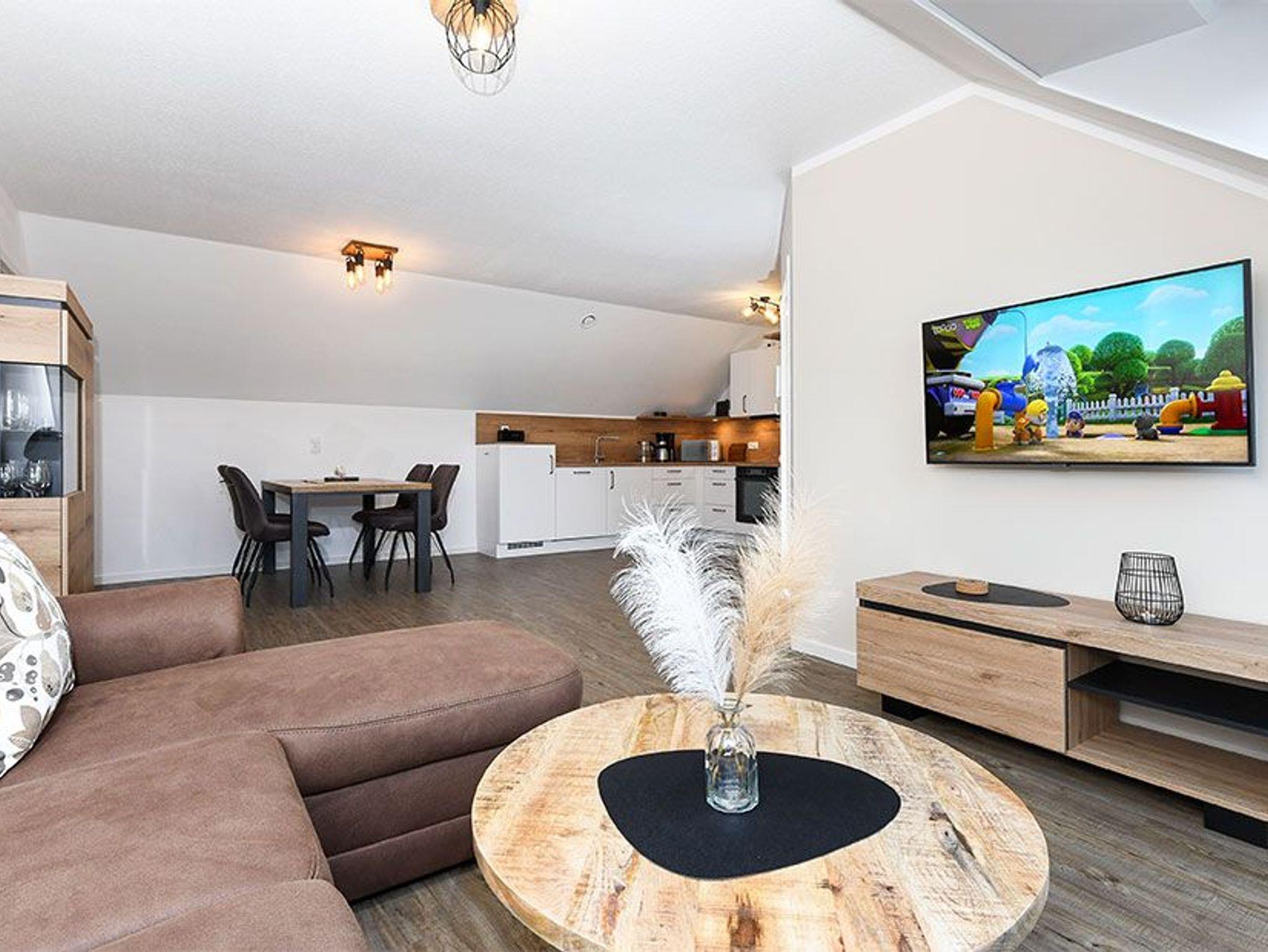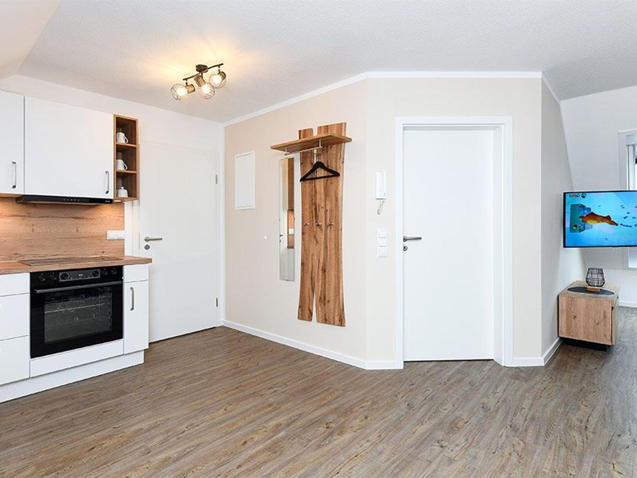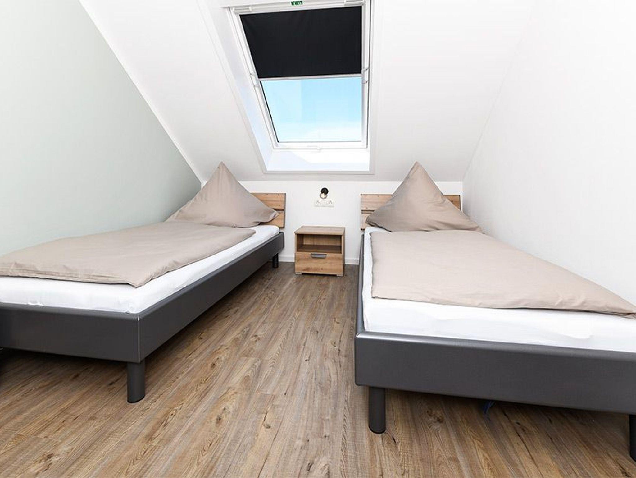 Größe ca. 57 Quadratmeter. Wohnraum mit integrierter Küche. Schlafzimmer, zweites, separates Schlafzimmer, Badezimmer mit Dusche, Waschtisch und WC, Obergeschoss, optimal für 1 bis 4 Personen.