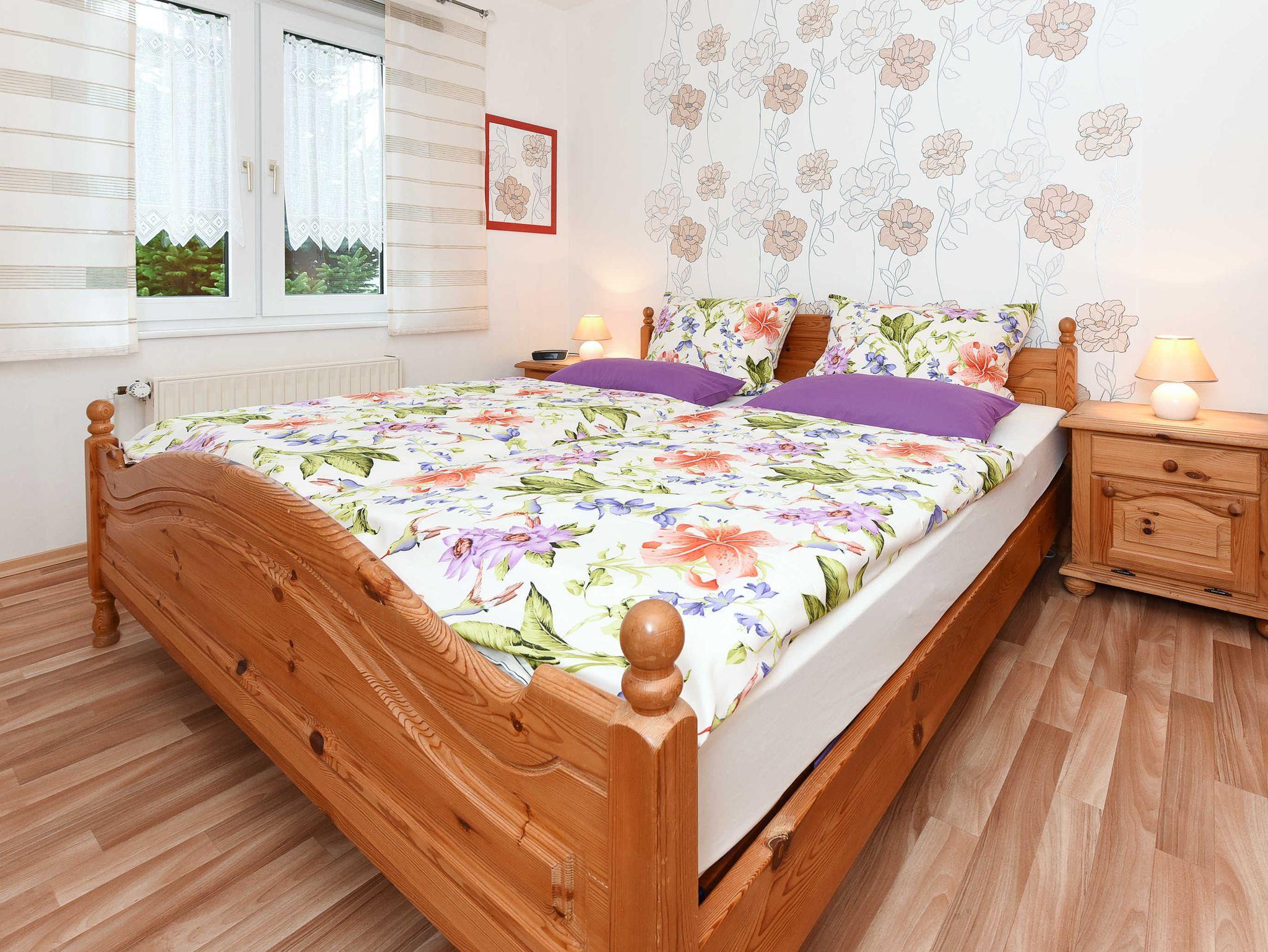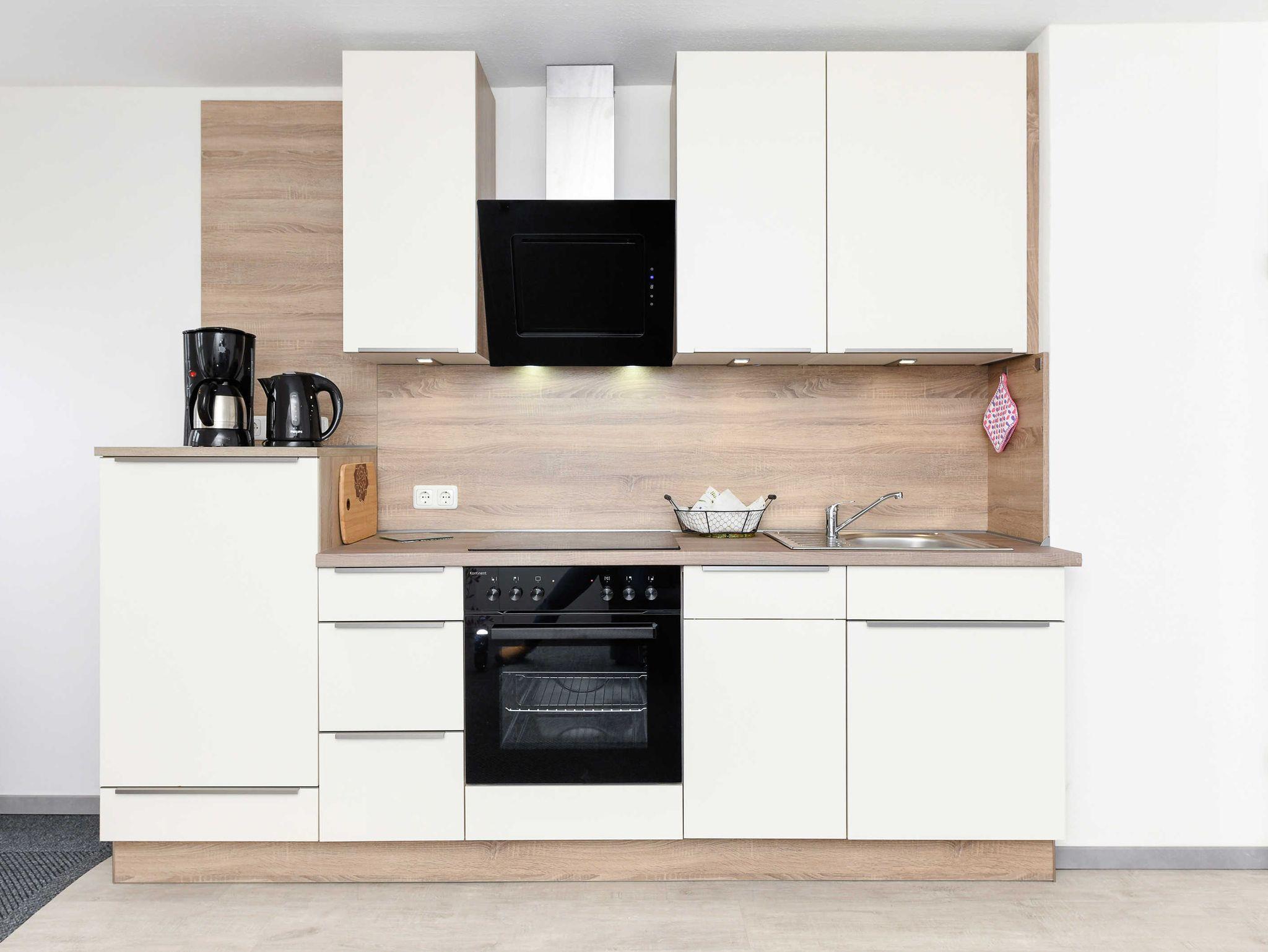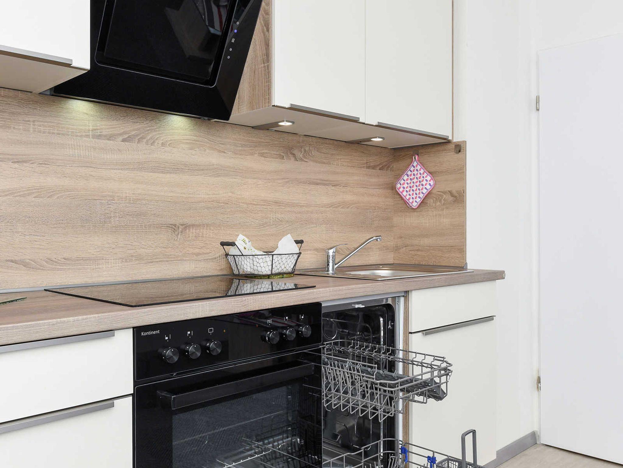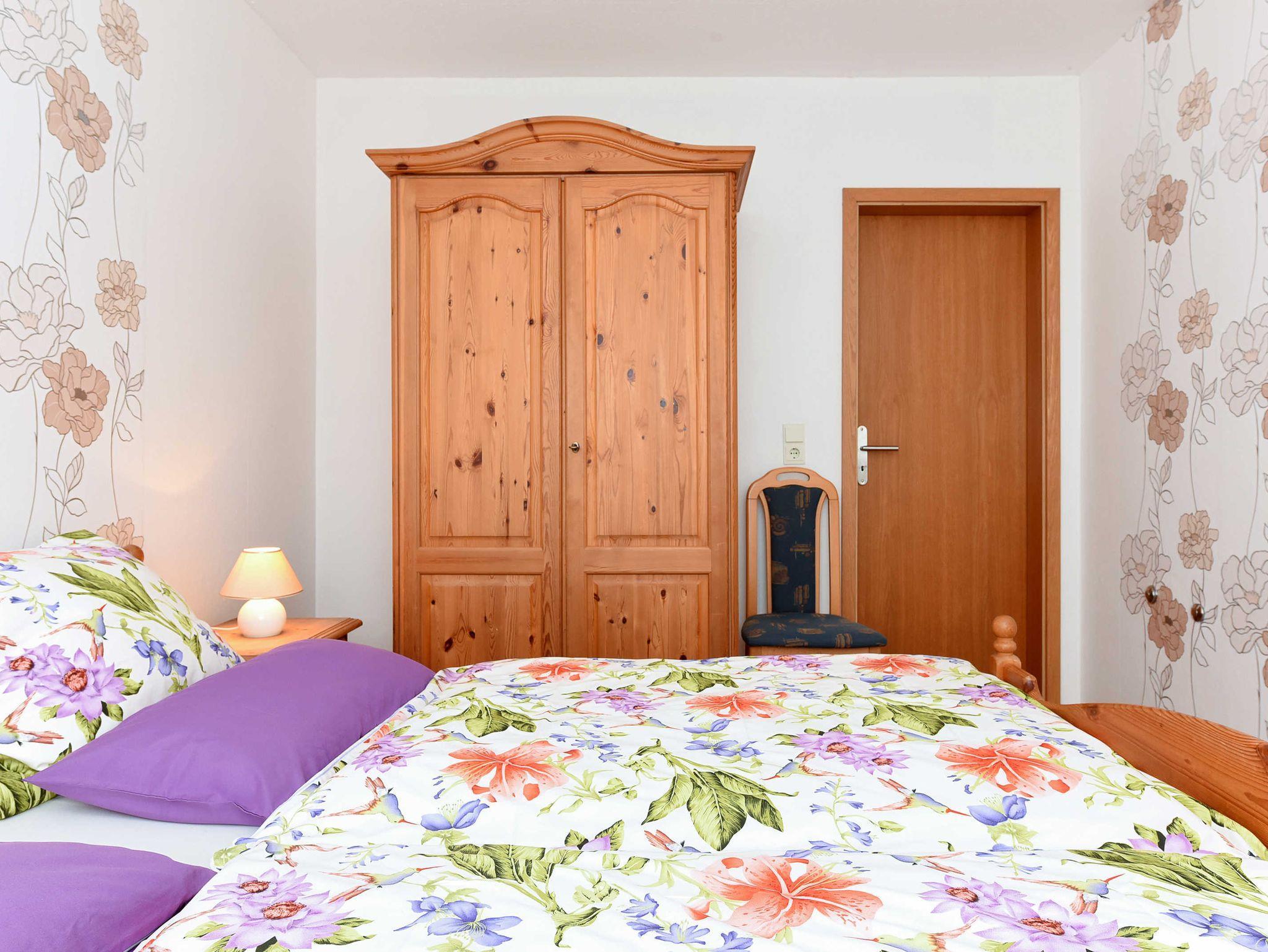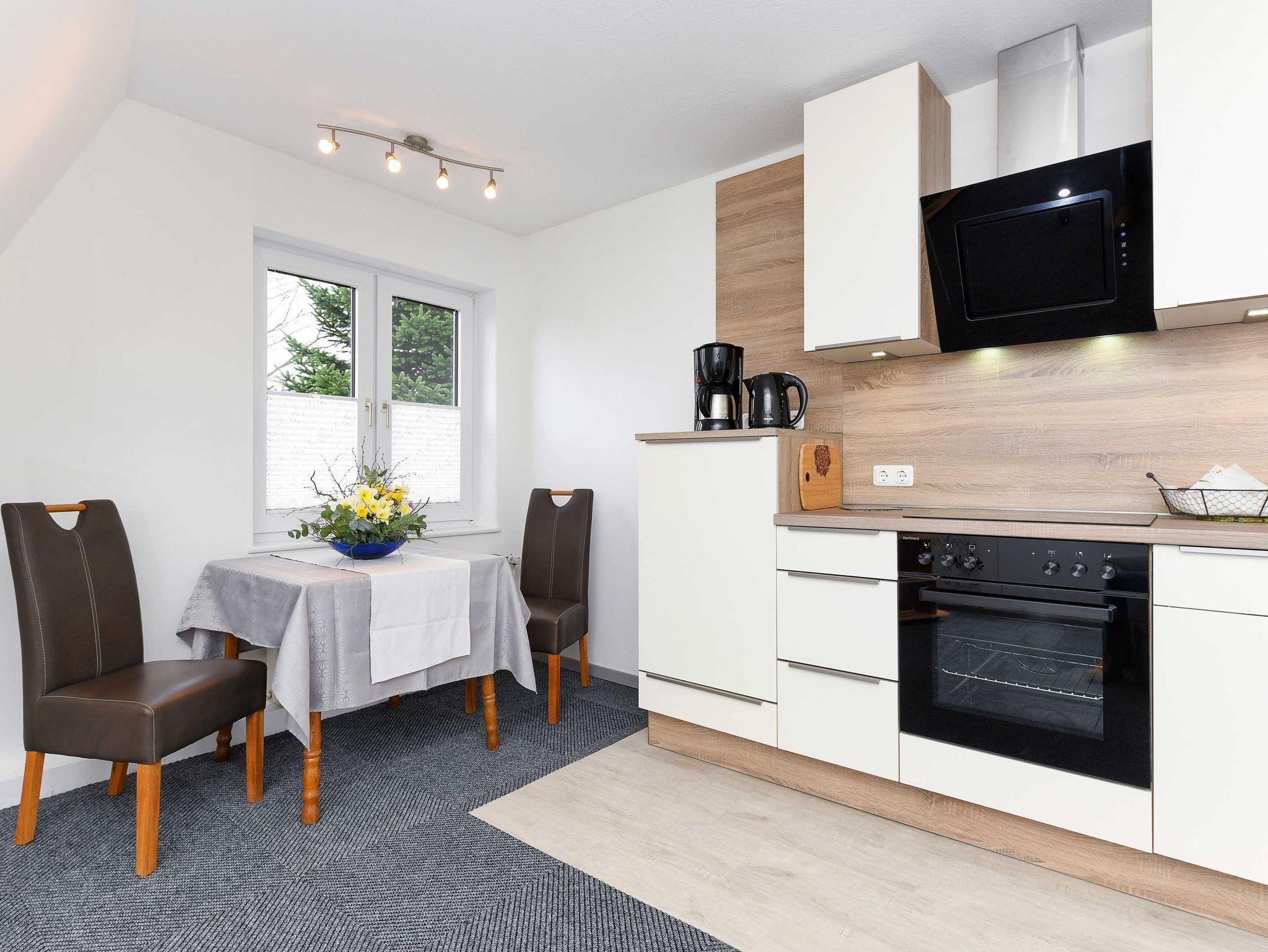 Größe ca. 50 Quadratmeter, Wohnraum mit integrierter Küche, Schlafzimmer, zweites separates Schlafzimmer/Kinderzimmer, Badezimmer mit Dusche, Waschtisch und WC, Obergeschoss, optimal für 1 bis 2 Personen.