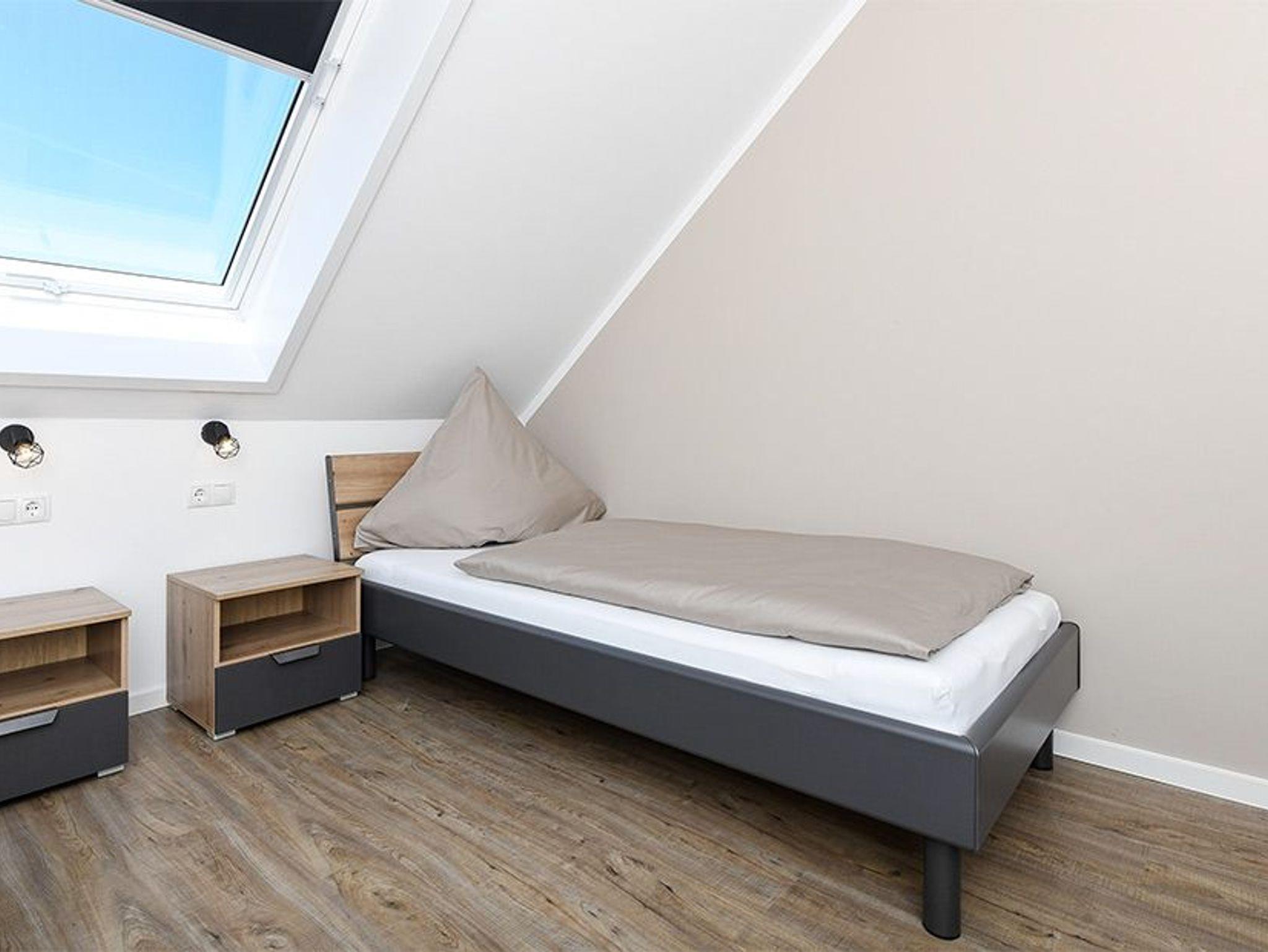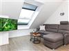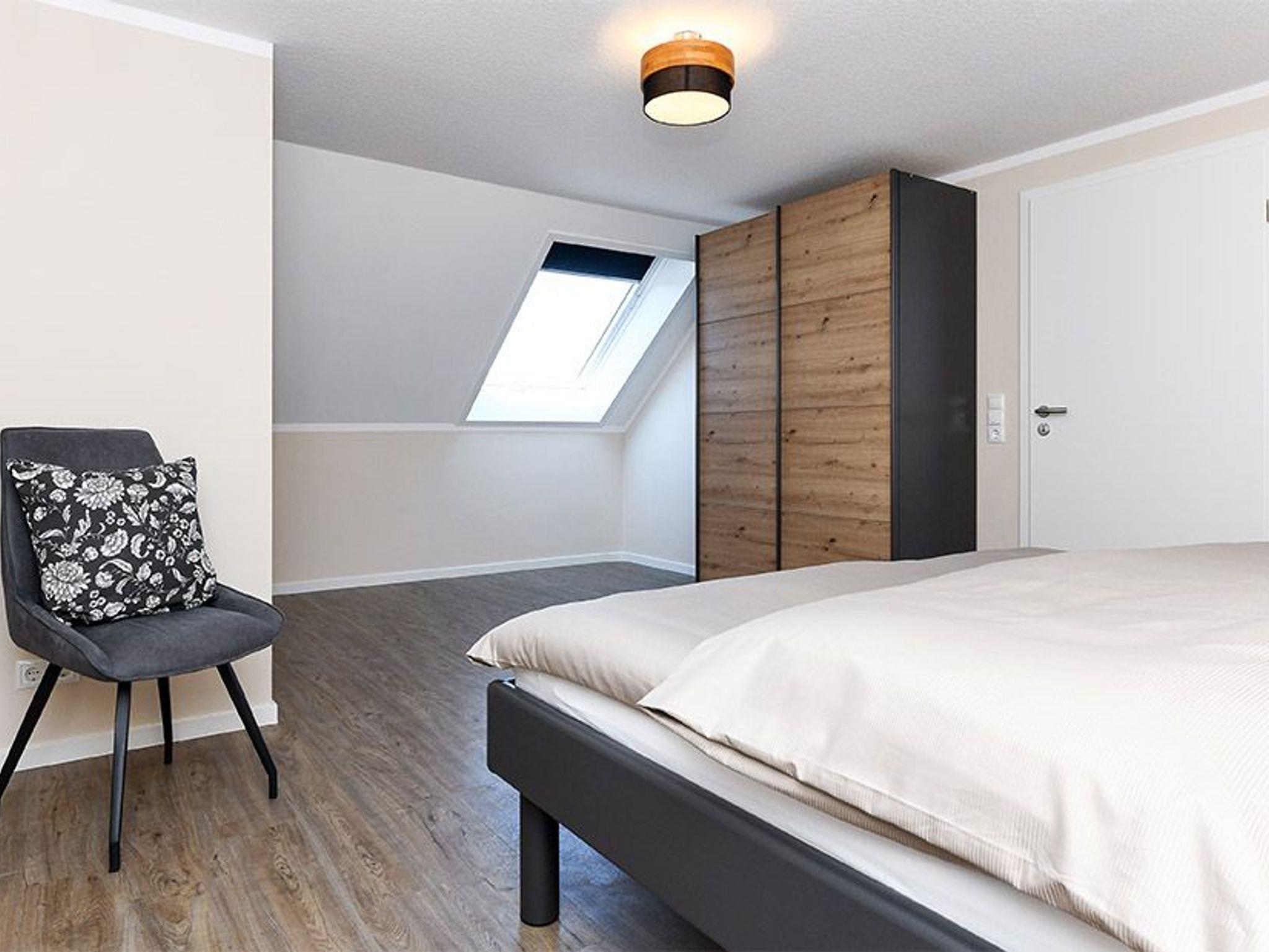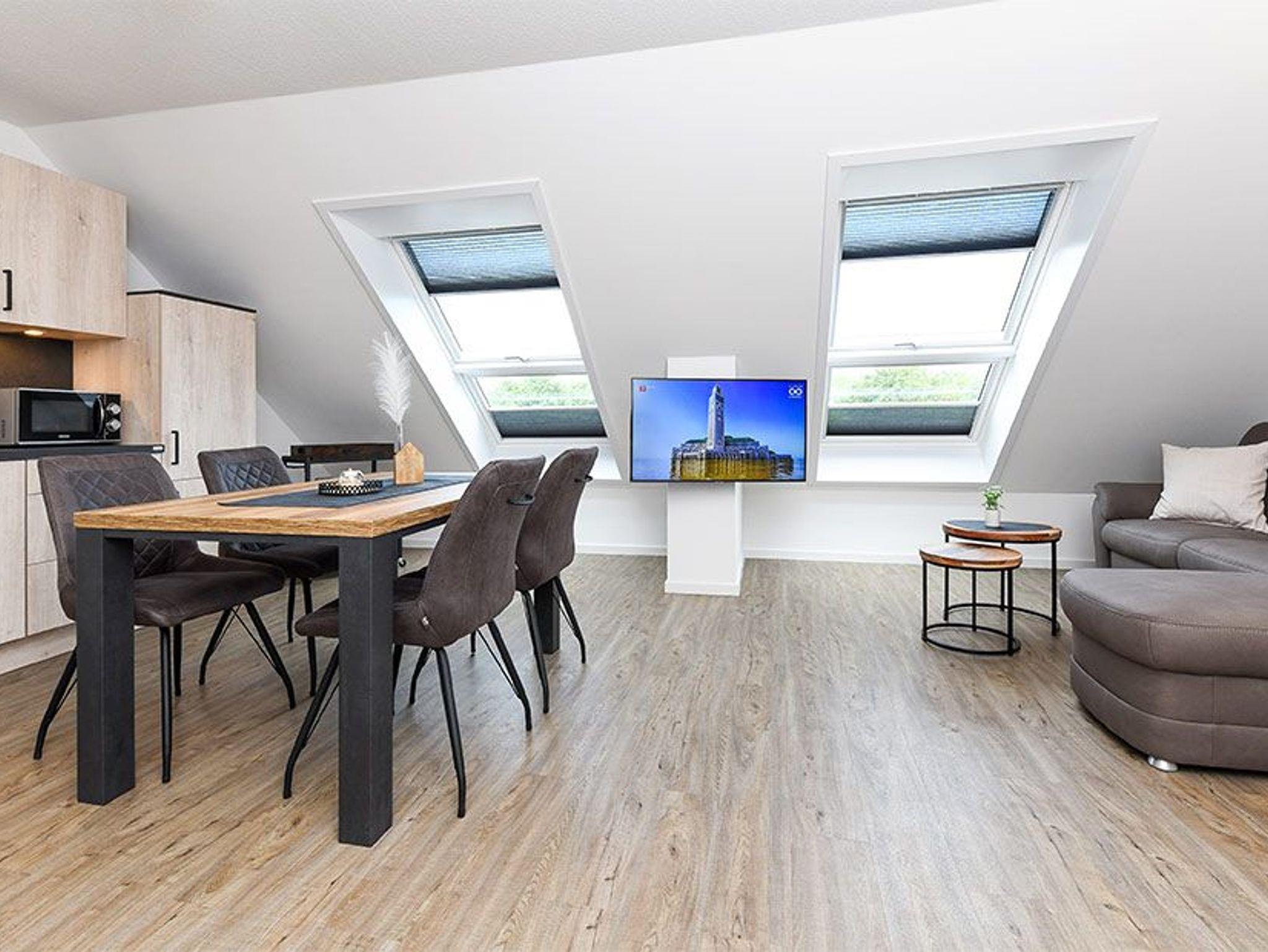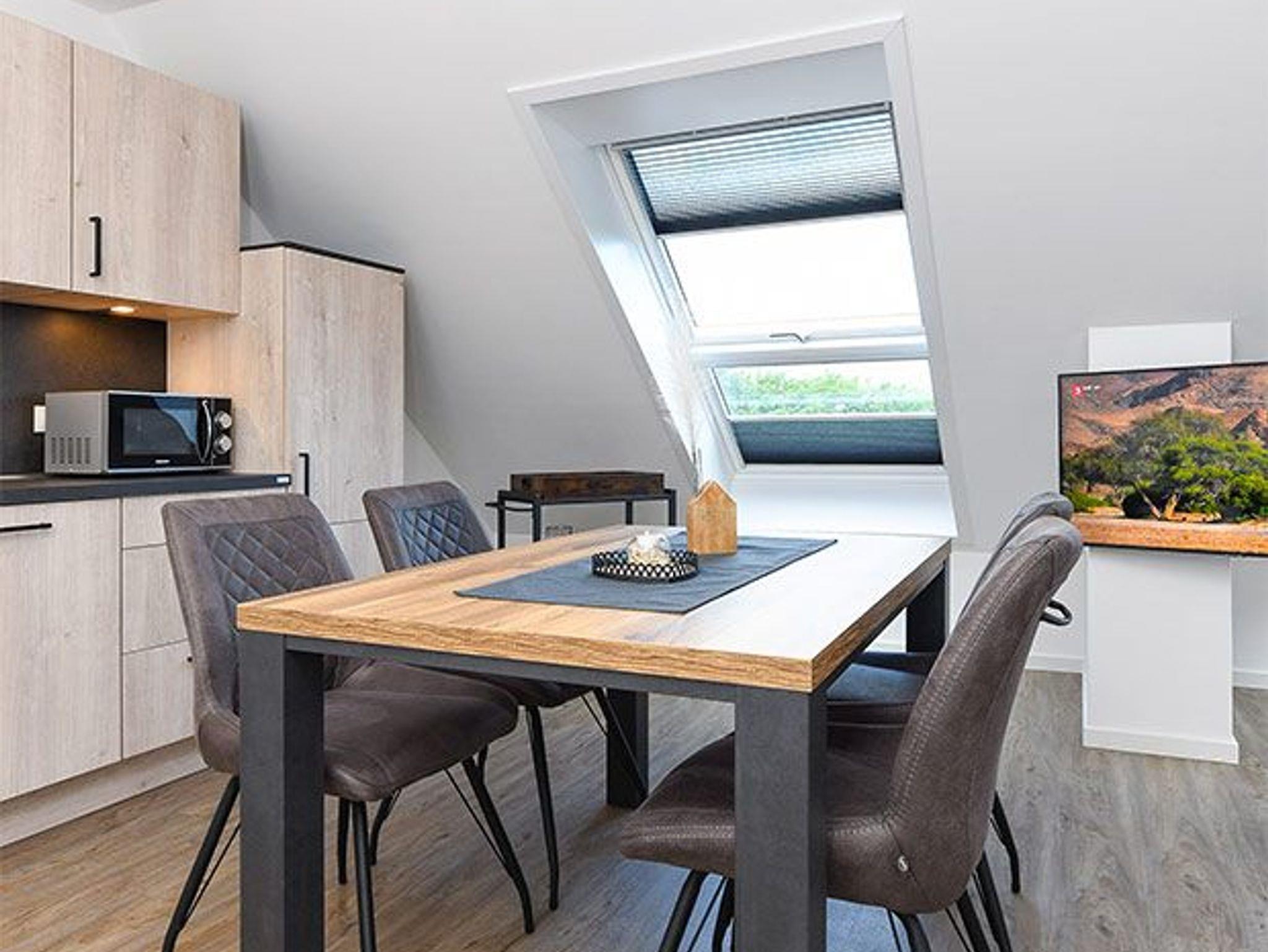 Größe ca. 50 Quadratmeter. Wohnraum mit integrierter Küche. Schlafzimmer, zweites, separates Schlafzimmer, Badezimmer mit Dusche, Waschtisch und WC, Obergeschoss, optimal für 1 bis 4 Personen.