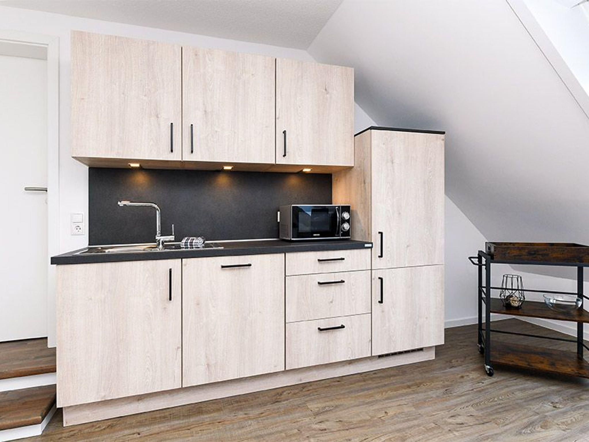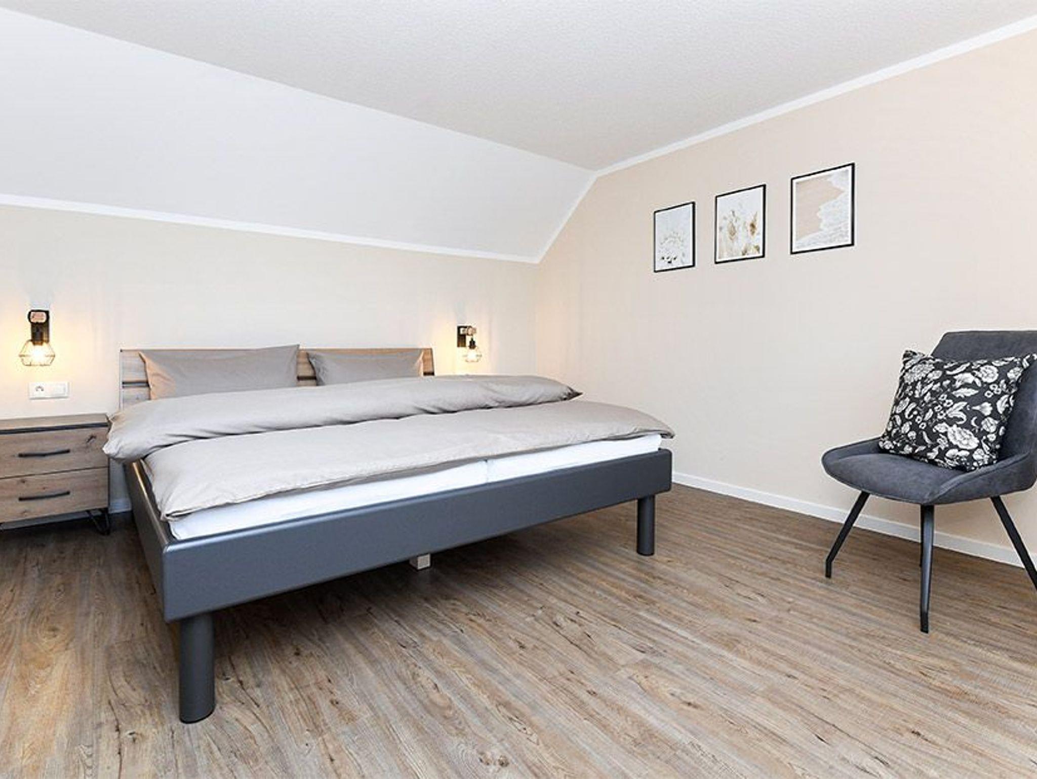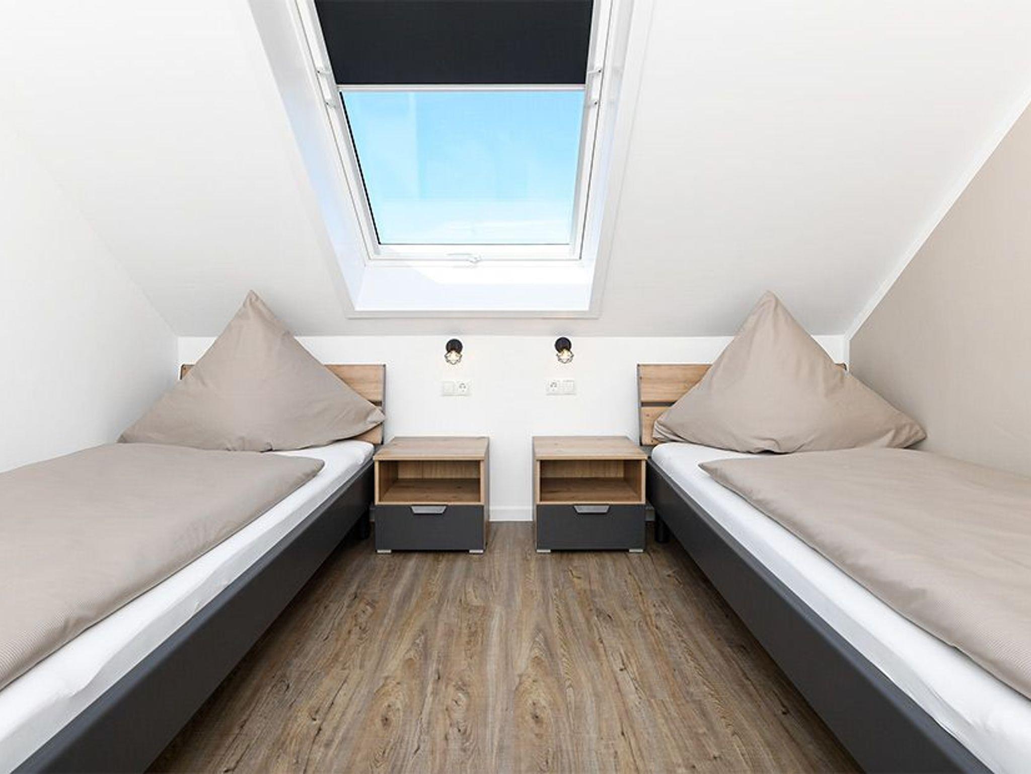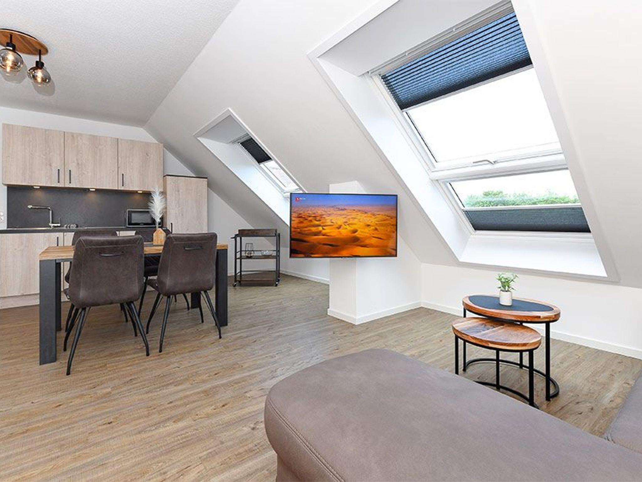 Größe ca. 50 Quadratmeter. Wohnraum mit integrierter Küche. Schlafzimmer, zweites, separates Schlafzimmer, Badezimmer mit Dusche, Waschtisch und WC, Obergeschoss, optimal für 1 bis 4 Personen.