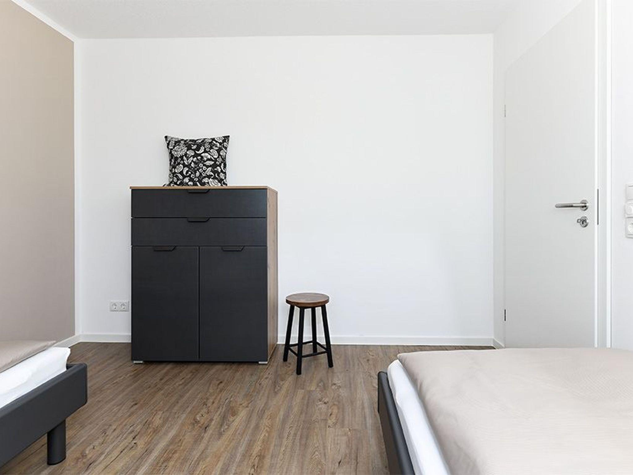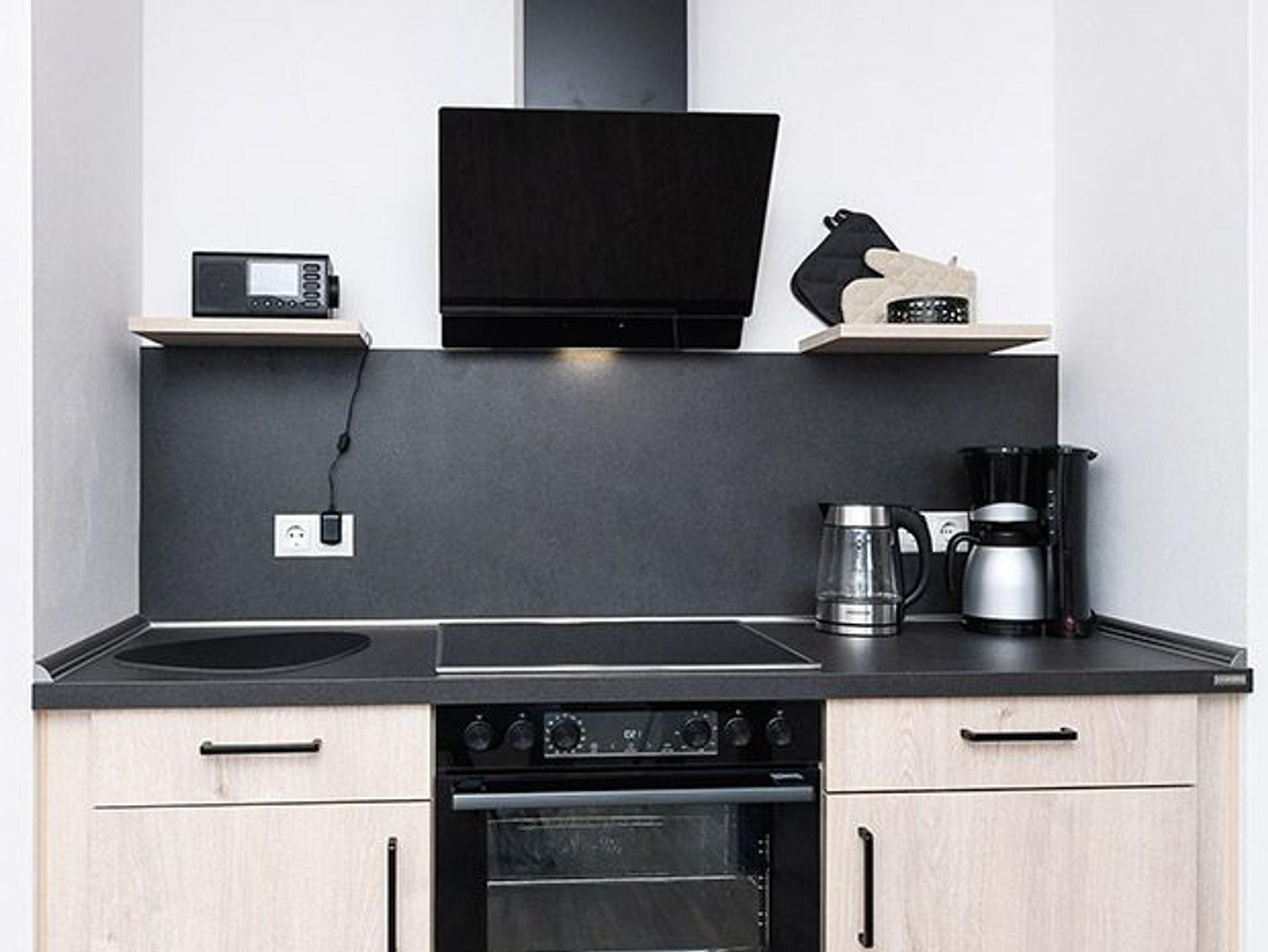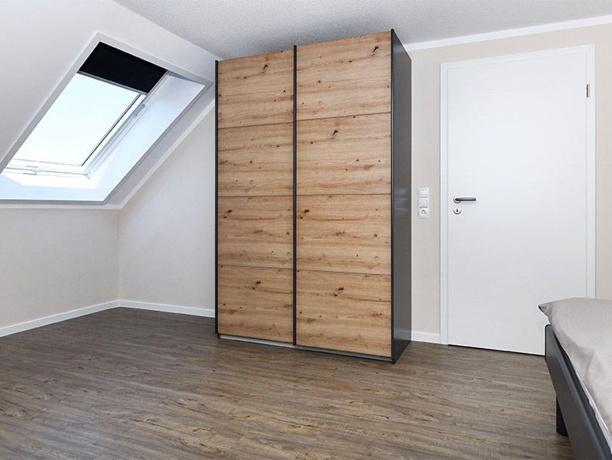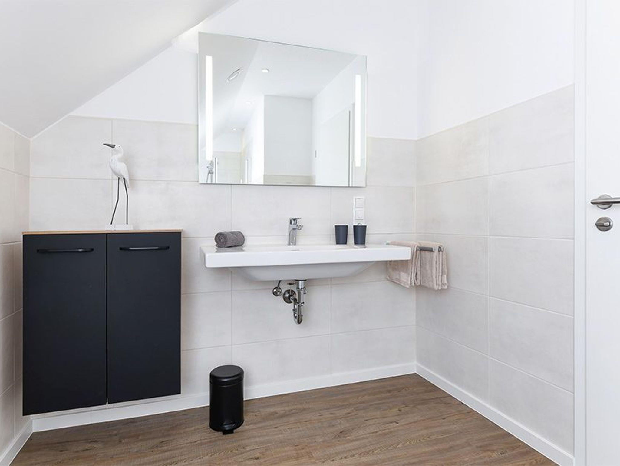 Größe ca. 50 Quadratmeter. Wohnraum mit integrierter Küche. Schlafzimmer, zweites, separates Schlafzimmer, Badezimmer mit Dusche, Waschtisch und WC, Obergeschoss, optimal für 1 bis 4 Personen.
