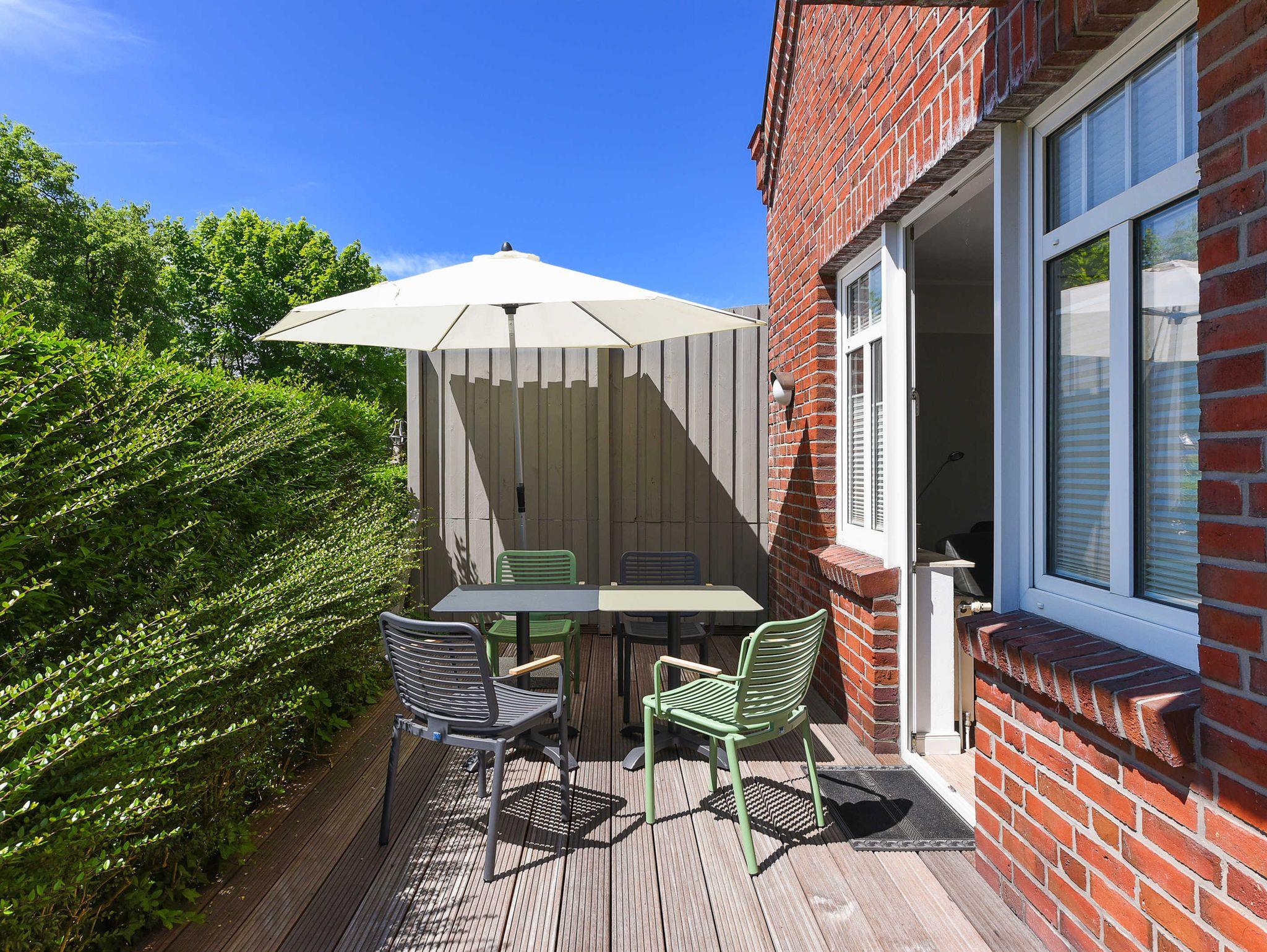 Alle Wohnungen haben entweder eine Terrasse oder einen Balkon. Ein großer Garten mit Sandkasten, Strandkorb, Schaukel und Rutsche steht Ihnen ebenfalls zur Verfügung.
