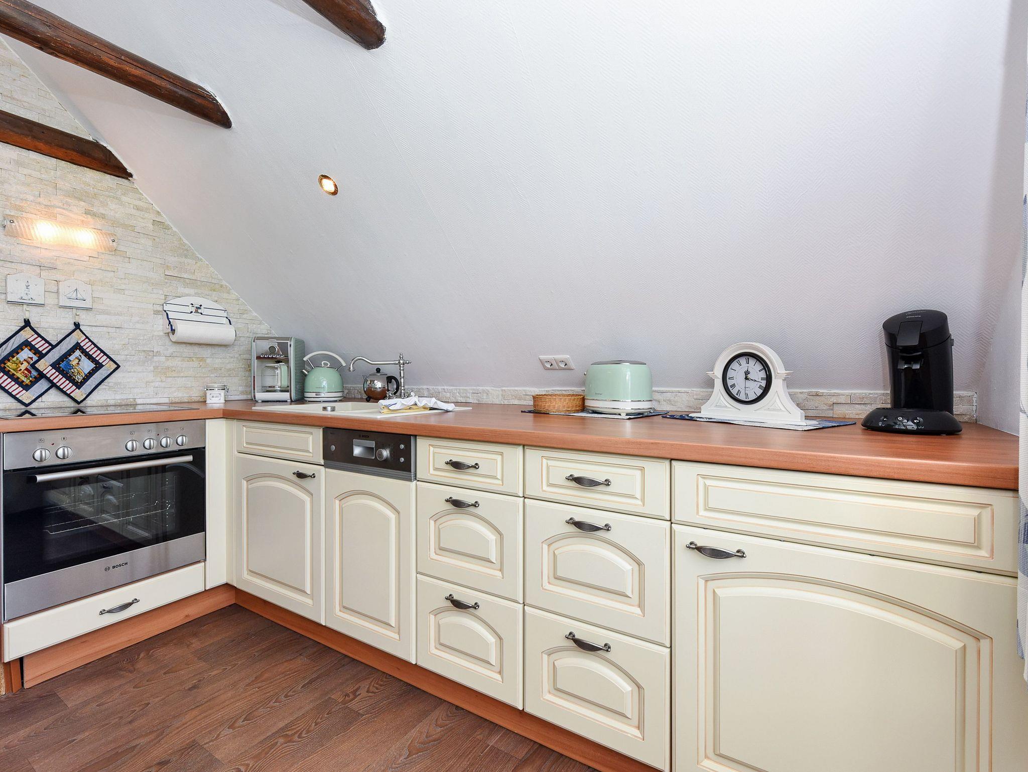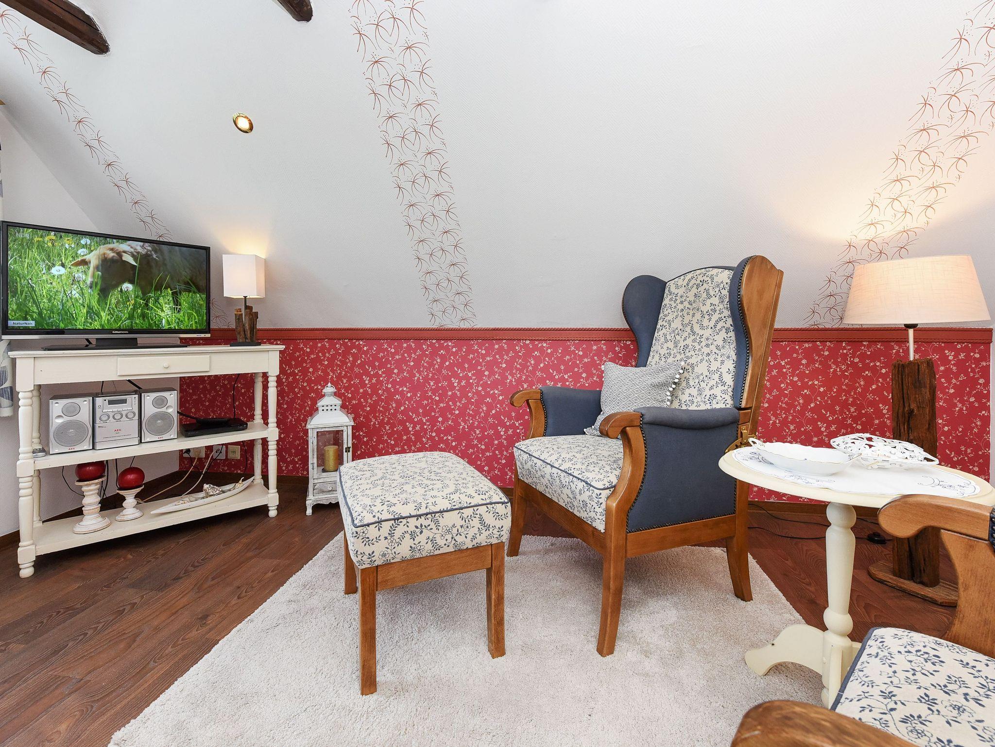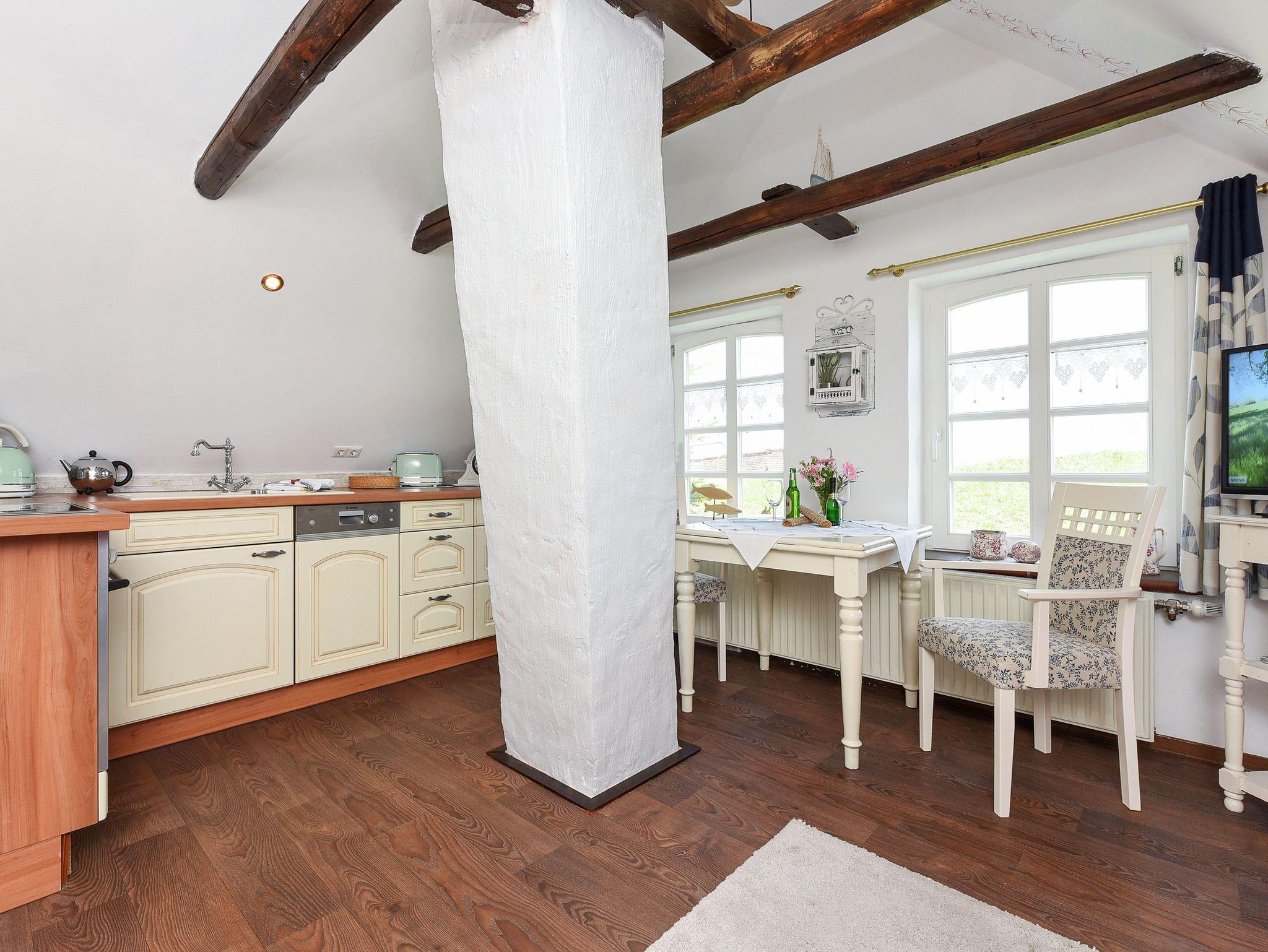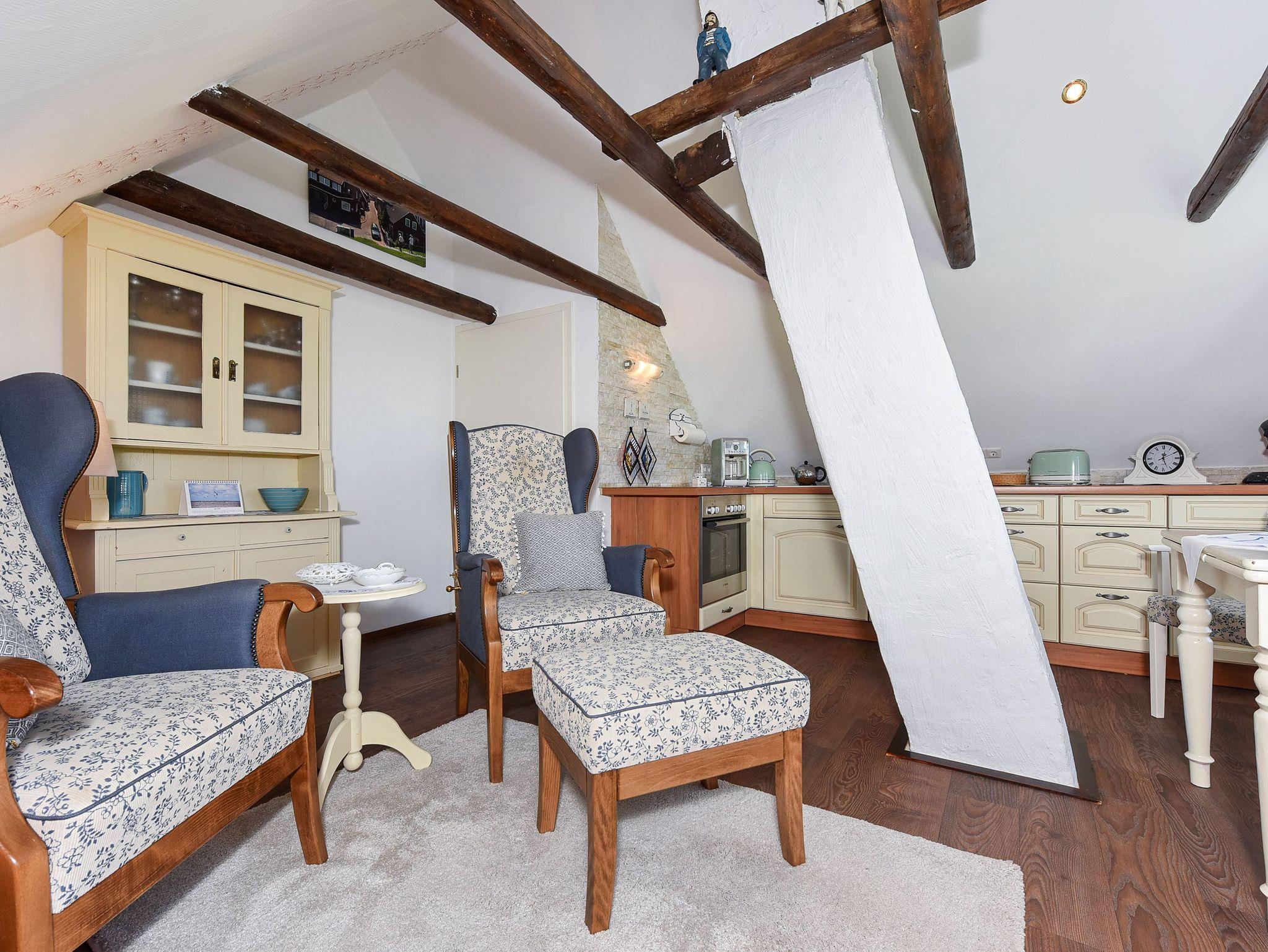 Größe ca. 45 Quadratmeter, Wohn-Küche, Schlafzimmer, Badezimmer mit Dusche, Waschtisch und WC, Obergeschoss, optimal für 2 Personen. WLAN kostenlos verfügbar