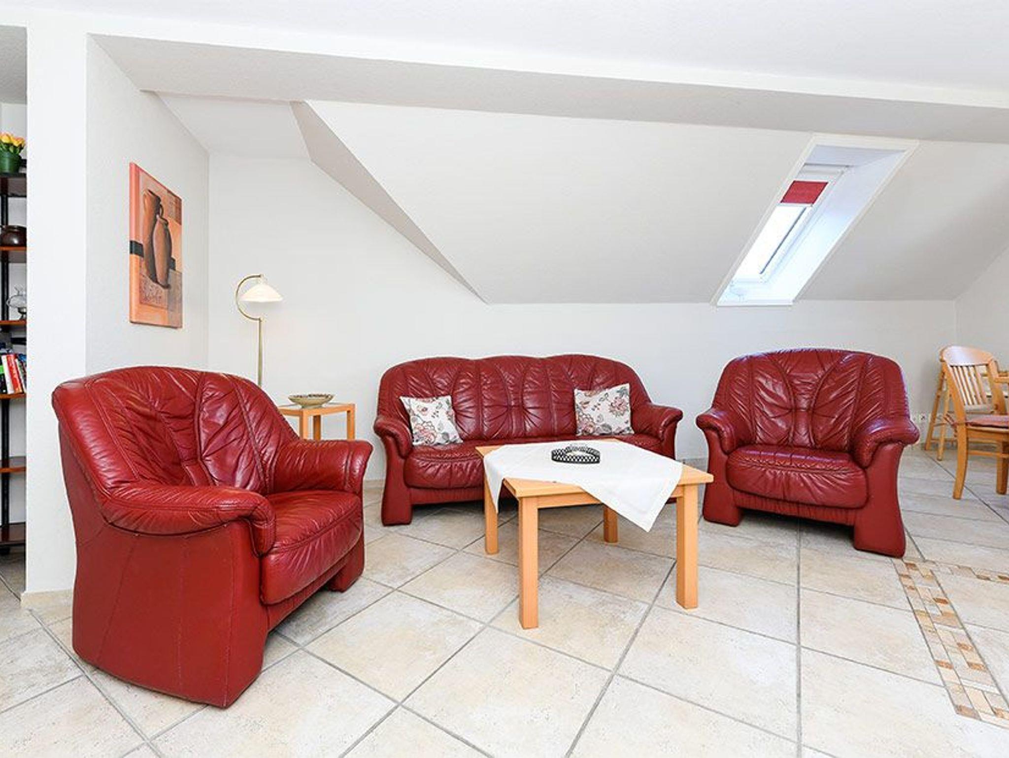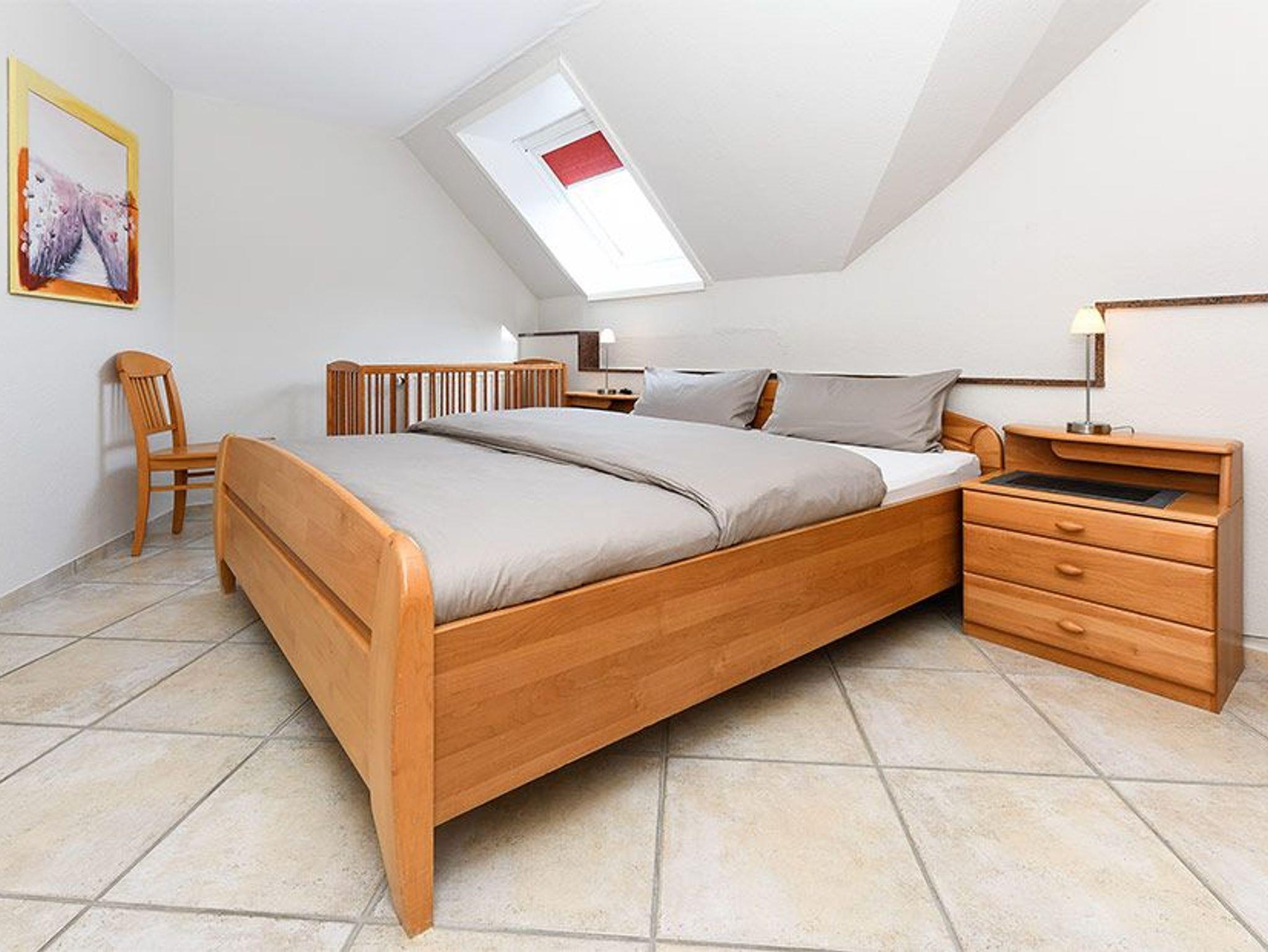 Größe ca. 72 Quadratmeter, Wohnraum mit integrierter Küche, Schlafzimmer, zweites separates Schlafzimmer/Kinderzimmer, Badezimmer mit Badewanne, Dusche, Waschtisch, WC, Obergeschoss, Sitzgruppe im Garten, Koffer-/Abstellraum, optimal für 2 bis 4 Personen und zusätzlich ein Kleinkind.
