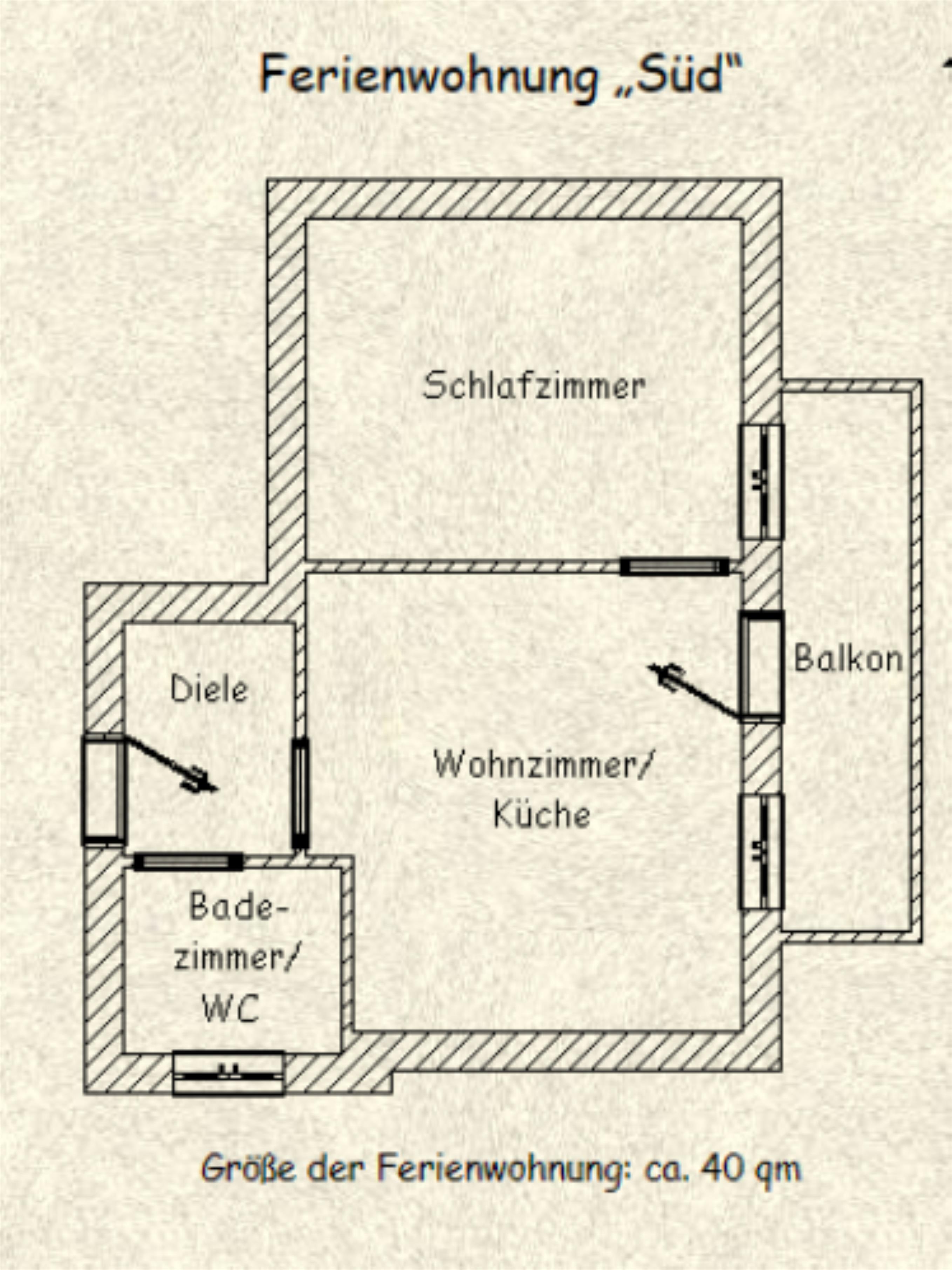 Willkommen in der gemütlichen Ferienwohnung Süd im Haus Delphin! Auf 43 Quadratmetern erwartet Sie im ersten Stock ein behagliches Zuhause für zwei Personen.