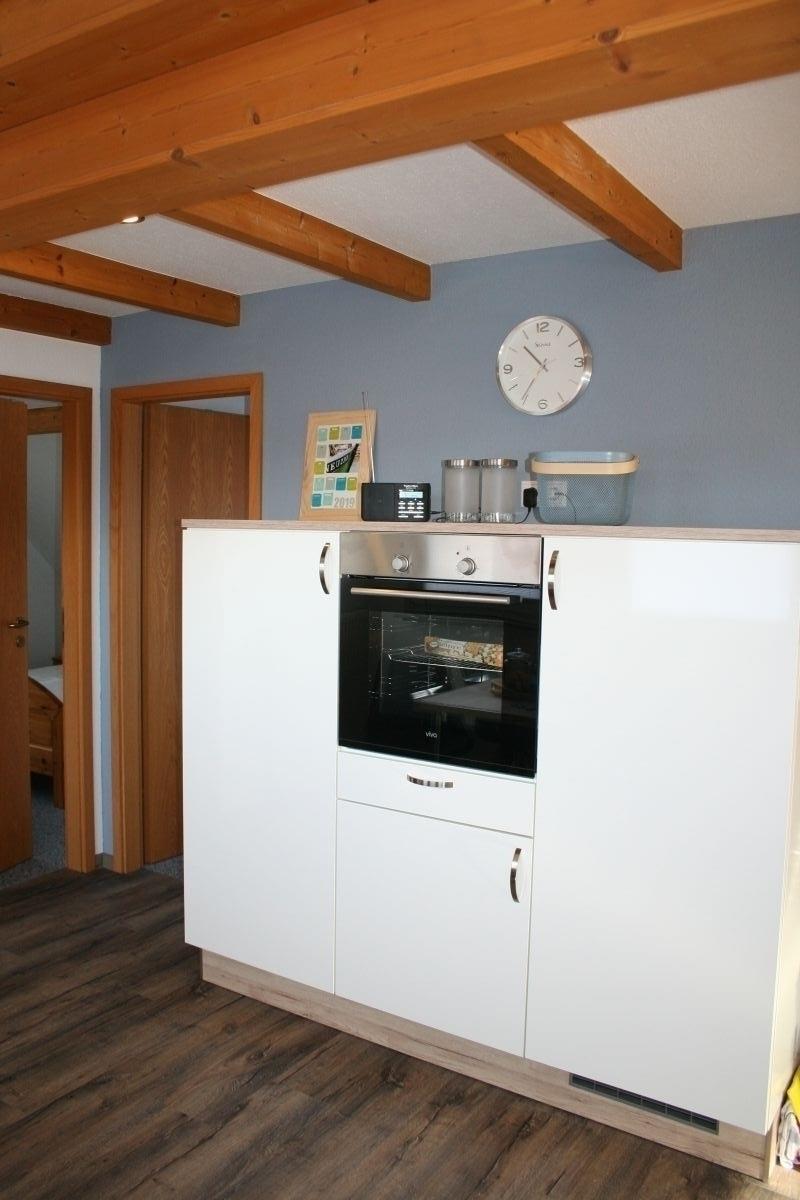Küchenzeile mit 4- Platten-Ceranfeld, Backofen, Spülmaschine, Kühlschrank, Toaster, Wasserkocher, Eierkocher, Kaffeemaschine, Senseo - Kaffeepadmaschine