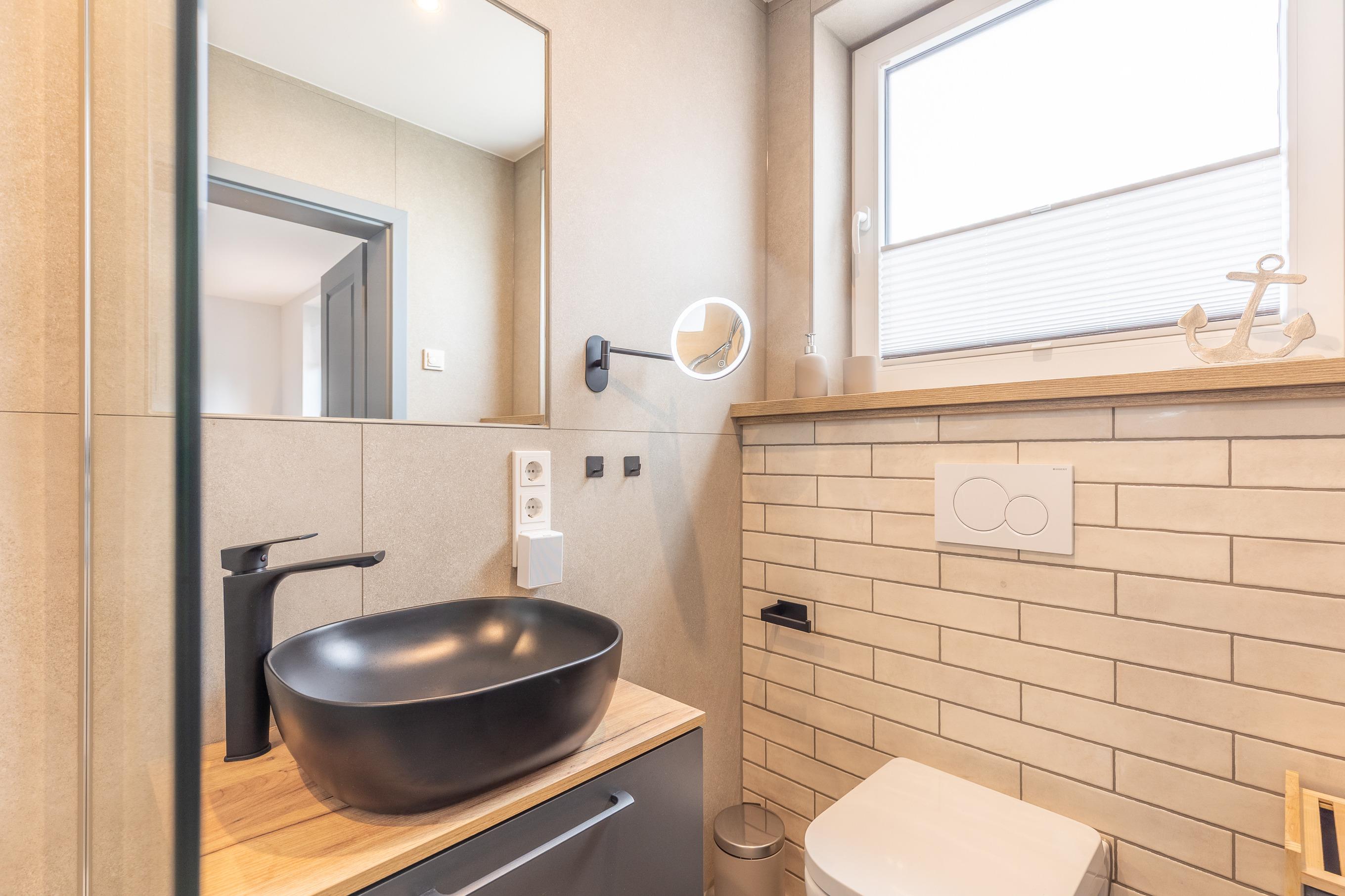 Das moderne Badezimmer verwöhnt Sie mit einer komfortablen Dusche und einem Föhn. Nach einem langen Tag an der frischen Nordseeluft können Sie hier wunderbar entspannen und neue Energie tanken.