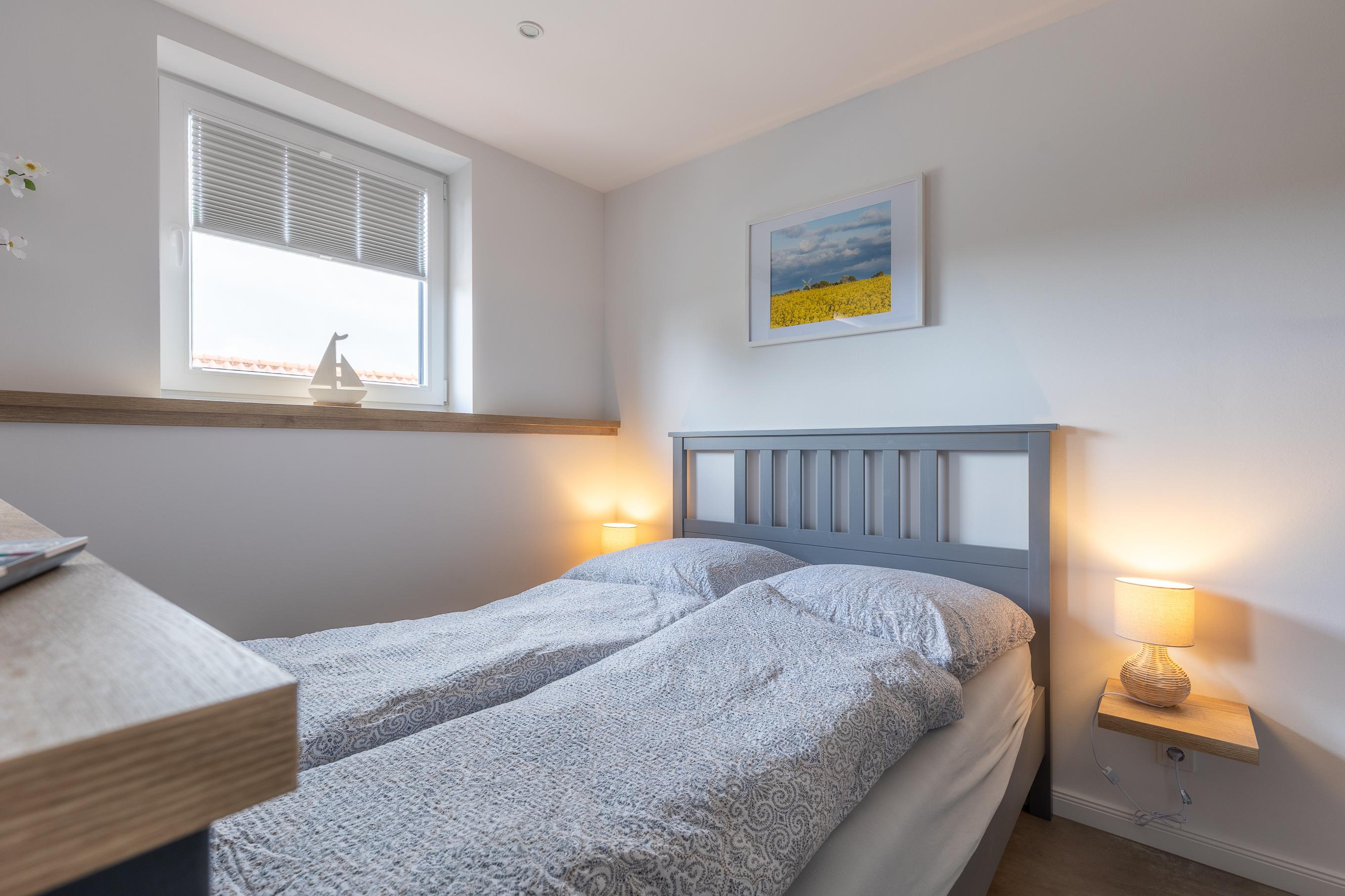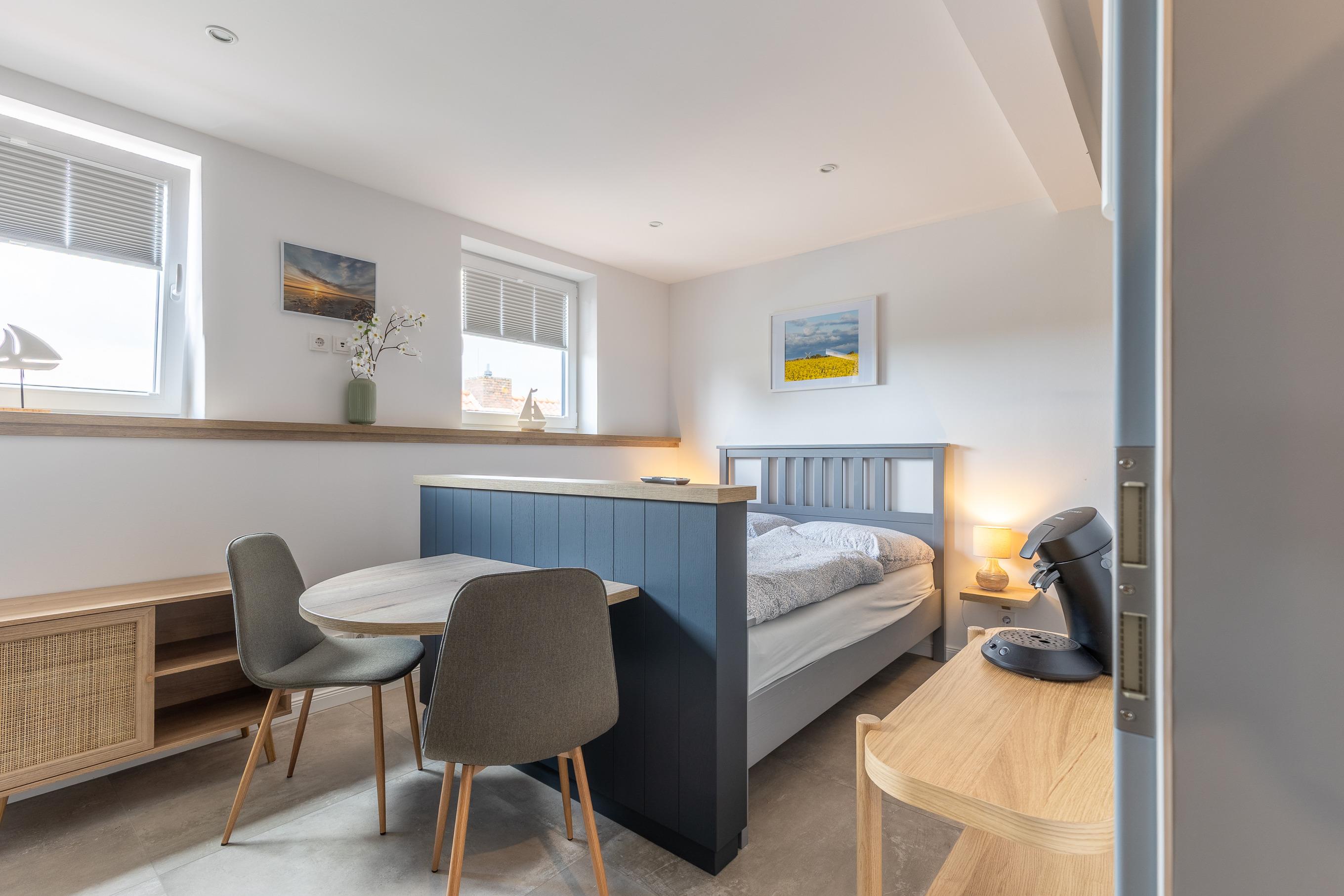 Freuen Sie sich auf ein helles, liebevoll eingerichtetes Zimmer, das modernes Design mit norddeutscher Gemütlichkeit vereint. Hier finden Sie alles, was Sie für entspannte Tage am Meer brauchen: Ein komfortables Bett sorgt für erholsame Nächte, während ein kleiner Sitzbereich zum Lesen, Planen oder einfach zum Durchatmen einlädt. Große Fenster lassen viel Tageslicht herein und schaffen eine freundliche, einladende Atmosphäre.