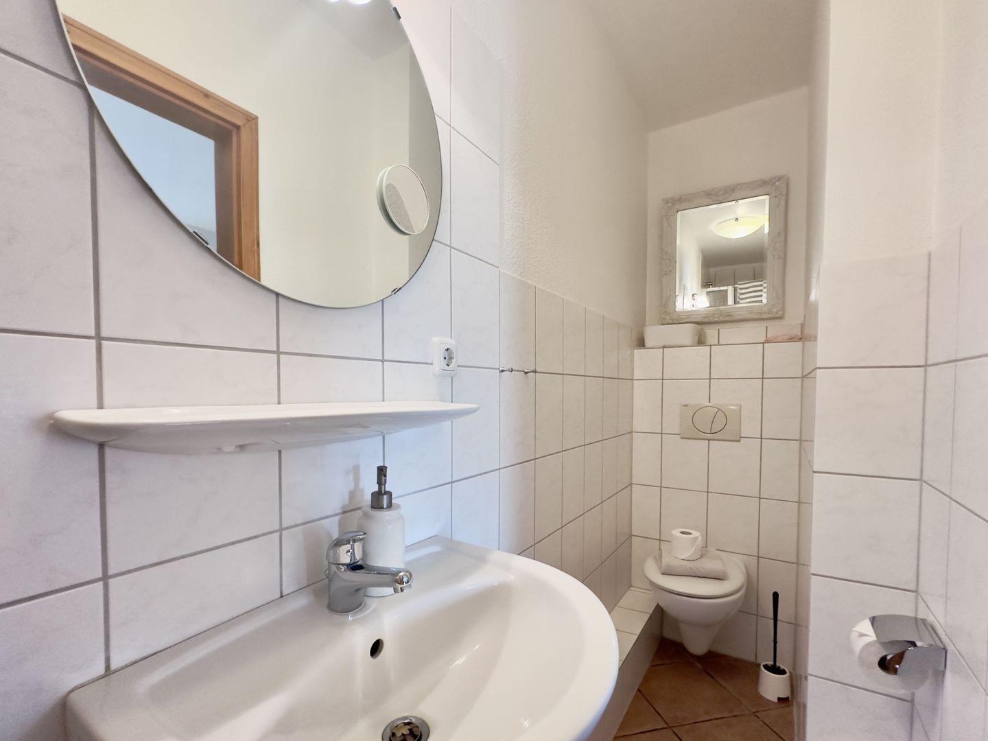 Das helle Badezimmer bietet Ihnen alles für Ihre tägliche Pflege, einschließlich einer Dusche, eines Spiegels und eines praktischen Kosmetikspiegels. Hier starten Sie frisch in den Tag und können sich rundum gepflegt fühlen.
