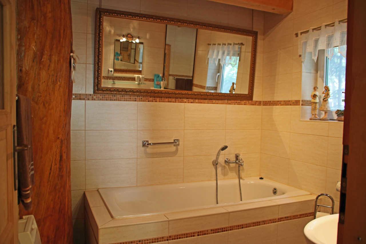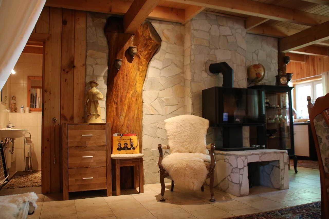 Die Ferienwohnung ist in einem stilvollen Holzhaus untergebracht und befindet sich im Erdgeschoss. Mit seinen 70 Quardratmetern bietet die Wohnung genügend Raum für drei Personen. Neben einem Wohn-Schlafbereich verfügt die Wohnung über eine ausgestattete offene Küche, einem Bad mit Badewanne und einer extra Gästetoilette.