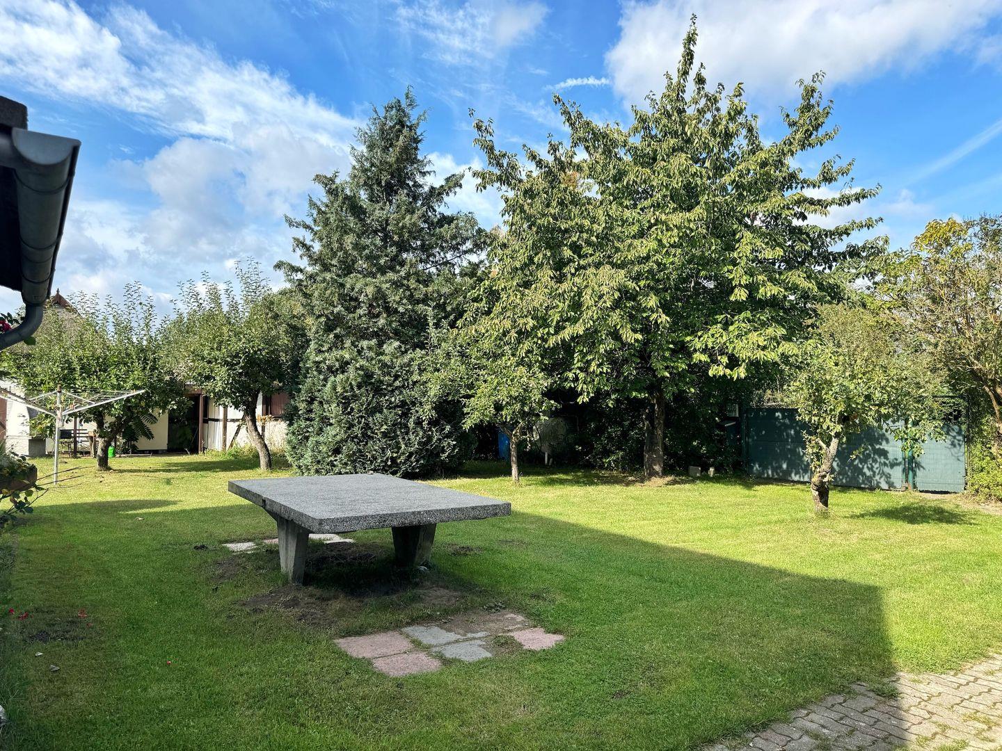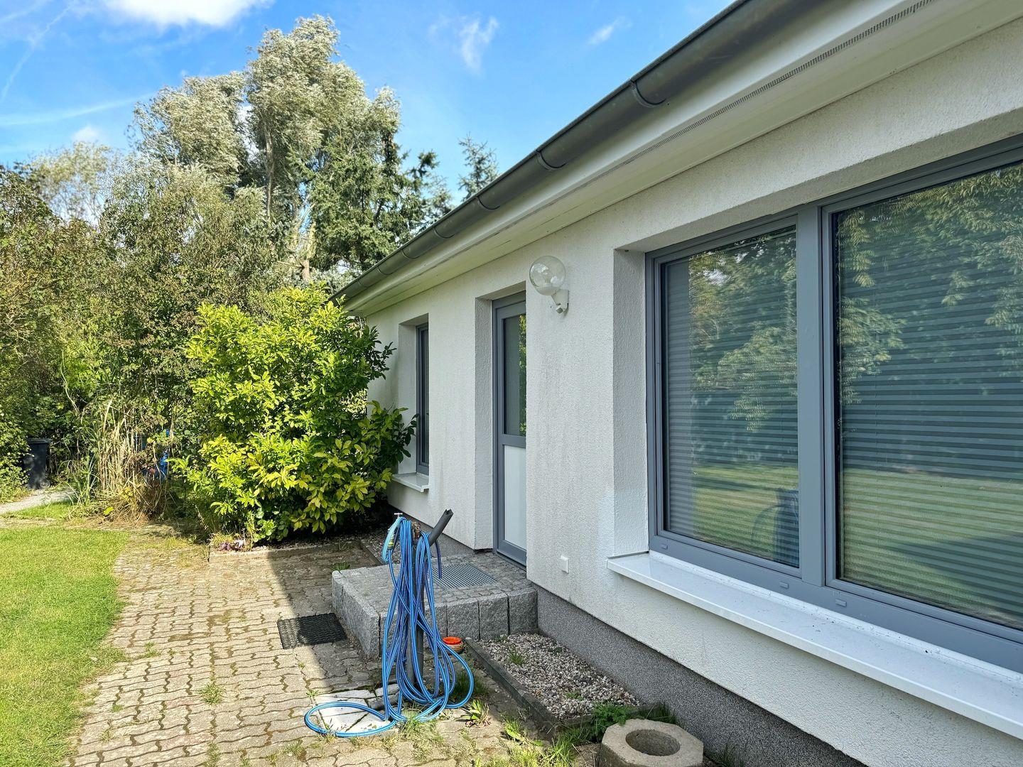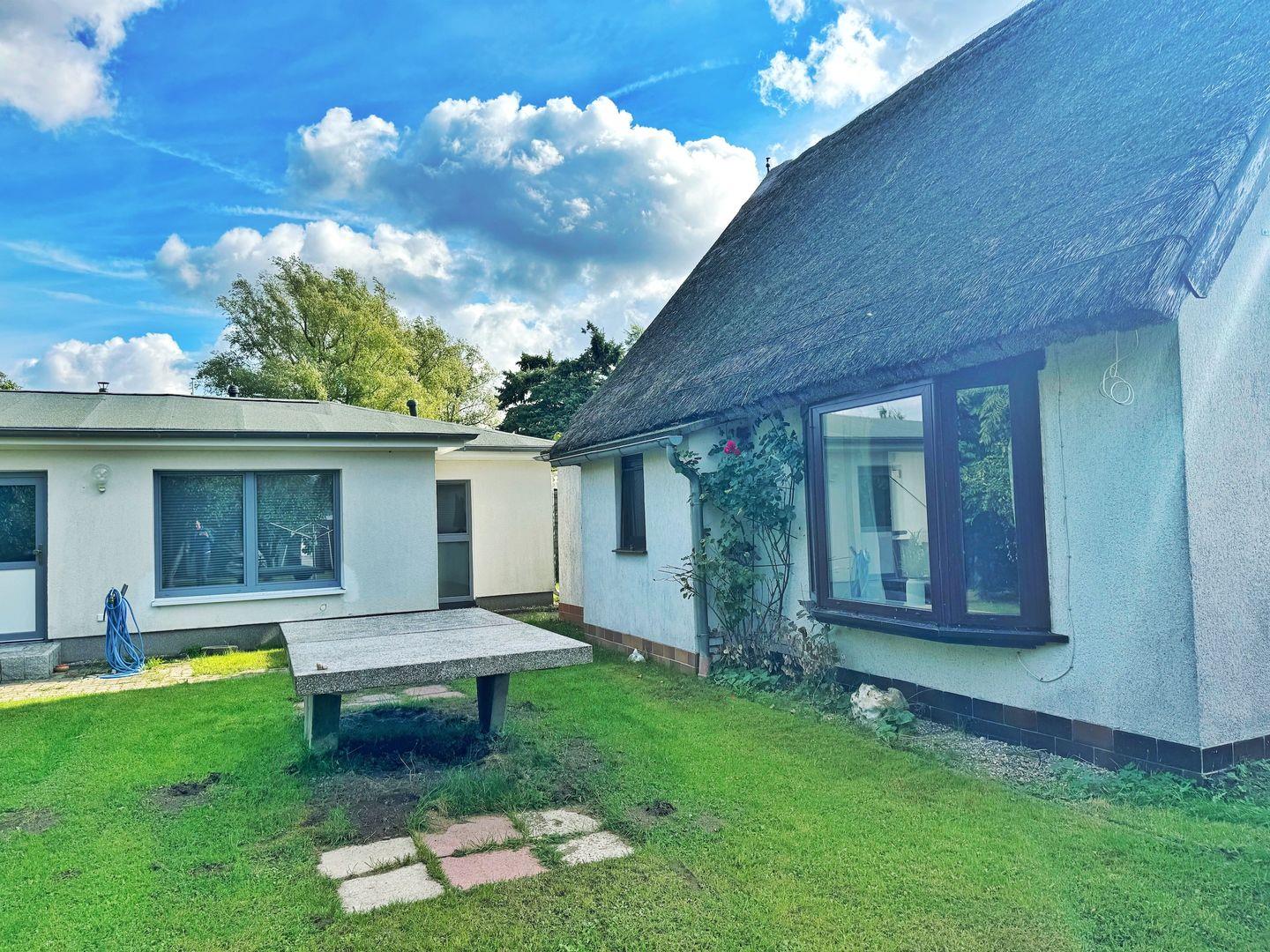 "Min Hütt II" befindet sich direkt neben dem reetgedeckten Ferienhaus auf dem gleichen Grundstück und ist ein ca. 55 qm großer Bungalow. Dieser unterteilt sich in 2 separate Schlafzimmer mit jeweils einem Doppelbett, einen Wohn- und Essbereich mit Sitzgelegenheit, Esstisch und Flachbildfernseher, eine kleine Kochnische mit Kühlschrank, 2-Plattenherd, Badezimmer mit Dusche und Toilette.
