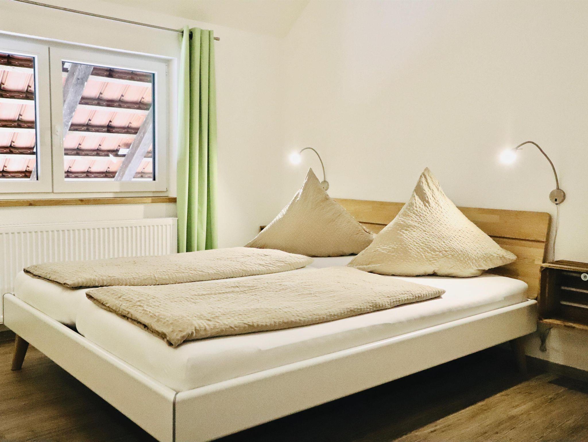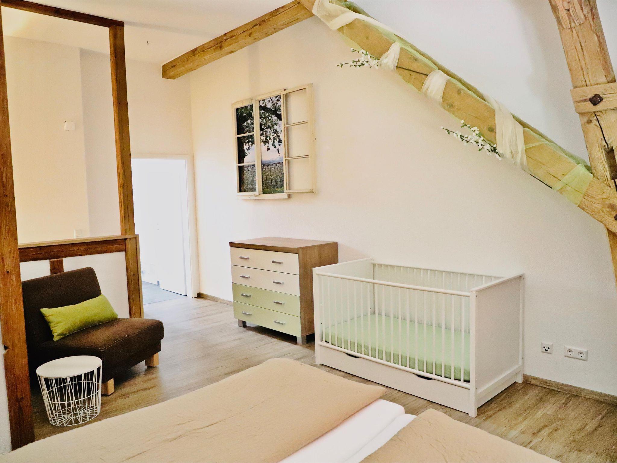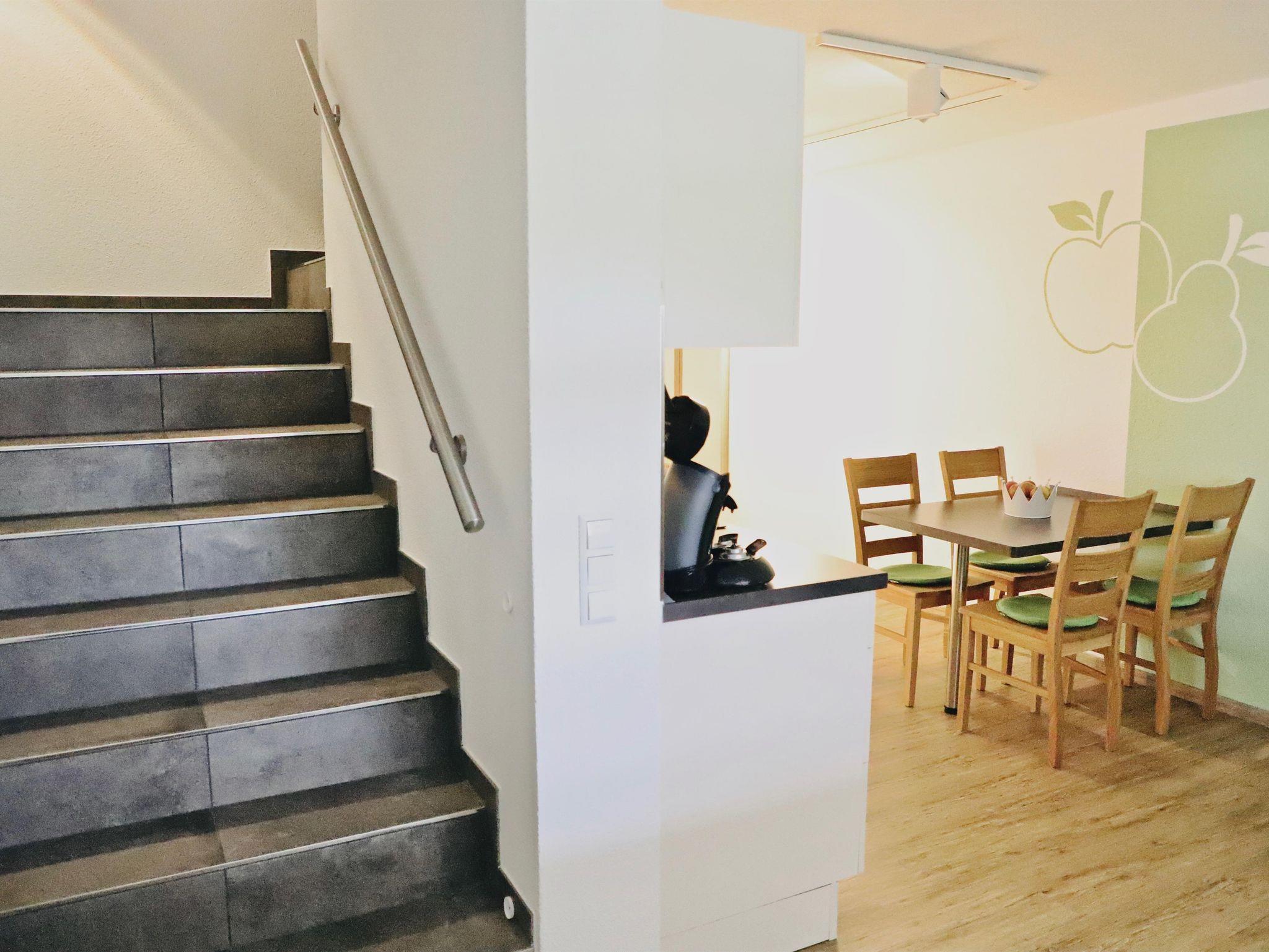 Unsere Maisonette-Ferienwohnung „Im Obstgärtle“ - benannt und entsprechend eingerichtet nach unserem Tätigkeitsbereich Herstellung von Obstbränden - ist etwa 55 m² groß und erstreckt sich über das Ober- und Dachgeschoss. Im unteren Stockwerk befindet sich ein gemütlicher Wohn-, Essbereich mit gut ausgestatteter Küchenzeile. Im oberen offenen Stockwerk liegt das Schlafzimmer – extra auch für „Große“ mit einer Bettenlänge von 2,20 m – sowie das Badezimmer mit begehbarer Dusche. Möglichkeit einer Schafcouch und eines Ausziehbettes ermöglichen auch eine Übernachtung von bis zu vier Personen. Baby- bzw. Kleinkindausstattung inkl. Treppenschutzgitter ist vorhanden. Im Garten steht Ihnen eine bevorzugte Sitzmöglichkeit zur Verfügung.