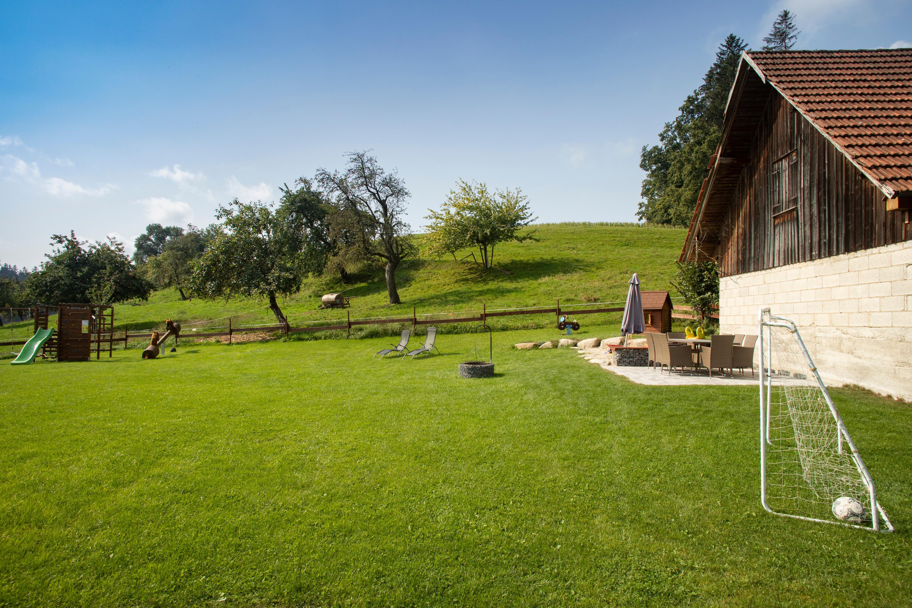 Auch die Außenanlage ist bereits größtenteils fertiggestellt - der Rasen mit Trampolin und Fußballtoren sowie die Terrassen sind angelegt. Bis Ostern 2019 werden die Parkplätze außerdem noch gepflaster. Weitere Spielgeräte und ein fester Grillplatz erfolgen bis zu den Pfingstferien 2019 (ein mobiler Grill ist bereits vorhanden).