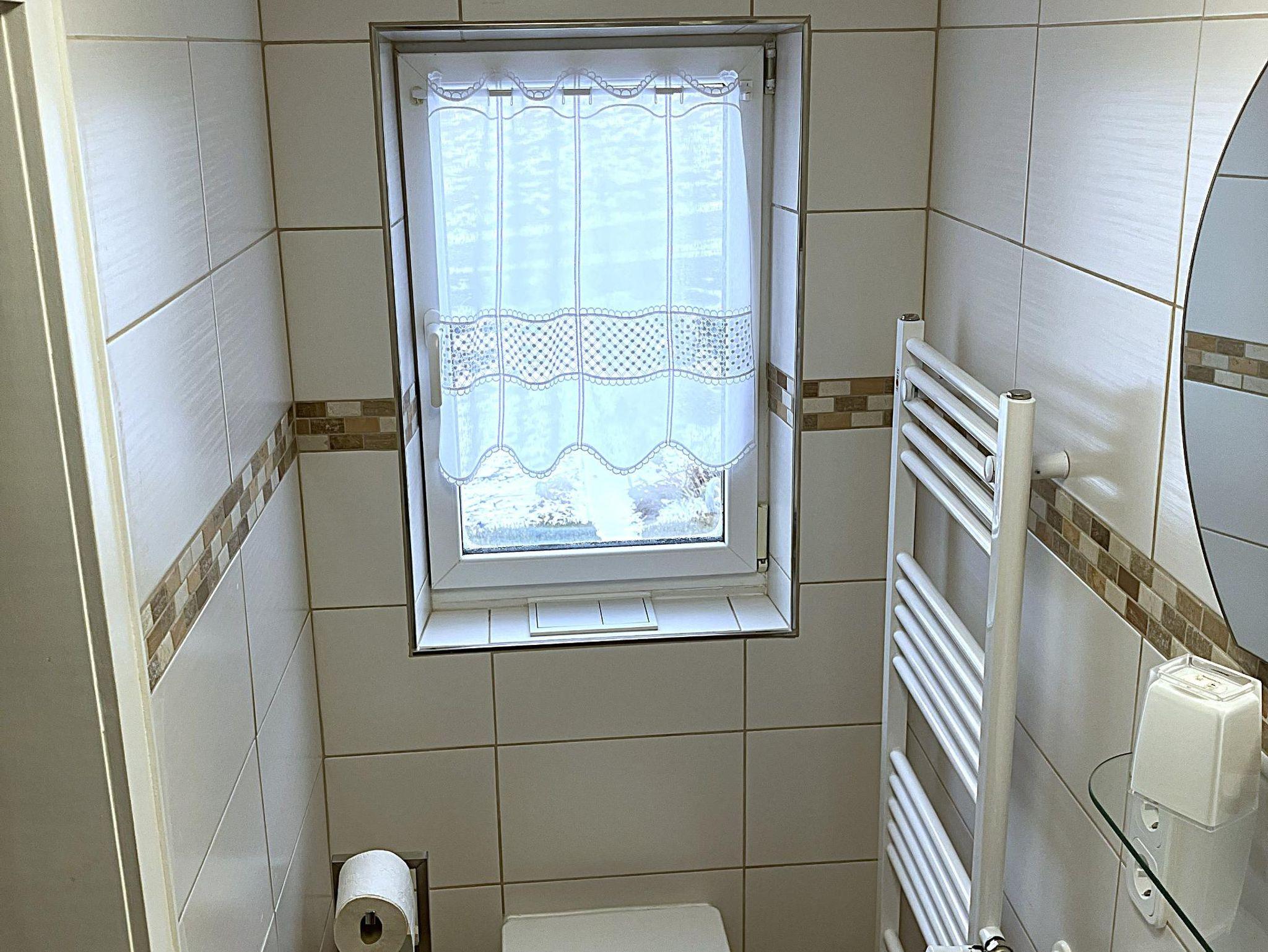 Das Badezimmer mit Dusche, WC, Waschbecken mit Spiegel rundet das Gesamtbild ab.