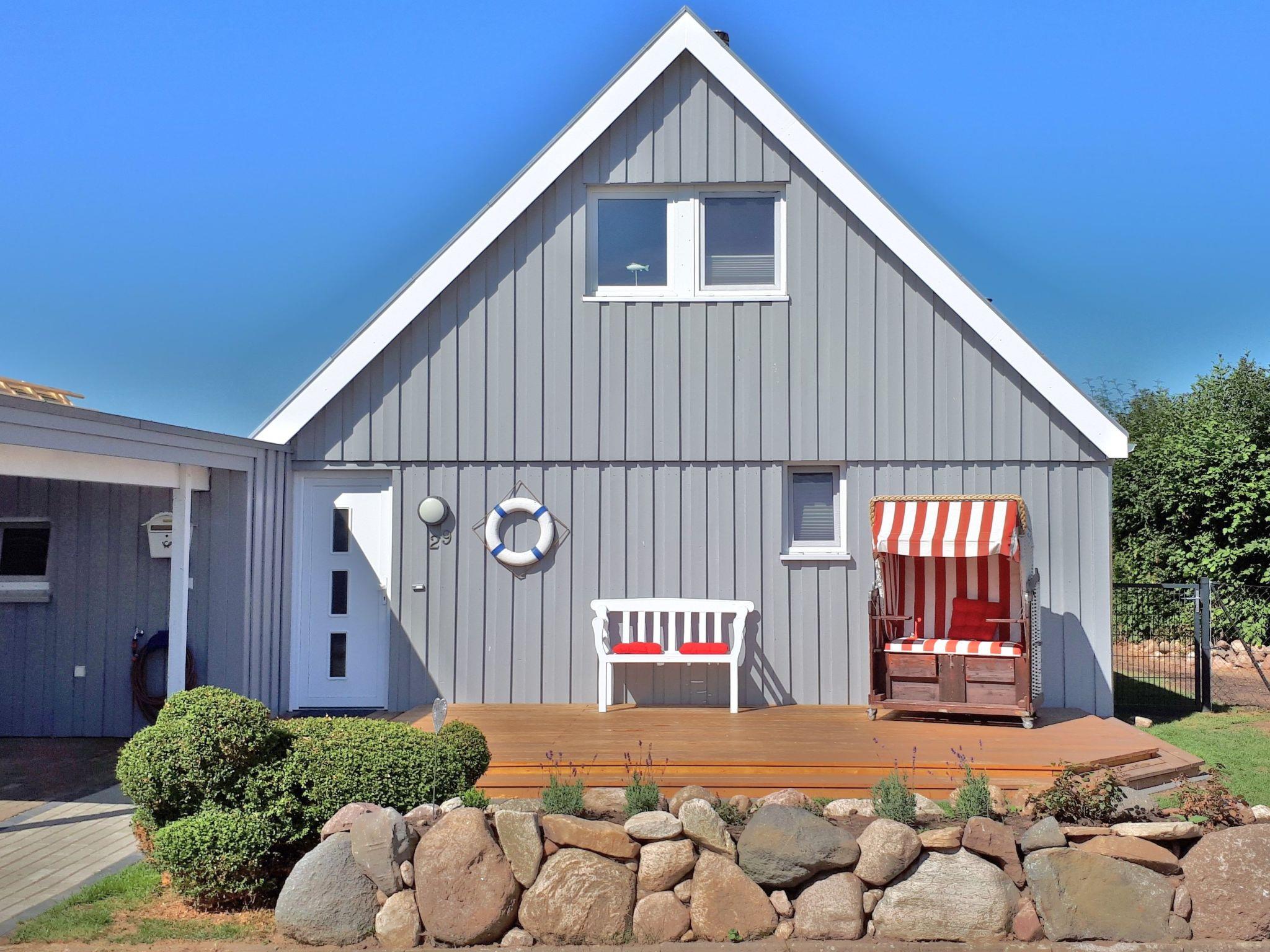 The wooden house is located in a quiet holiday home complex with a direct dream view of the Baltic Sea. It has been regularly renovated and redesigned by the owners. You have an unobstructed view of Großenbrode and the sunny island of Fehmarn. The property is fenced and situated at the end of a cul-de-sac. The property is surrounded by fields. A carport belongs to the house.
