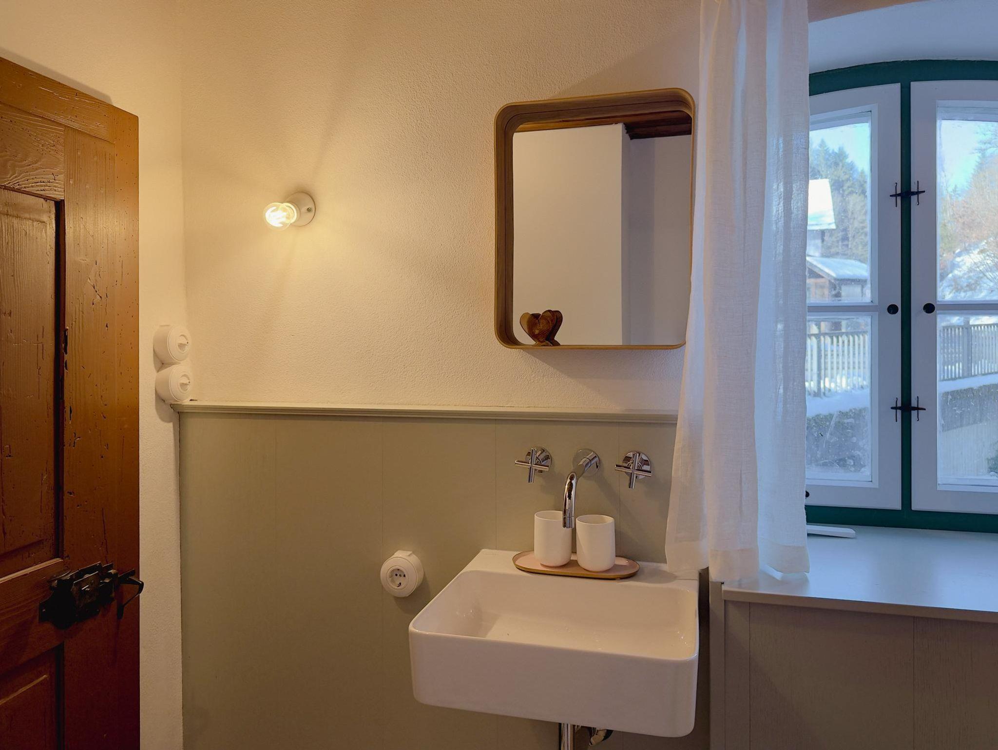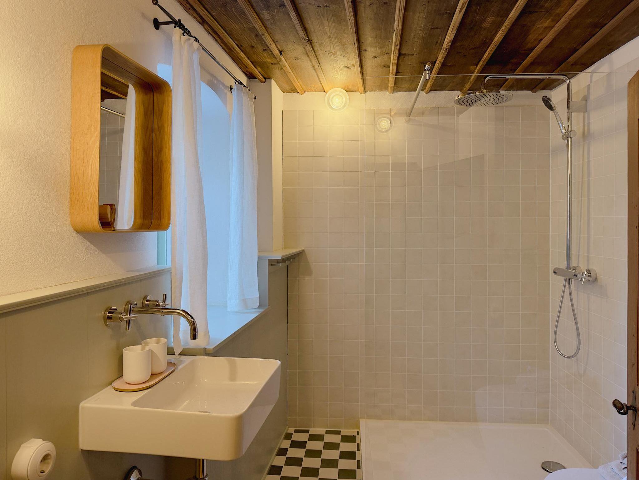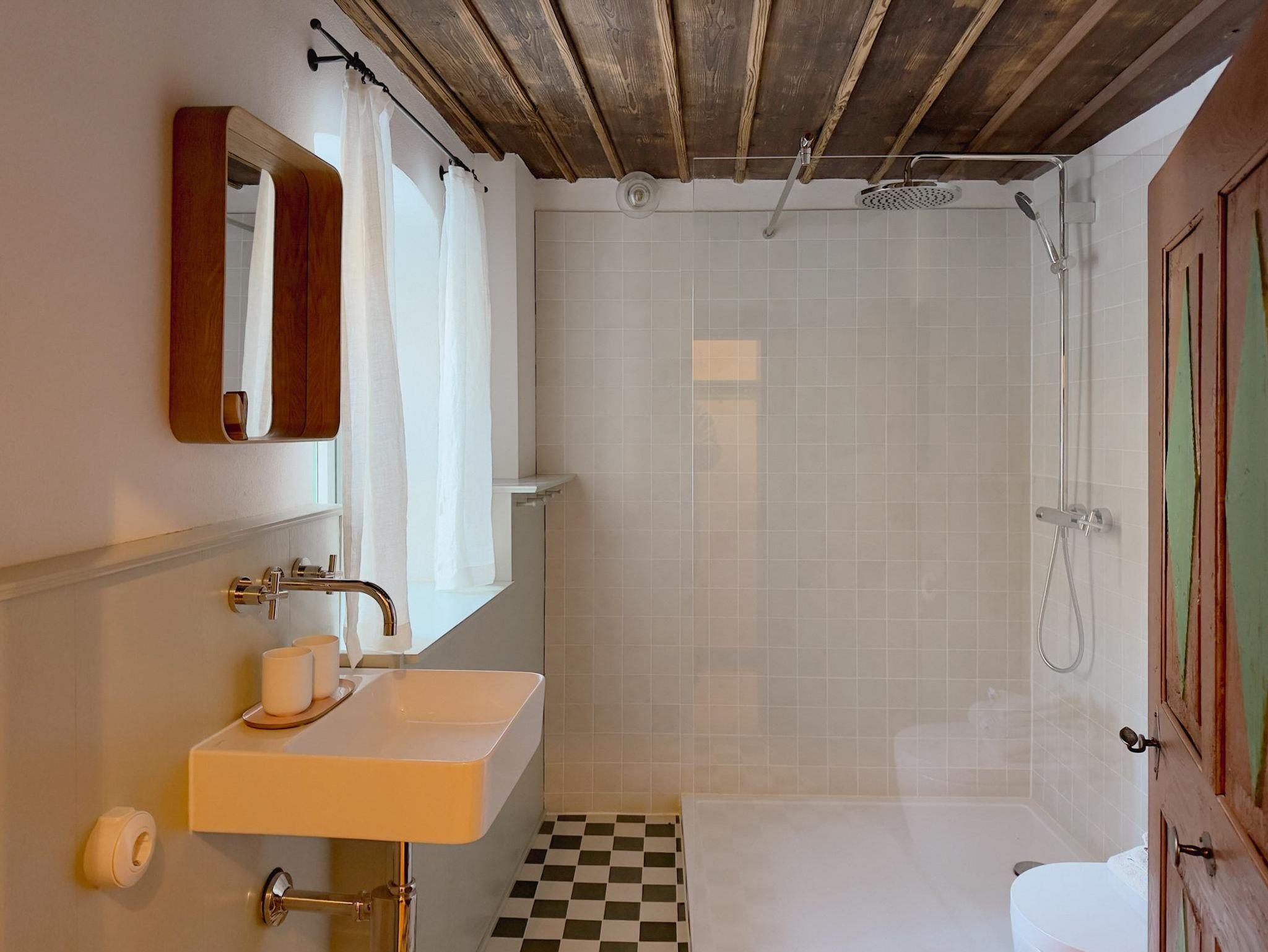 • Badezimmer: Modernes Design trifft auf historische Mauern.