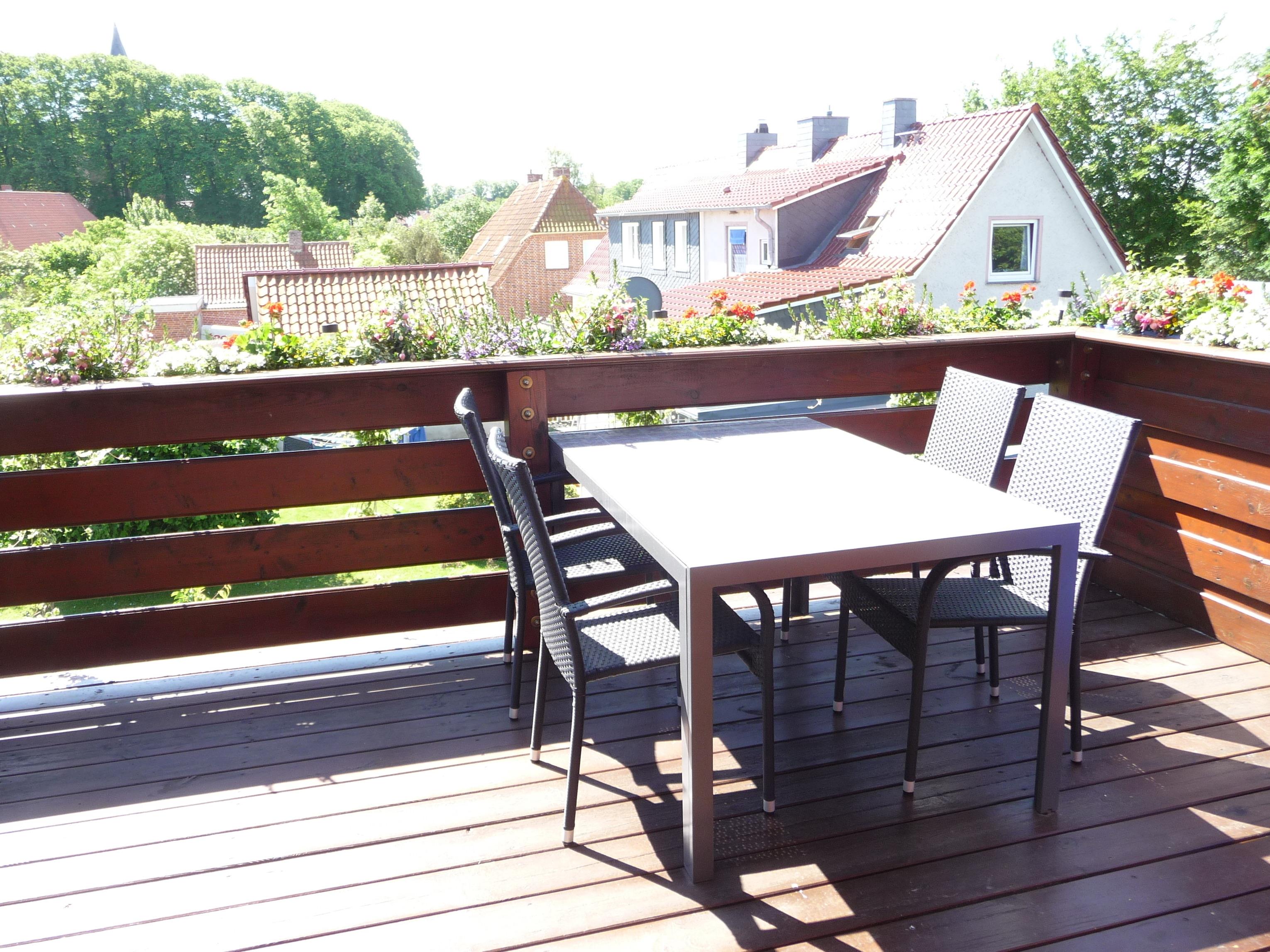 -ein gemütliches, ebenfalls im Landhausstil eingerichtetes Wohnzimmer, mit LED - TV u. DVD, daran angeschlossen ein großer Balkon auf dem man sich so richtig erholen kann, in Südlage, d.h. den ganzen Tag Sonne (wenn sie denn scheint), mit Liegestühlen und einem Tisch mit 4 Stühlen