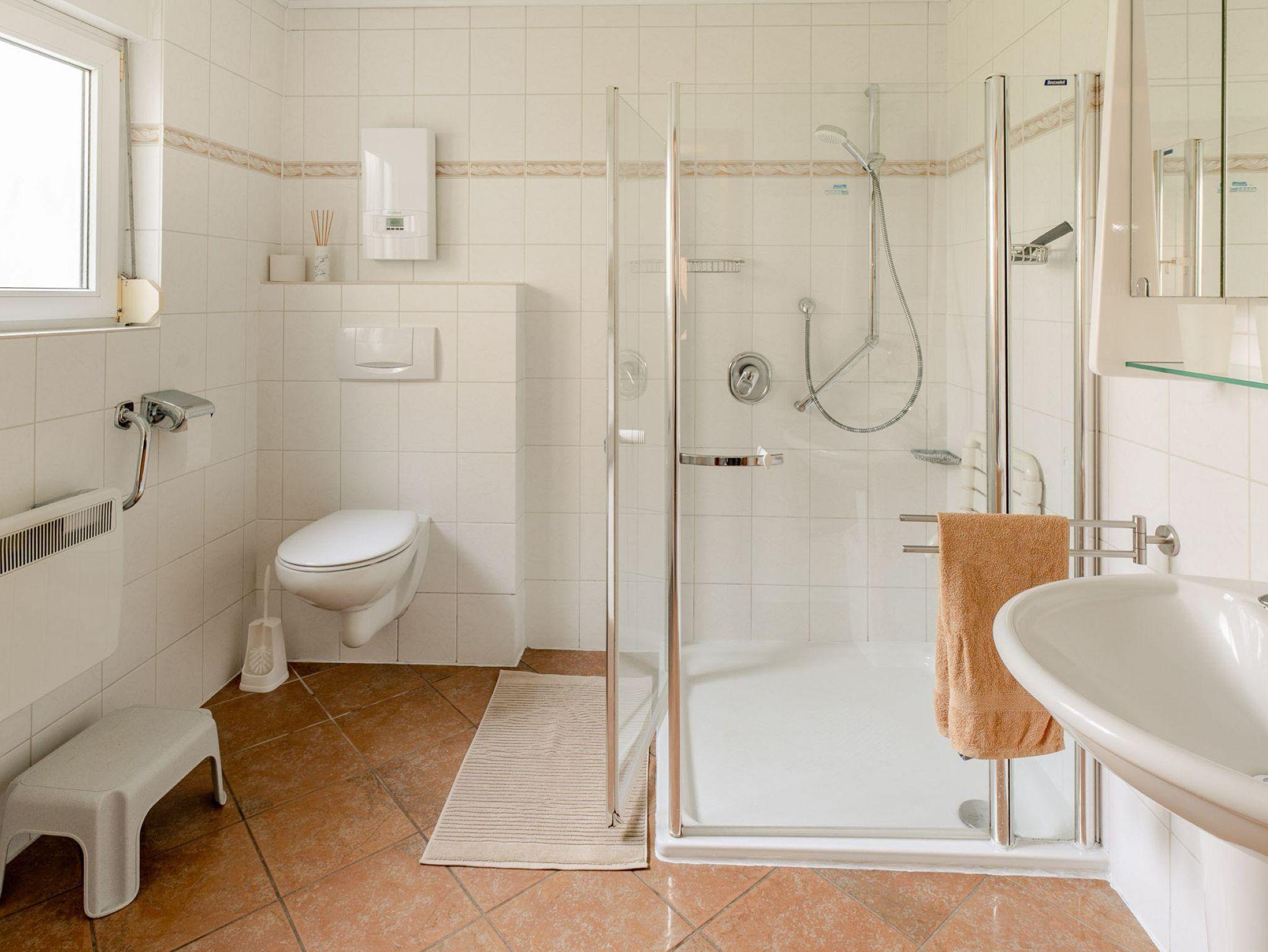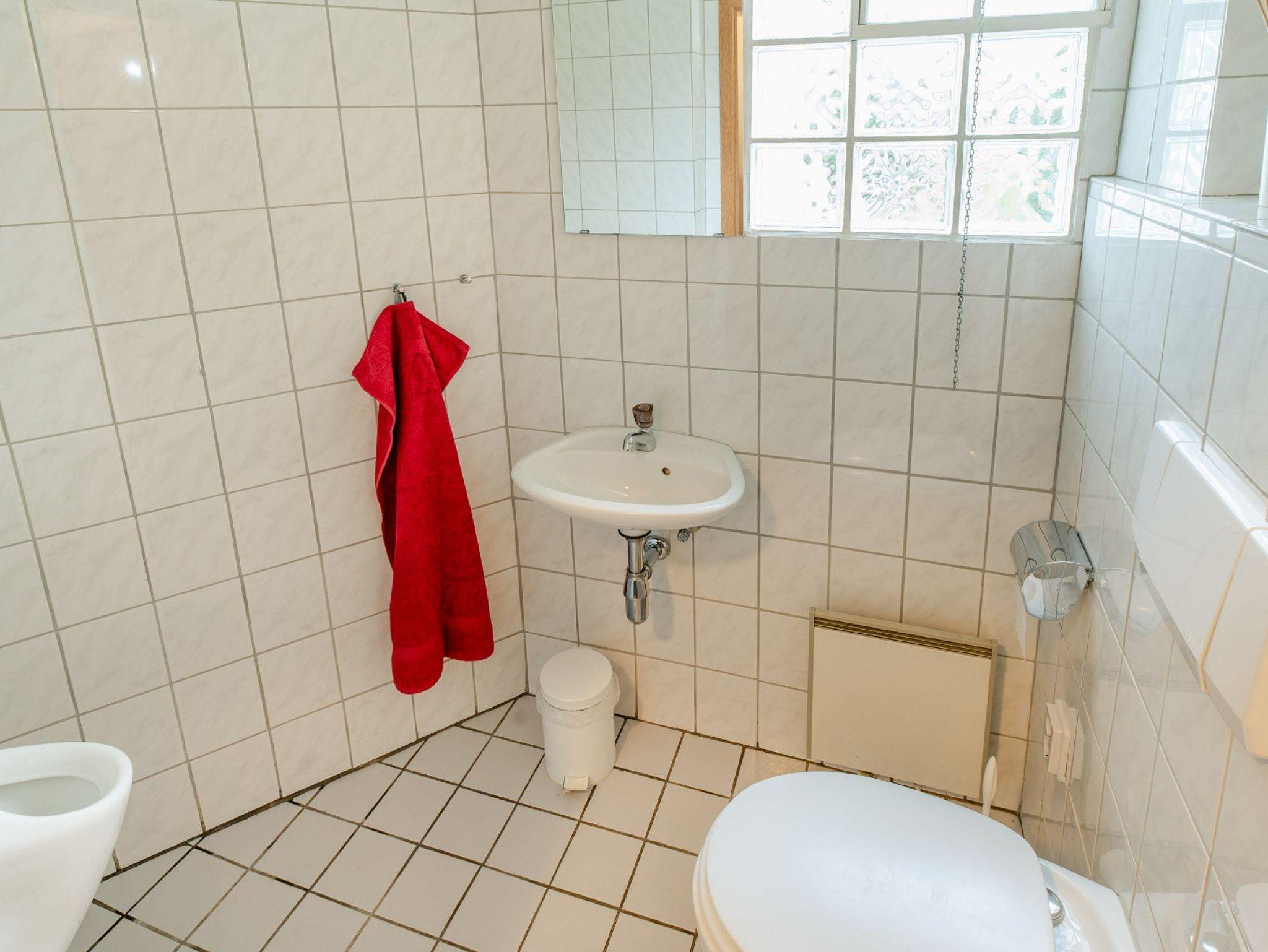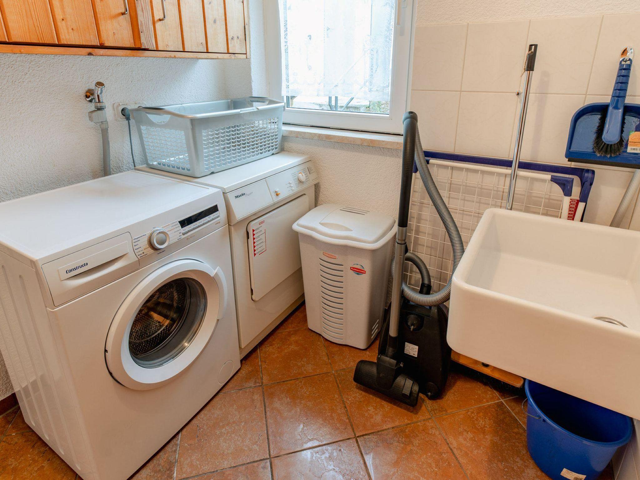 Das Bad verfügt über Dusche, WC, Föhn und Handtücher; zusätzlich gibt es ein separates Gäste-WC. Ein Hauswirtschaftsraum mit Waschmaschine, Trockner und Bügeleisen steht ebenfalls zur Verfügung. Im Garten finden Sie einen kleinen Spielplatz mit Rutsche, Schaukel und Sandkasten – ideal für Familien und Genießer.