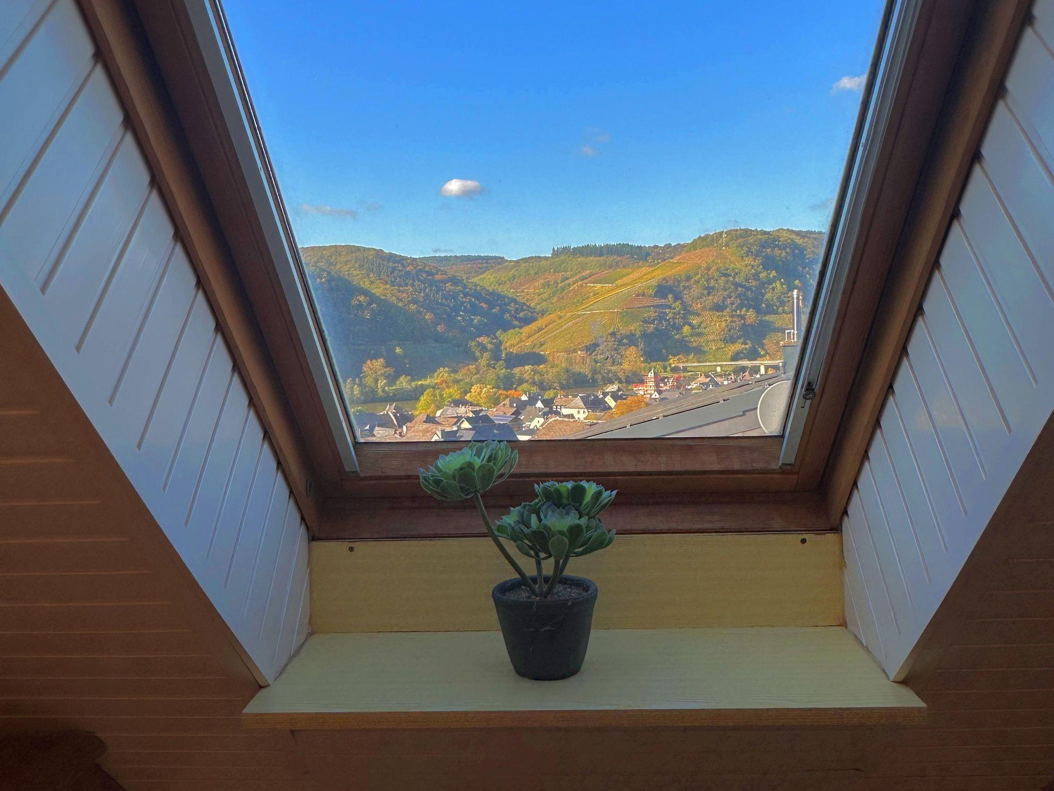 Die Ferienwohnung NR 12 Traumblick befindet sich im Dachgeschoss (72 qm) mit herrlichem Panoramablick zur Mosel und den Ort