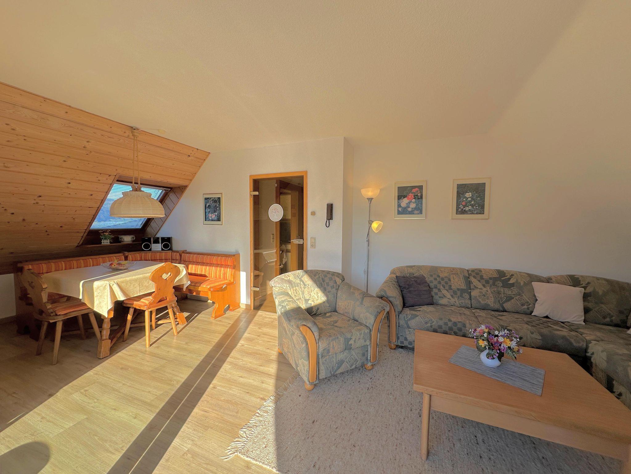 Das Wohnzimmer- eine Wohlfühloase - dank der bodengleichen Fenster und der einzigartigen Außsicht, einer gemütlichen Sitzgruppe, Eßecke, LCD Player, großer Balkon Süd/West, seperate Küche mit Ceran-Kochfeld, Backofen, Kühlschrank, Spülmaschine, Mikrowelle, Toaster, Kaffeemaschine, Eierkocher, Wasserkocher, 1 Doppelzimmer, 1 Einzelzimmer. Das Bad verfügt über eine Dusche/WC und Föhn.