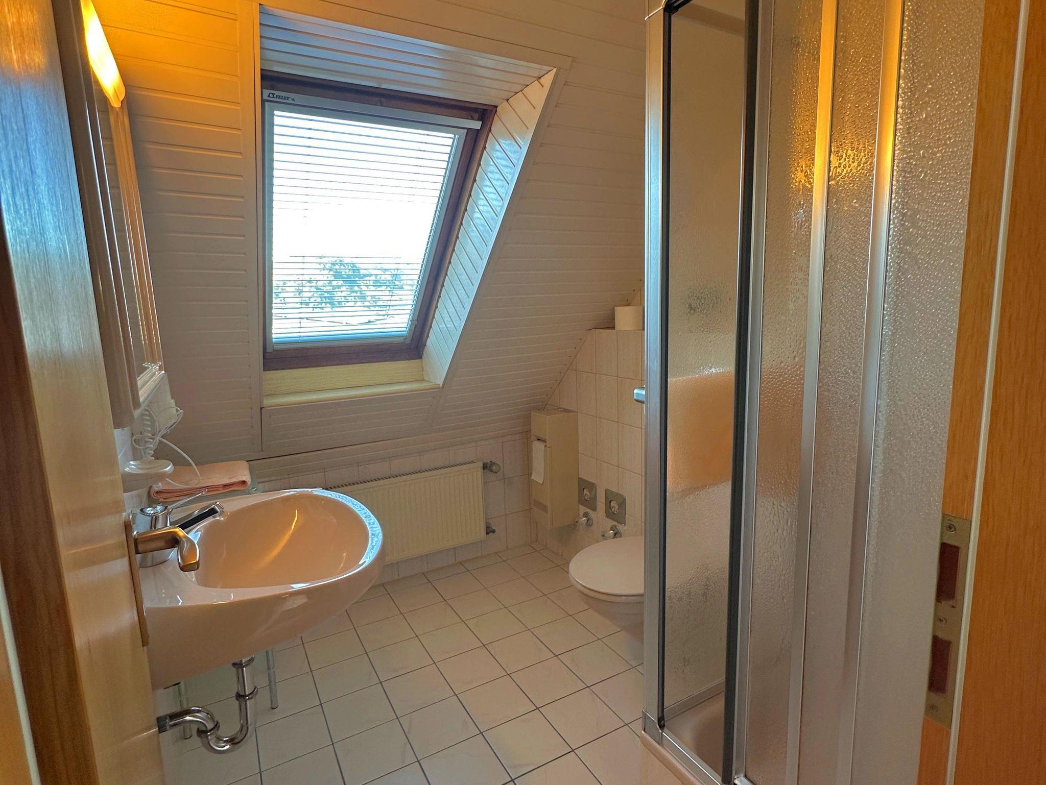 Das Bad verfügt über ein Tageslicht Fenster, Dusche, WC, Föhn.