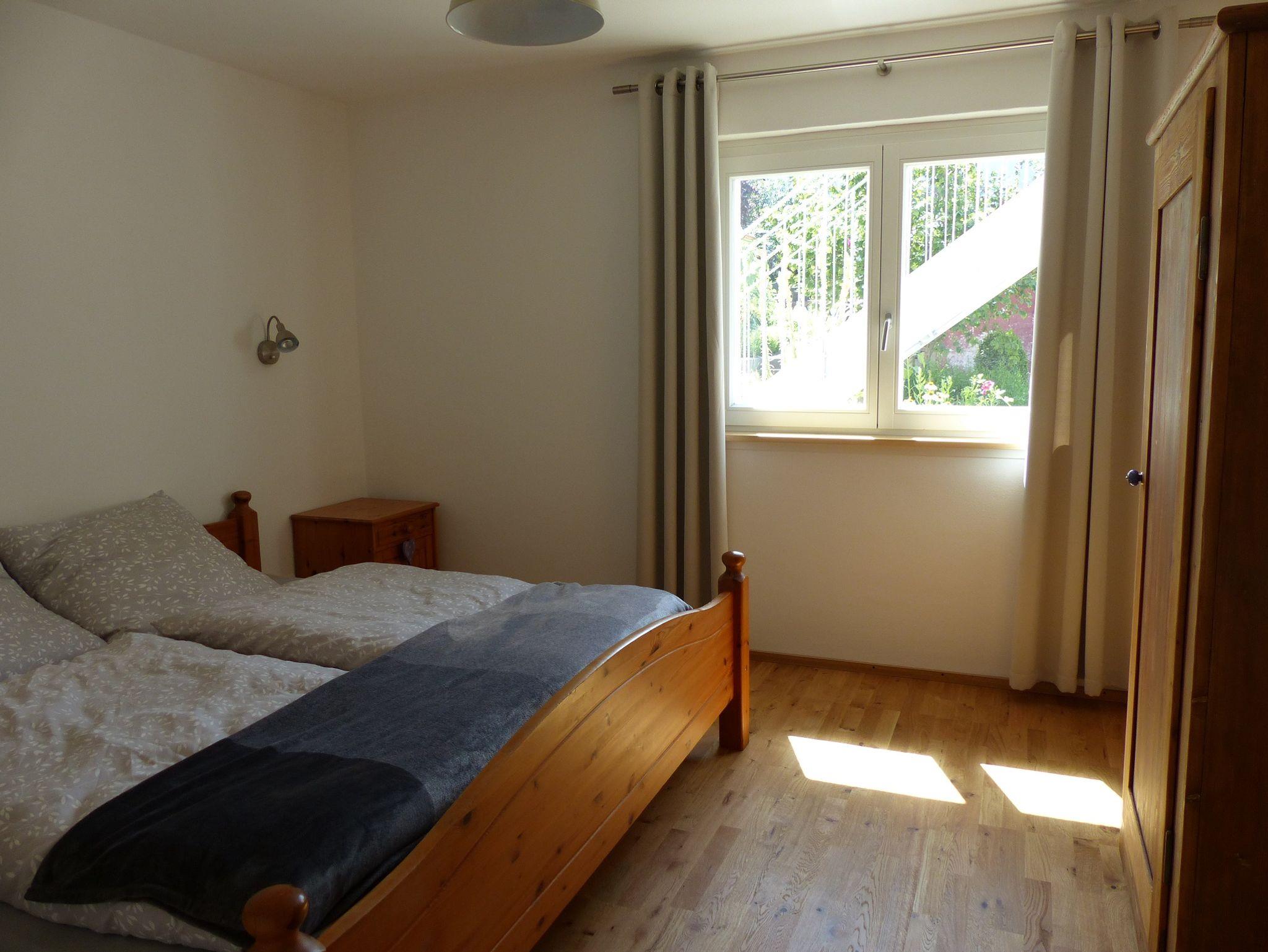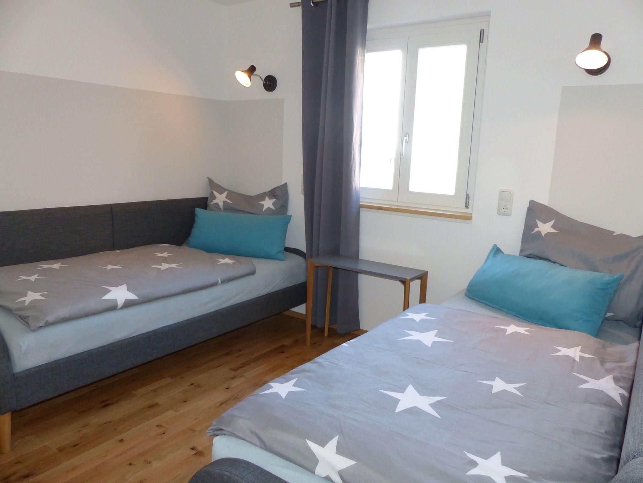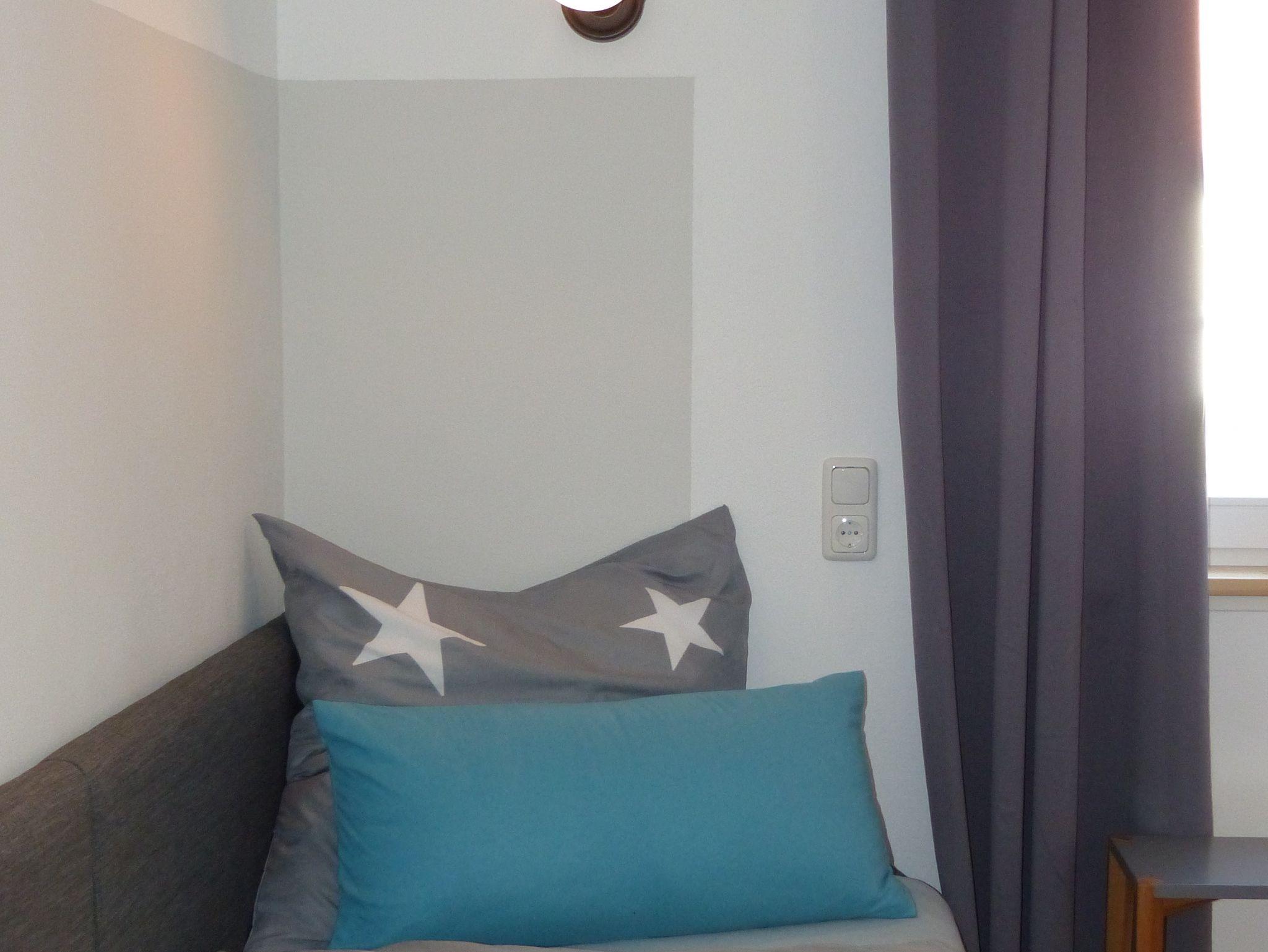 Die Wohnung verfügt über zwei Schlafzimmer, davon eines mit Doppelbett und eines mit zwei Einzelbetten. Bei Bedarf kann auch noch eine weitere Person auf der Schlafcouch im Wohnzimmer Platz finden.