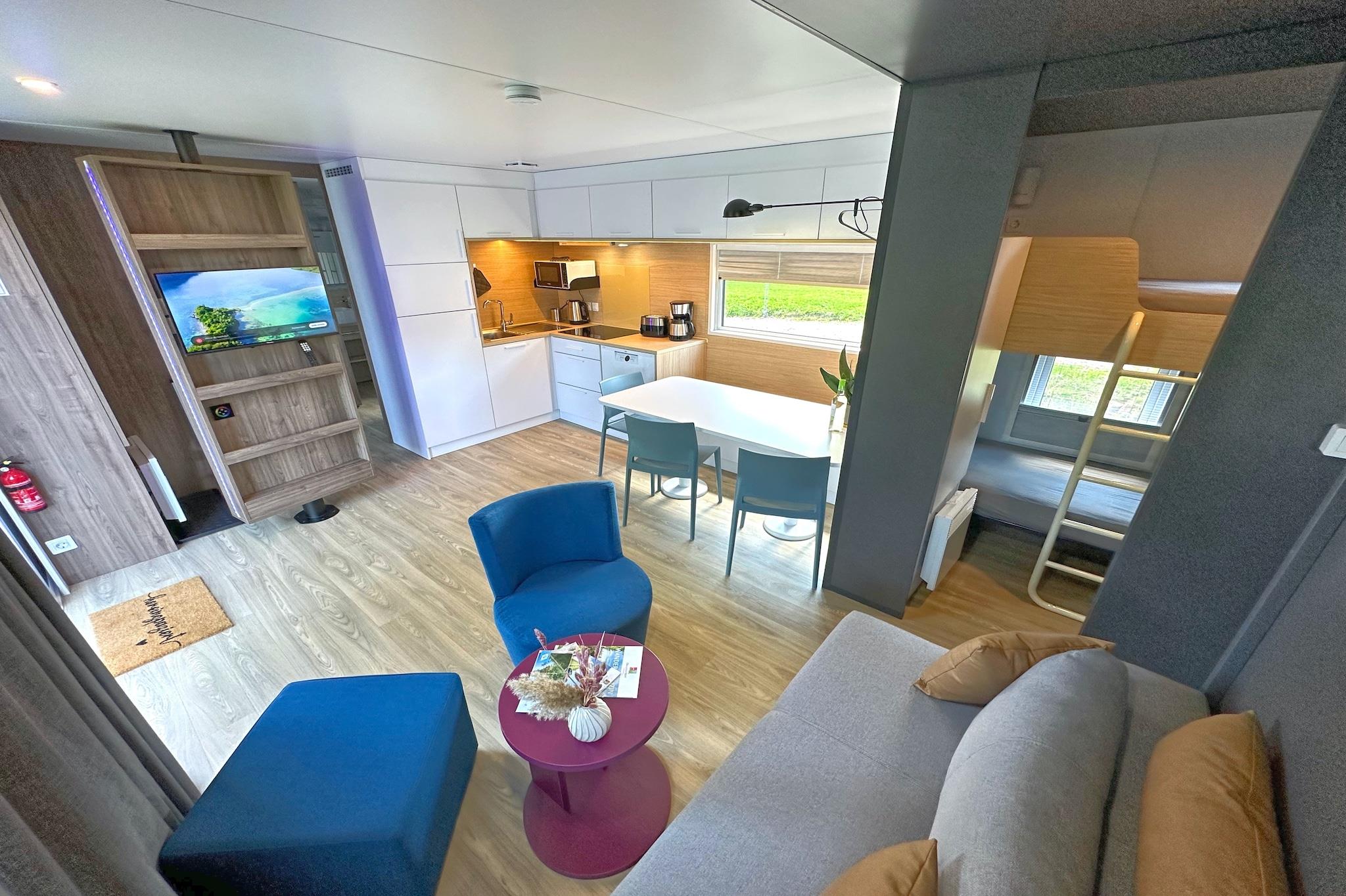 Stueetage: (åbent køkken(elkedel, brødrister, komfur(Komfur med fire kogeplader, induktion), emhætte, kaffemaskine(kaffetragt), mikrobølgeovn, opvaskemaskine , køle-fryseskab), stue / spisestue(enkeltsovesofa, Fjernsyn(fladskærm, parabol, Smart-TV), spisebord(6 personer)), soveværelse(2x enkeltseng(80 x 190 cm)), soveværelse(køjeseng(80 x 190 cm)), Soveværelse med badeværelse(dobbeltseng(160 x 200 cm), bruser, håndvask, toilet), badeværelse(bruser, håndvask, toilet)) sauna(privat, adgang udefra, elvarme, 2 personer), tørretumbler(deles med andre gæster, betalt), hottub(opvarmet med brænde), vaskemaskine(deles med andre gæster, betalt), varme(elektrisk), terrasse(privat), have(deles med andre gæster, 10000 m2), havemøbler, solstole, grill, parkering, barnestol, Solcreme, Volleyballbane, Ladestation til el-biler