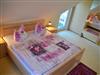 Im Eingangsbereich gibt es eine große Garderobenbereich von dem ab führt eine Treppe nach oben zu zwei getrennten Schlafräumen. Der Eltern-Schlafraum hat ein Doppelbett, eine Couch und einen Balkon. Der zweite Schlafraum hat drei Einzelbetten und einen begehbaren Kleiderschrank. Im Obergeschoß befindet sich außerdem noch das Badezimmer mit Dusche und WC.