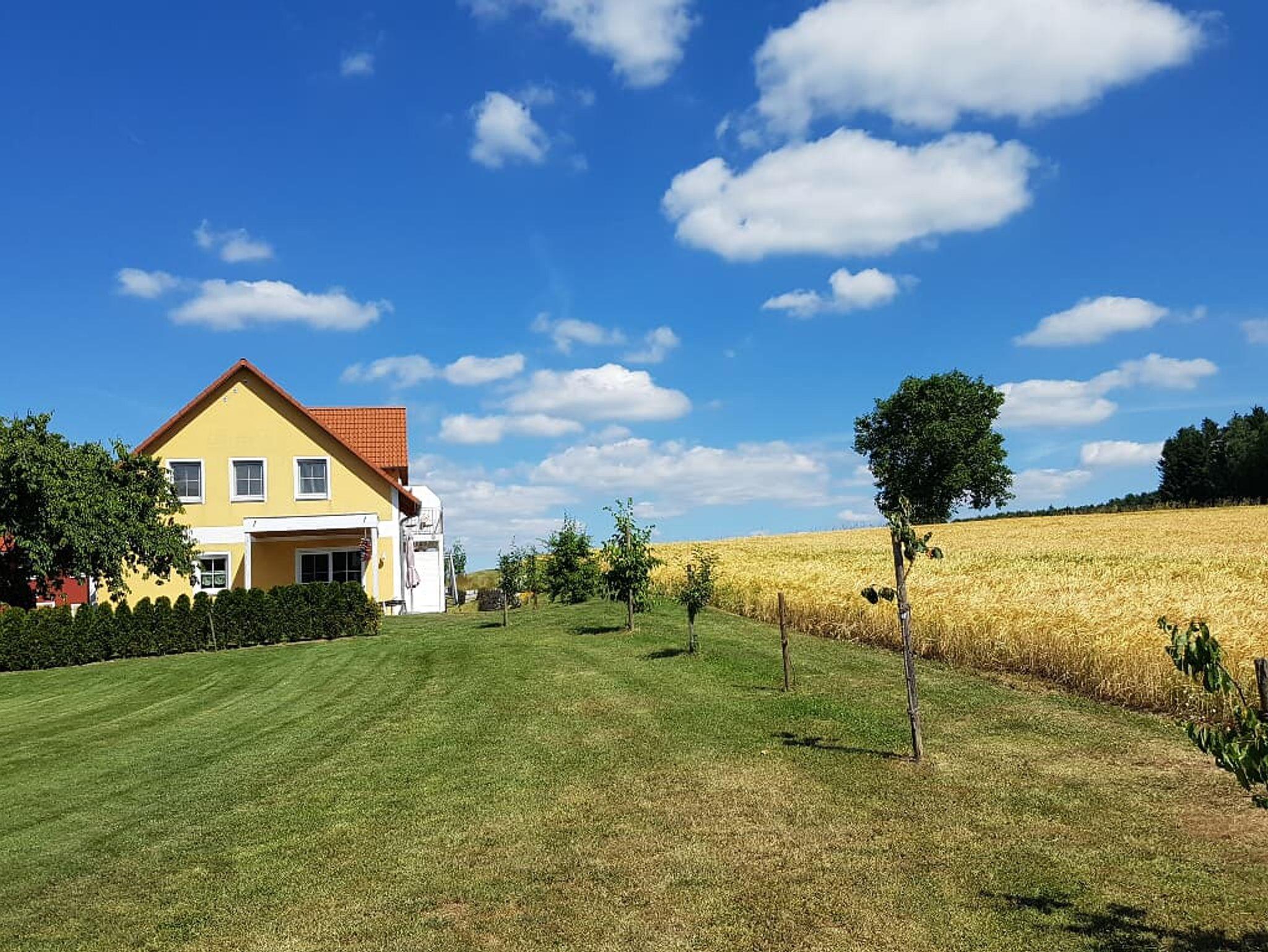 Die eigene Terrasse vor dem Ferienhaus, bietet Blick über Wiesen und Felder zum angrenzenden Wald.
