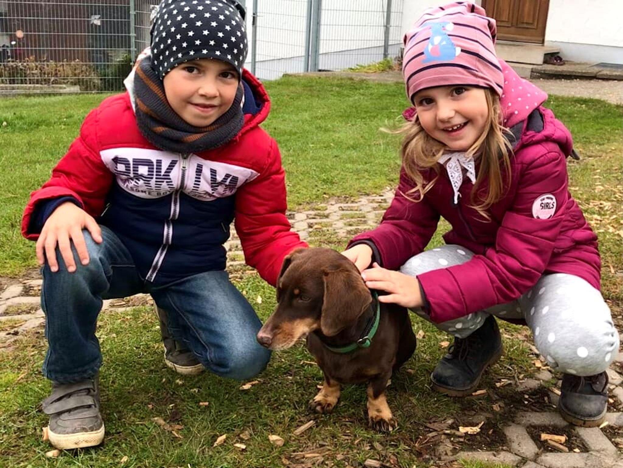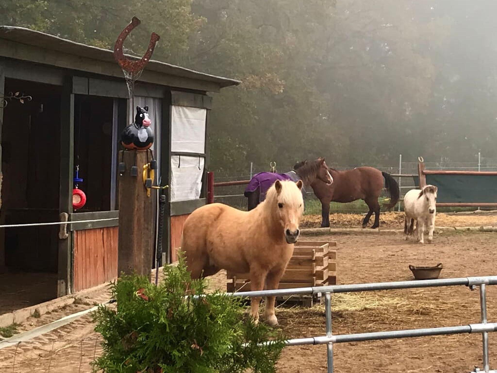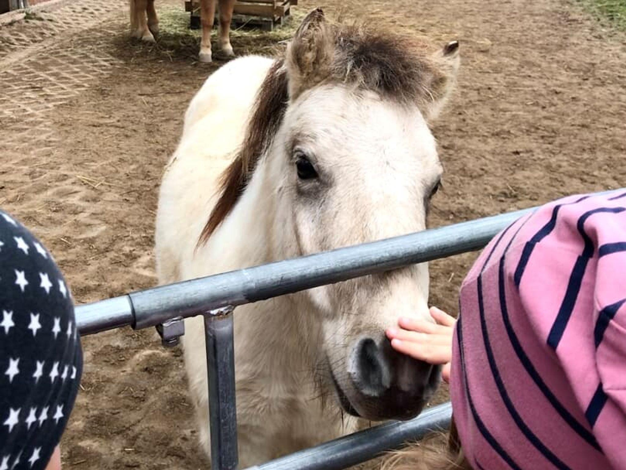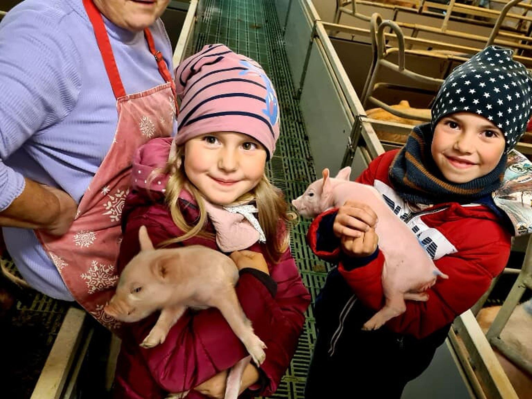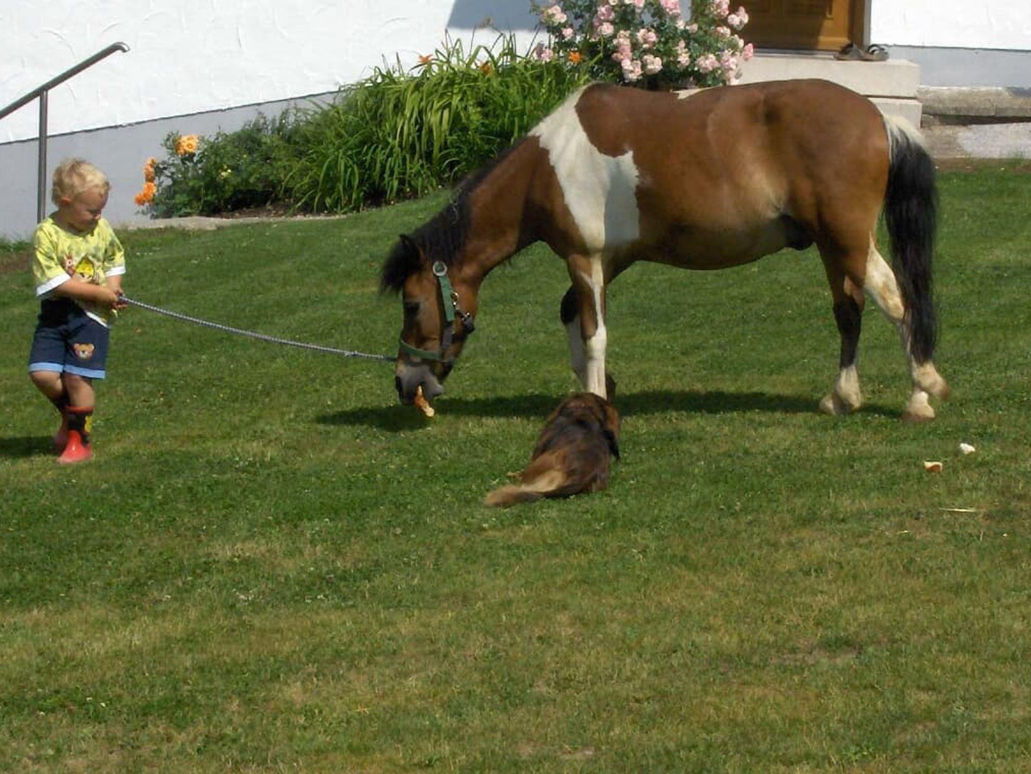 Tiere am Hof: Pony, Hund, Katzen, Ferkel.