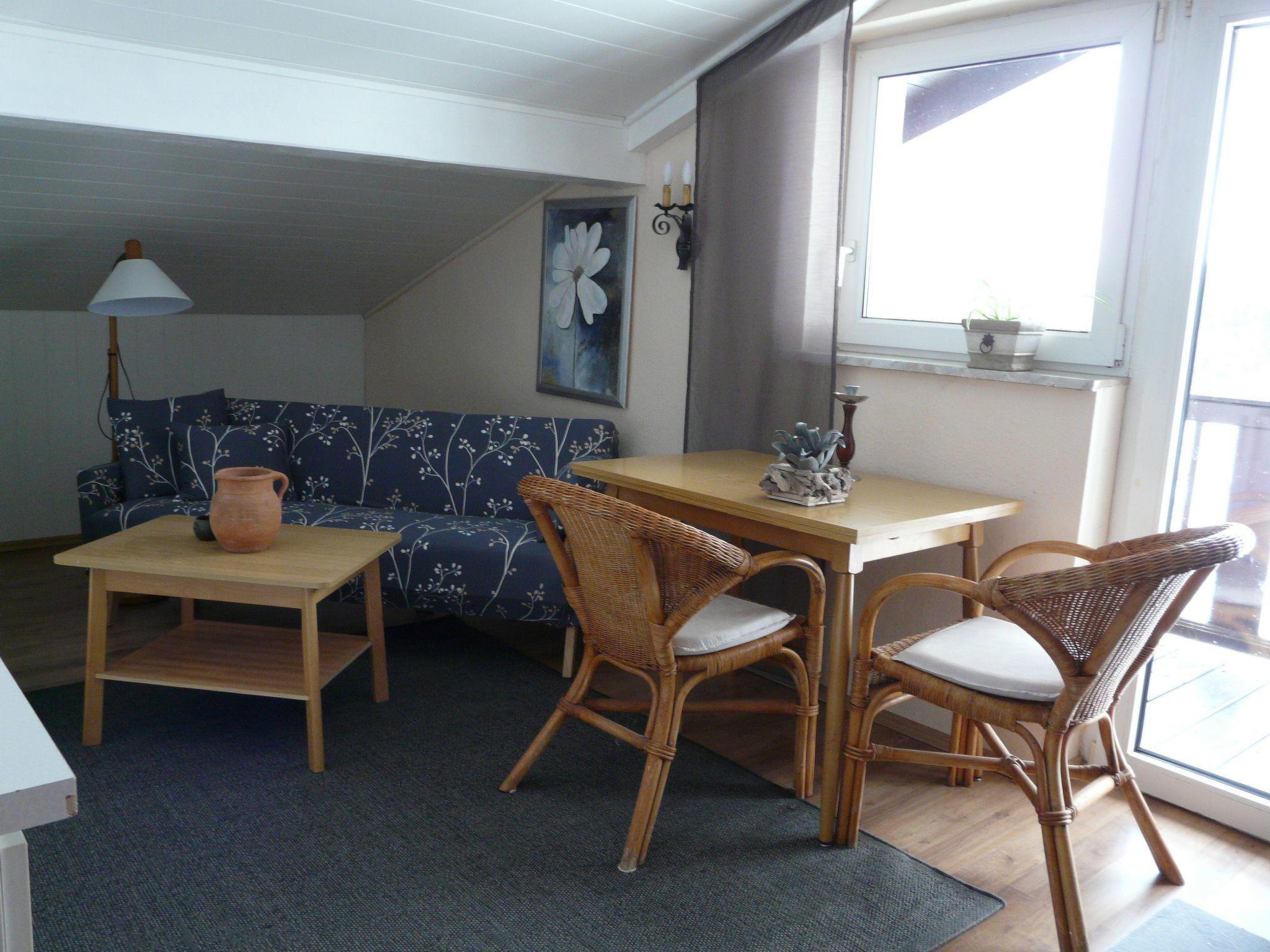 It is a holiday flat in the attic. There is one bedroom with a double bed. There is a bathroom with toilet, washbasin and shower. The living-cooking area is separate with a small fitted kitchen, dining table and sofa as well as 2 armchairs for watching TV. There is also a balcony with a marvellous view of Austria and, weather permitting, the Alps.