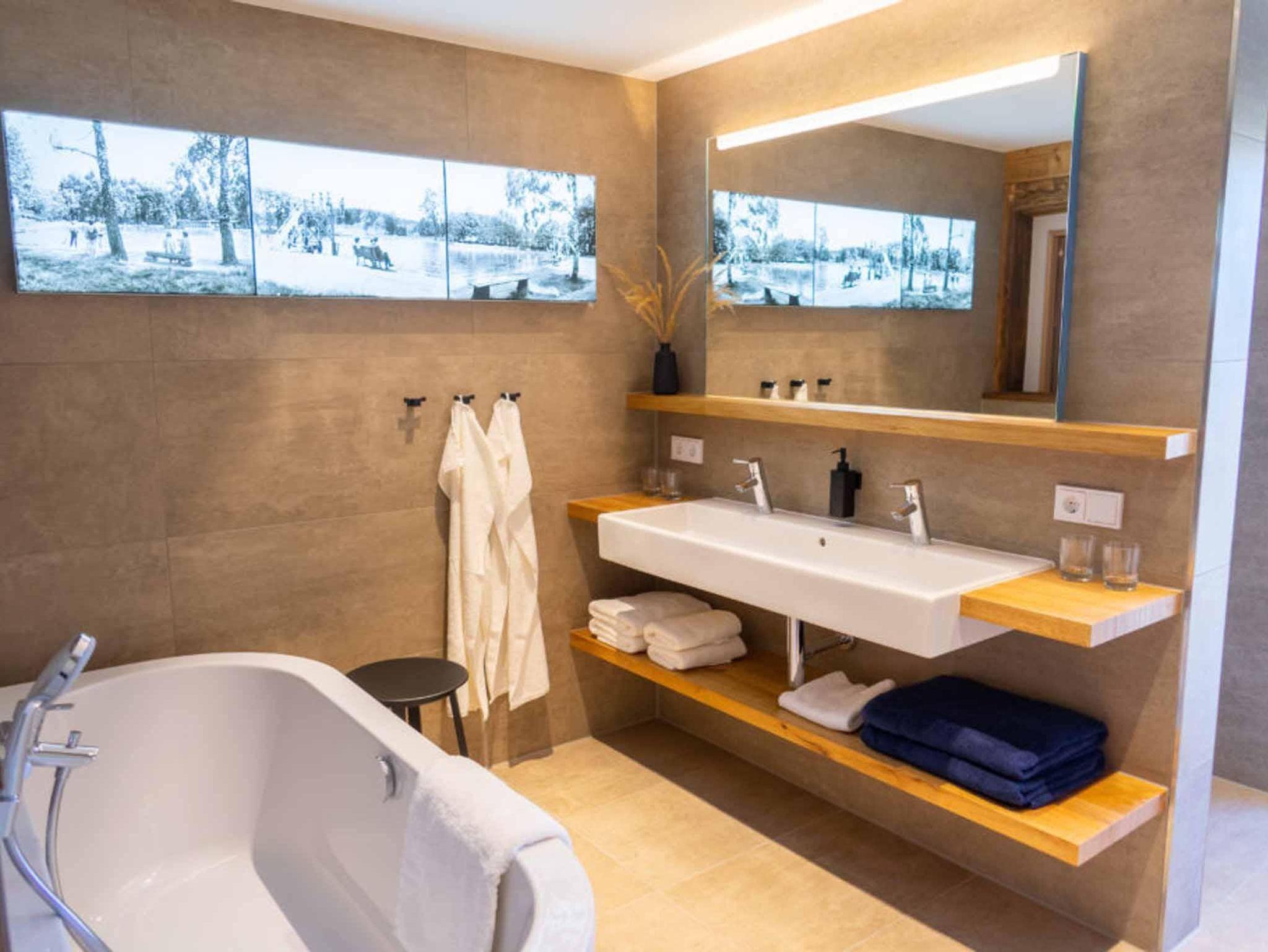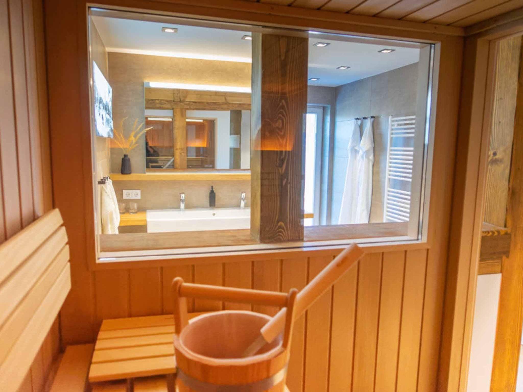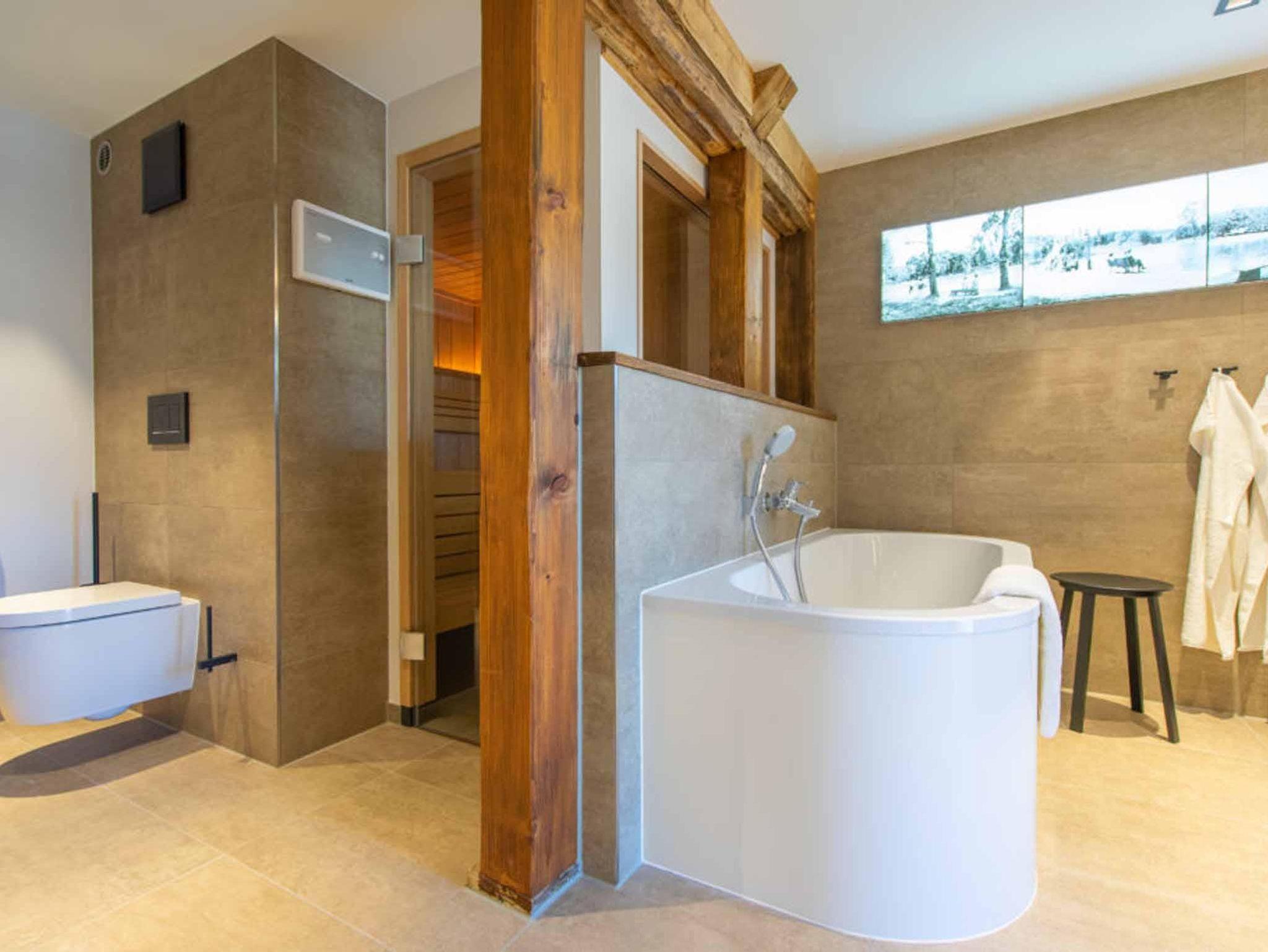 Ein großzügiges Wellnessbad mit Dusche, Badewanne und privater Sauna sorgt für Entschleunigung vom Alltag. Von der kleinen Loggia aus führt die Außentreppe direkt in den weitläufigen Garten mit idyllischen Sitzbereichen und Rückzugsmöglichkeiten unter alten Obstbäumen.