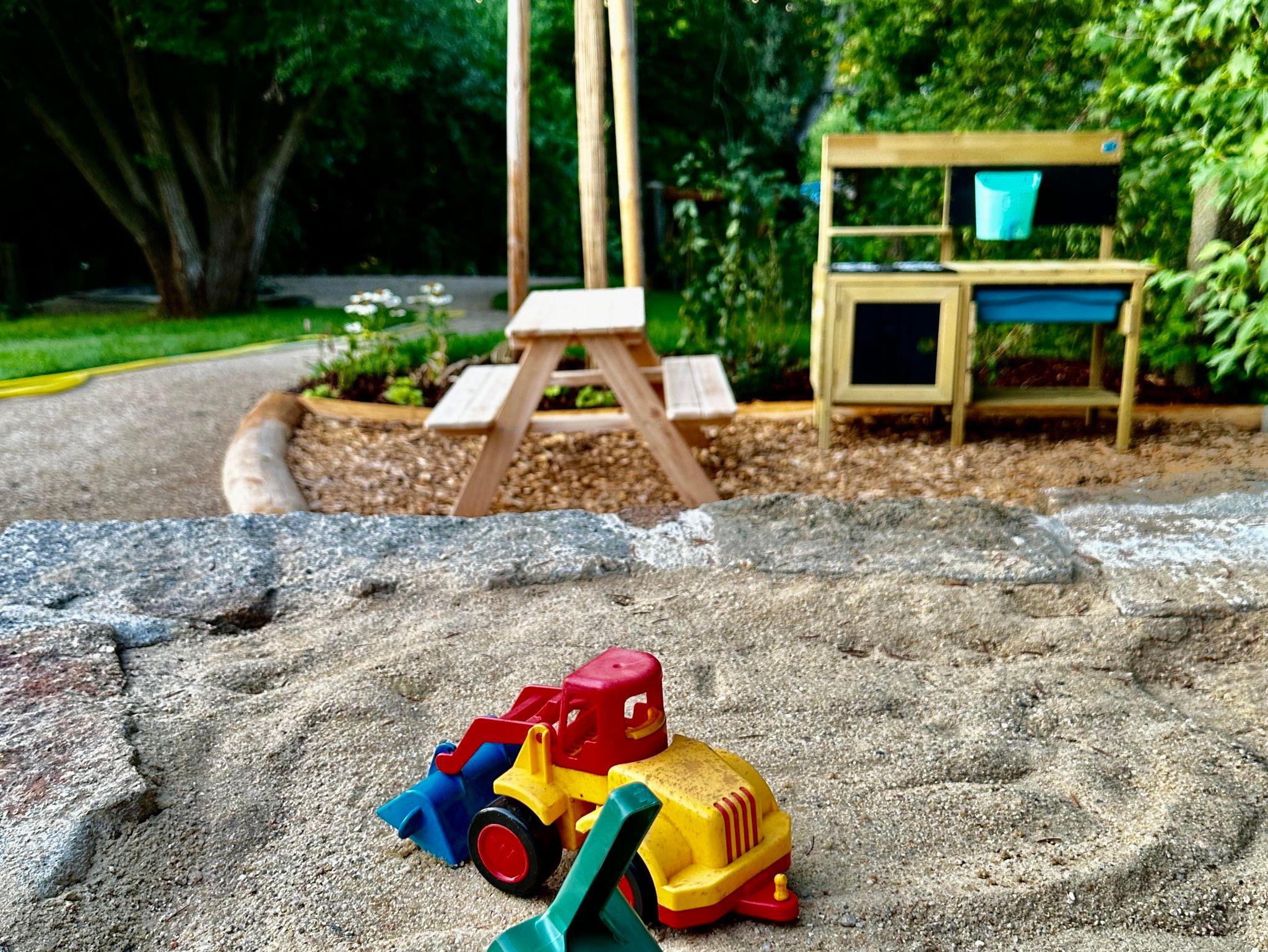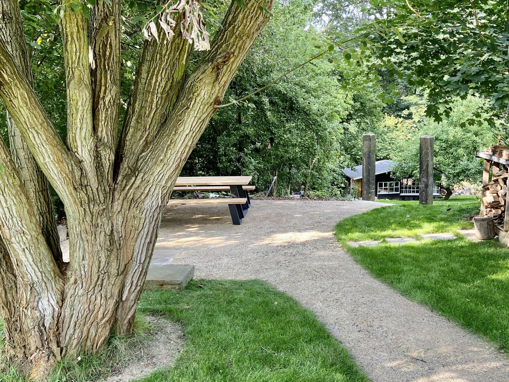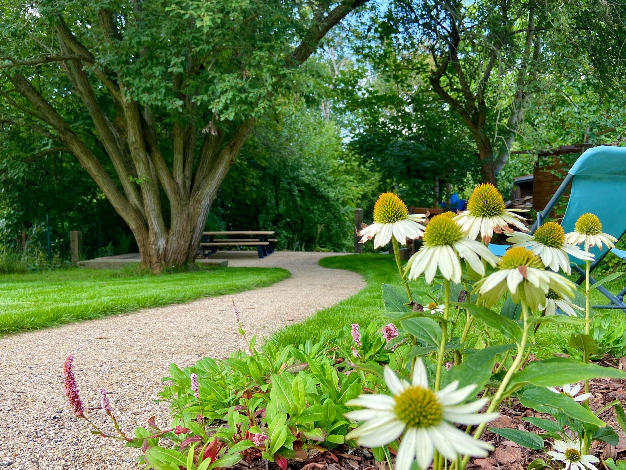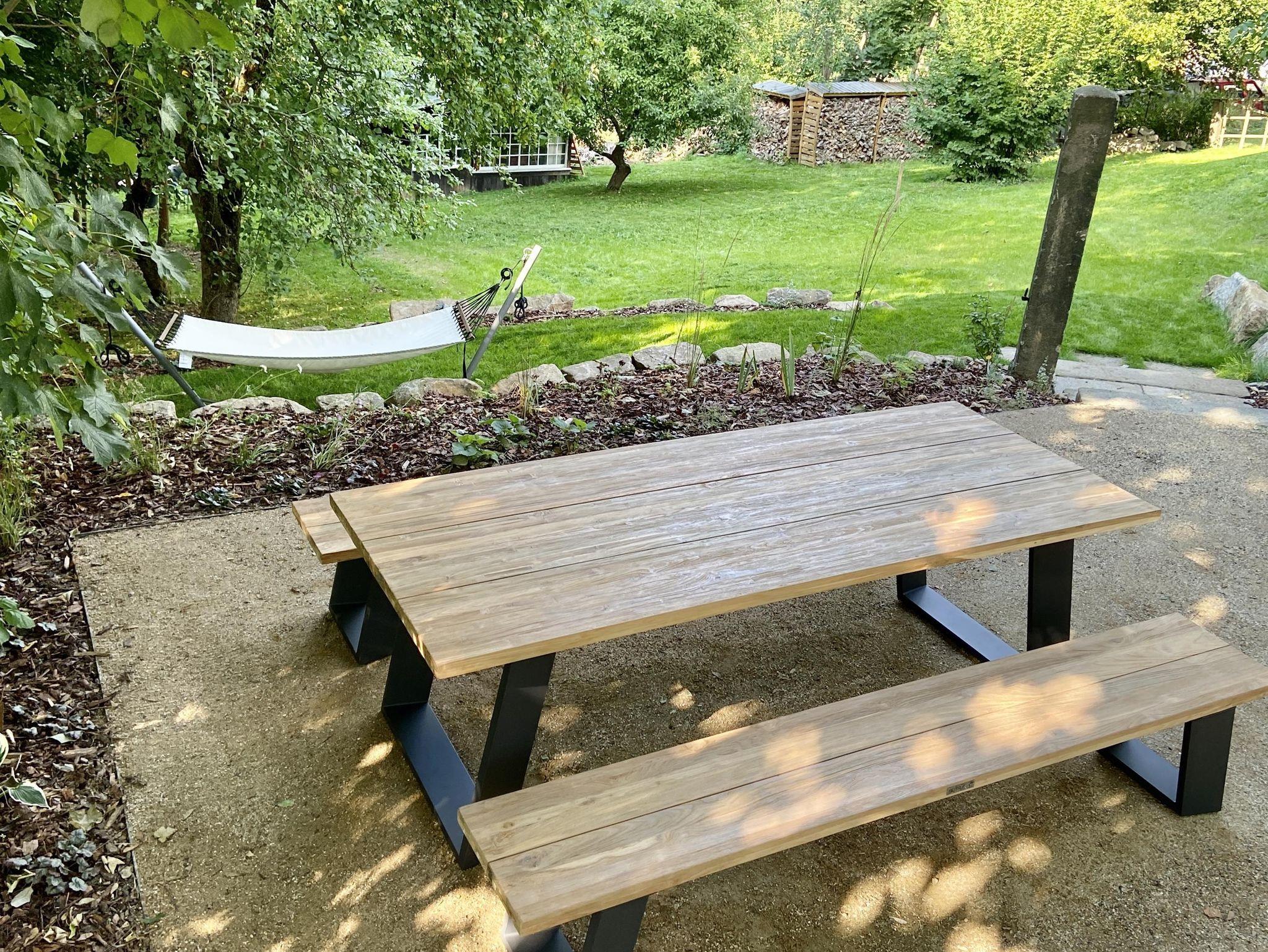 Ein großzügiges Wellnessbad mit Dusche, Badewanne und privater Sauna sorgt für Entschleunigung vom Alltag. Von der kleinen Loggia aus führt die Außentreppe direkt in den weitläufigen Garten mit idyllischen Sitzbereichen und Rückzugsmöglichkeiten unter alten Obstbäumen.