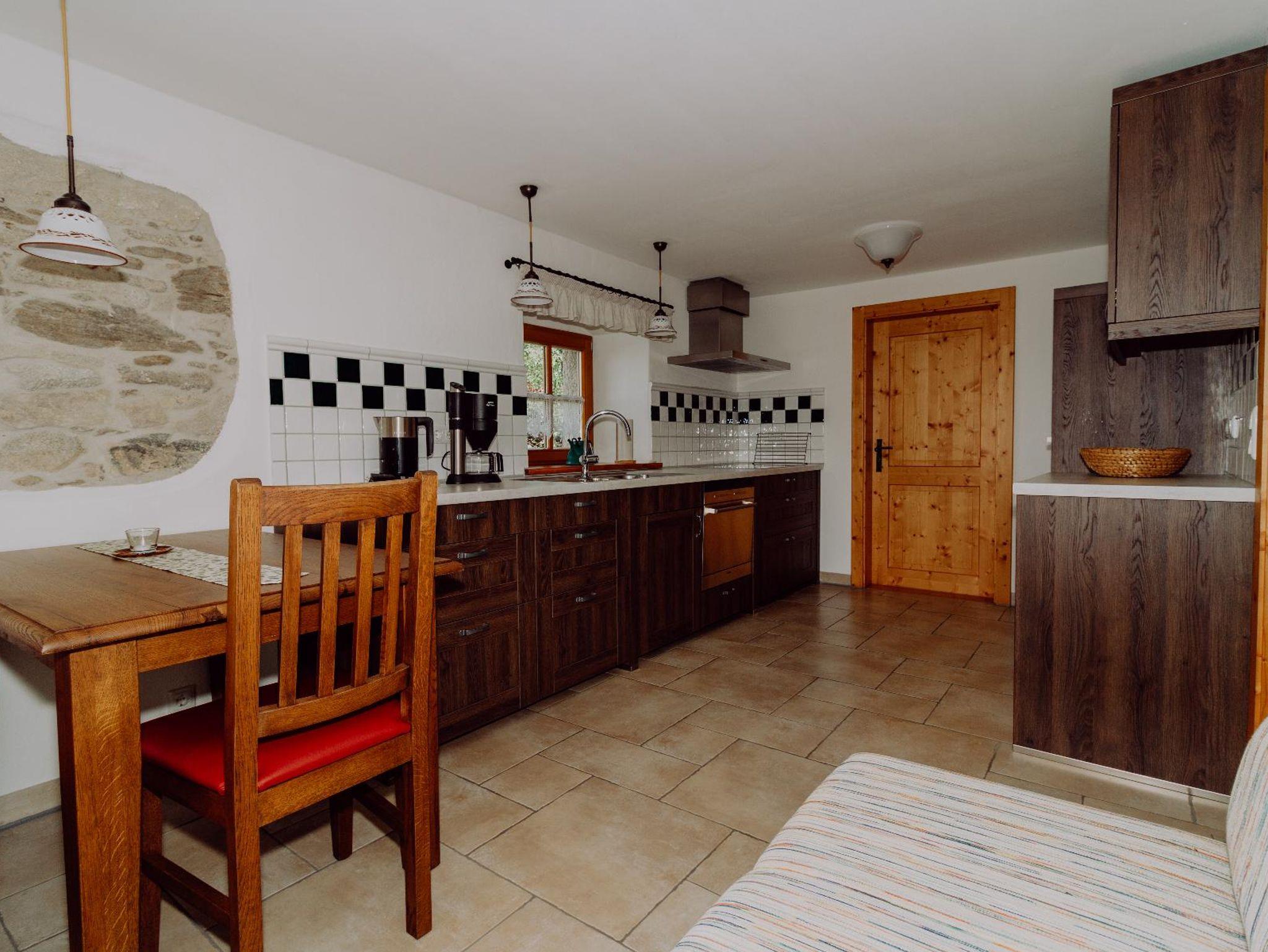 Urige Bauernstube mit Kachelofen und Eckbank, sehr gut ausgestattete Küche, Galerie mit Couch, exlusives Bad mit Großdusche, Terrasse, Garage.