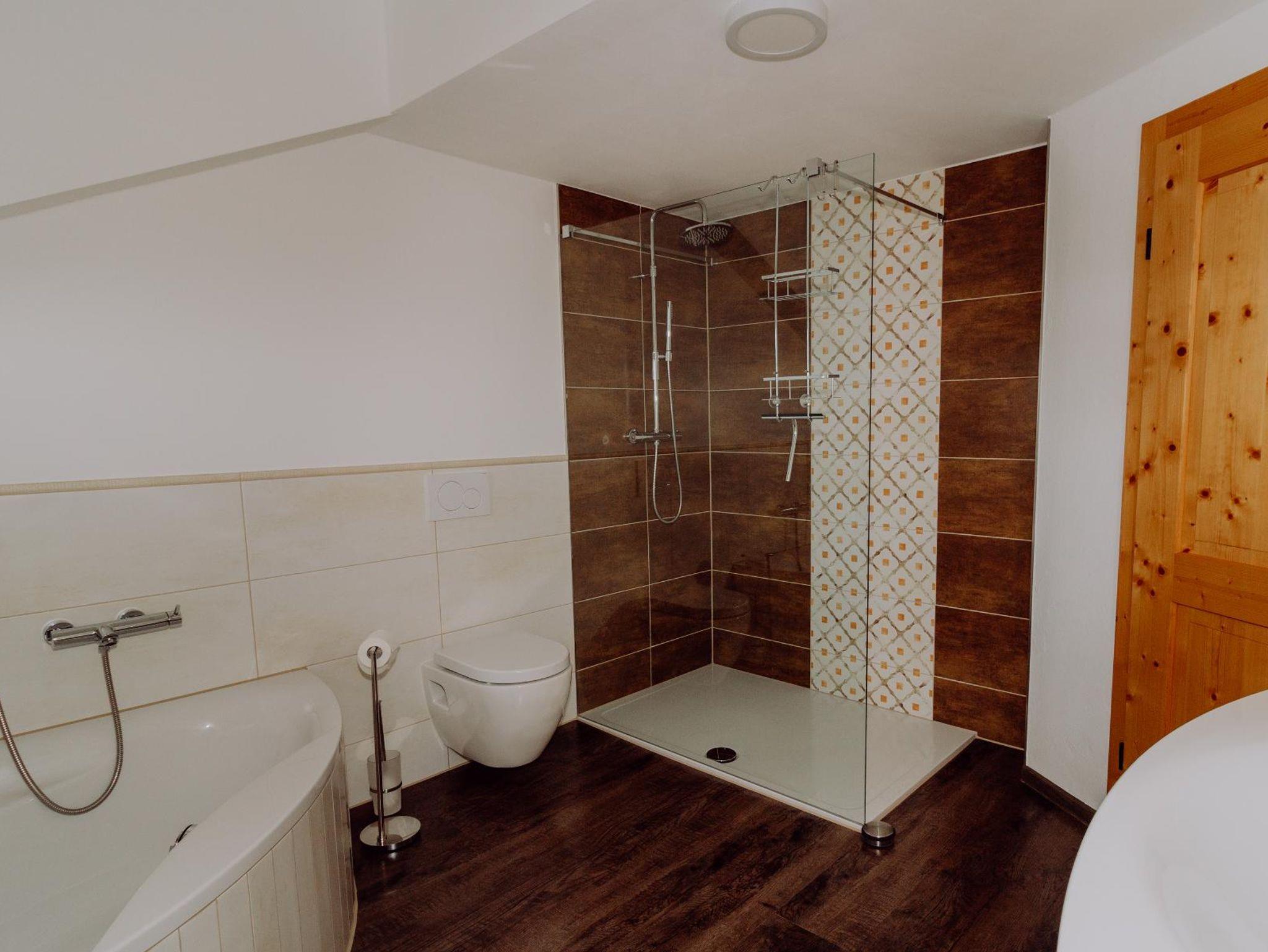 Sogar im Woschhaus, das im 1. Stock liegt, genießt man einen traum-haften Blick auf die Bayerwaldberge. Ob beim Baden in der Eckbade- wanne oder in der Großdusche – die Aussicht ist herrlich. Neben einem großen Waschtisch und WC stehen zudem Handtücher und Badetücher bereit. Im Erdgeschoss befindet sich noch ein extra WC.