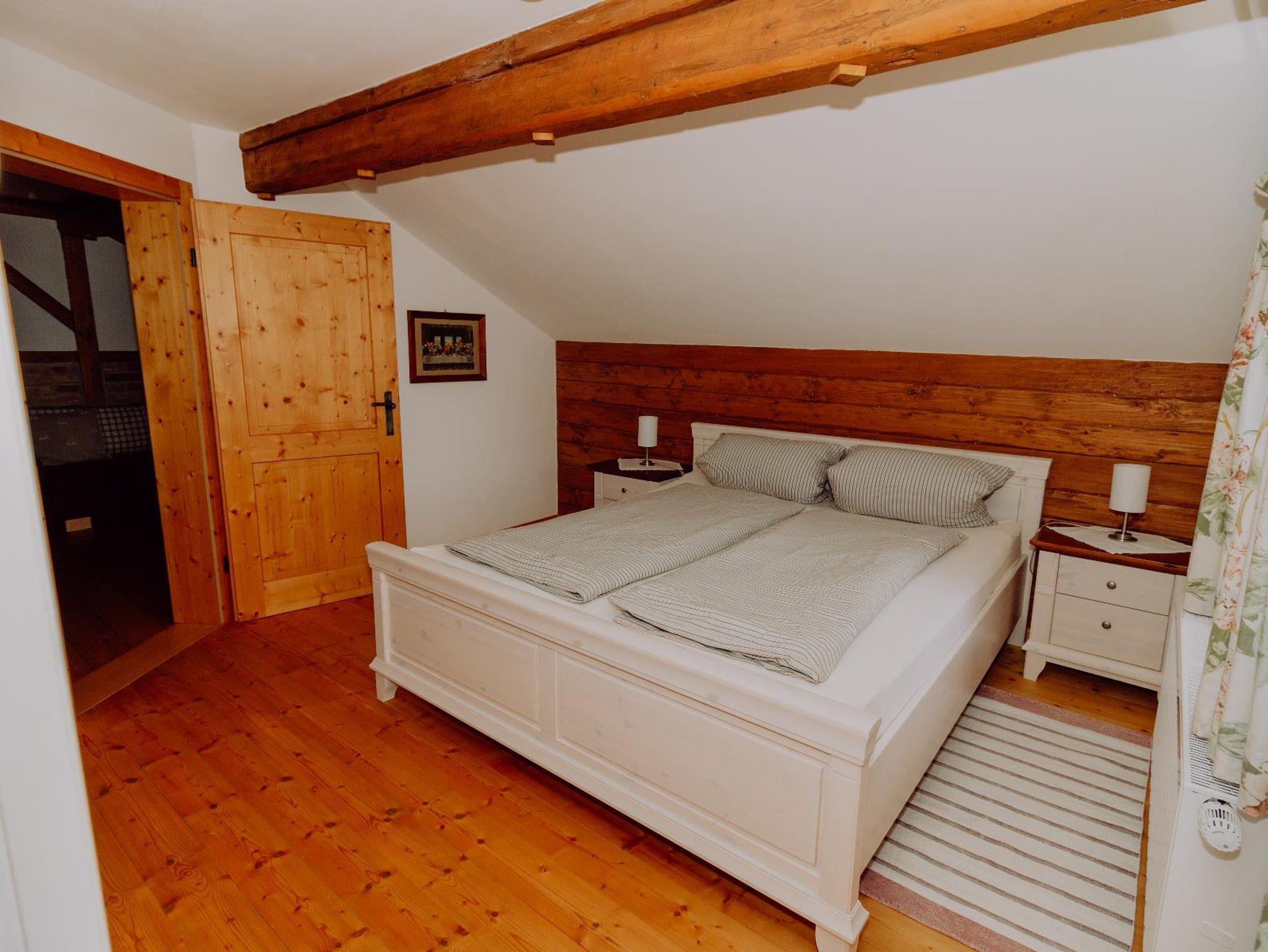 Wohlig und kuschelig wird´s in der Kammer im 1. Stock. Natürliche Materialien wie Holzboden, Massivholzbett und Baumwollwäsche fördern einen erholsamen Schlaf. Das Doppelbett ist 1,80 m breit und hat eine Länge von 2,10 m und verfügt über Allergikerbetten.